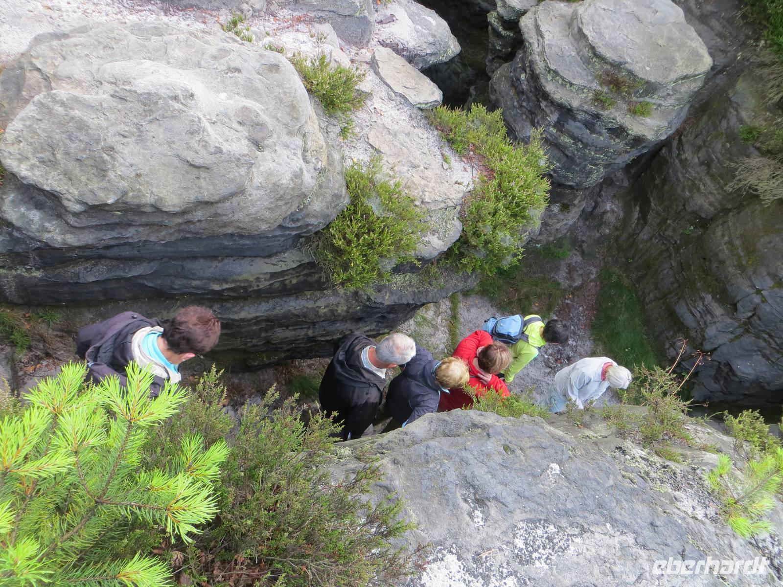 Sechzehn Gäste starteten ab Dresden recht früh am Morgen, um bereits nach einer Fahrstunde einen Morgenspaziergang in den Tisaer Wänden zu unternehmen. Die Tisaer Wände stehen in ihrer Mannigfaltigkeit von Felsentürmen, Felswänden, Aussichten, Felsverformungen aus der Erosion, schmalen GGassen durch die Steine stellvertretend für das gesamte Elbsandsteingebirge. Auf drei Kilometer Rundweg kann man so einen guten Eindruck über Sandsteingebirge in Böhmen erhalten. Am Hang gewährten uns Tafeln einen historischen Rückblick in die Entwicklung des Ortes und seiner nicht immer komplikationslosen deutsch-tschechischen Beziehungen. Wir waren so zeitig gestartet, dass Zeit blieb für einen Aufstieg über die „Lange Fahrt" zum Deciner Schloss. Dies war natürlich eien Chance, um an der wechselvollen Geschichte des Deciner Schhlosses Aspekte der Entwicklung Böhmens zu erklären. Nun ging es elbaufwärts mit dem Bus, an Usti und dem Schreckenstein vorbei, nach Lovosice.Im kleinen Weinort Male Zernosecky starteten wir unsere Wanderung durch das Oparno-Tal und dann im steilen Aufstieg auf den 570 Meter hohen Lovos. Es waren gut 40 Kilometer Fernsicht, wenn auch etwas trüb, aber das Böhmische Mittelgebirge mit seinen Vulkangipfeln gut zu erklären. Auf dem Gipfel dann auch die Möglichkeit, Utopenec, die saure Wurst zum Bier, kennenzulernen. Gegenüber erblicken wir bereits Leitmeritz, den Ort unserer Übernachtung, und in der Ferne den Rip, Gipfel des kommenden Tages.