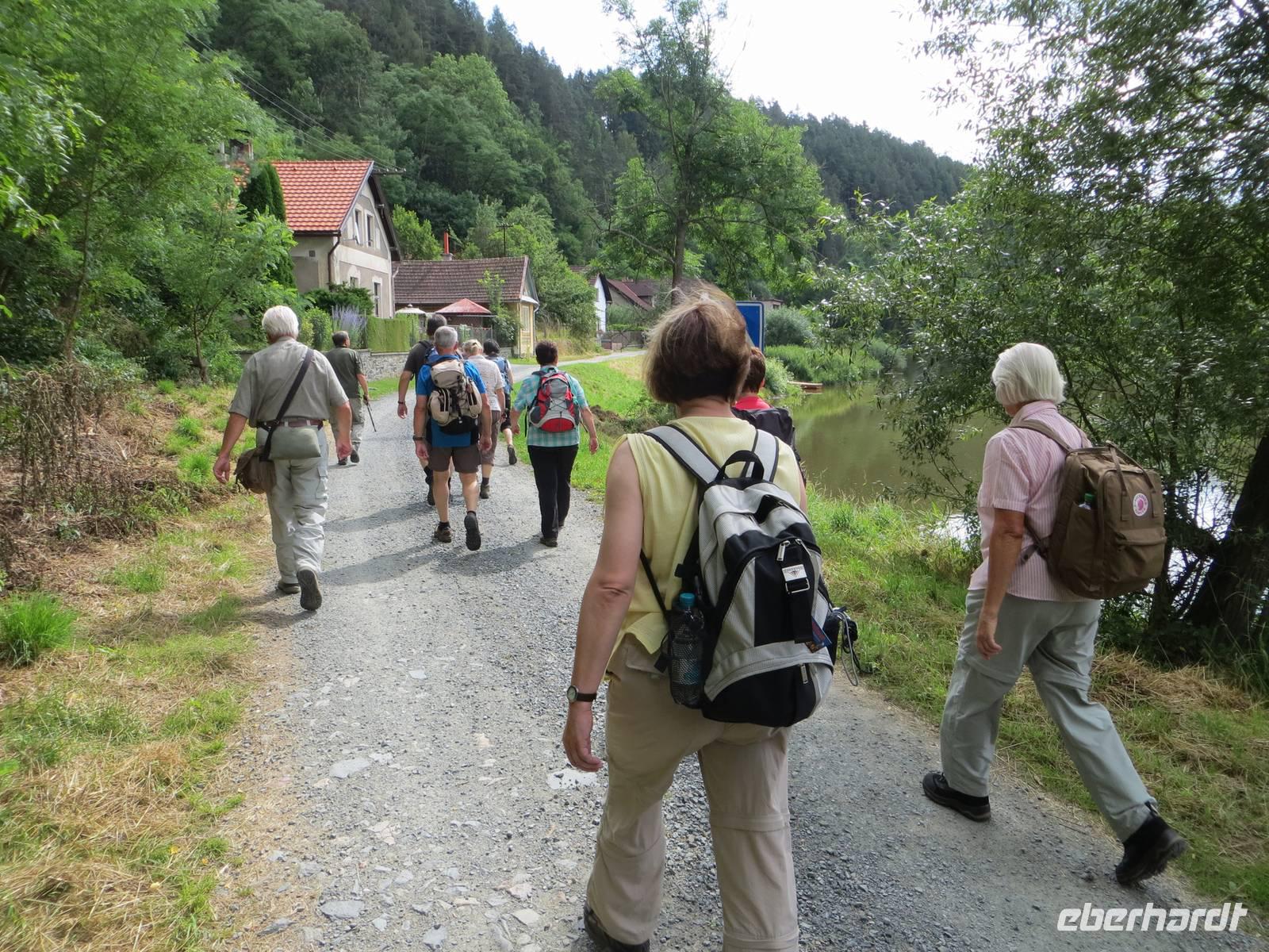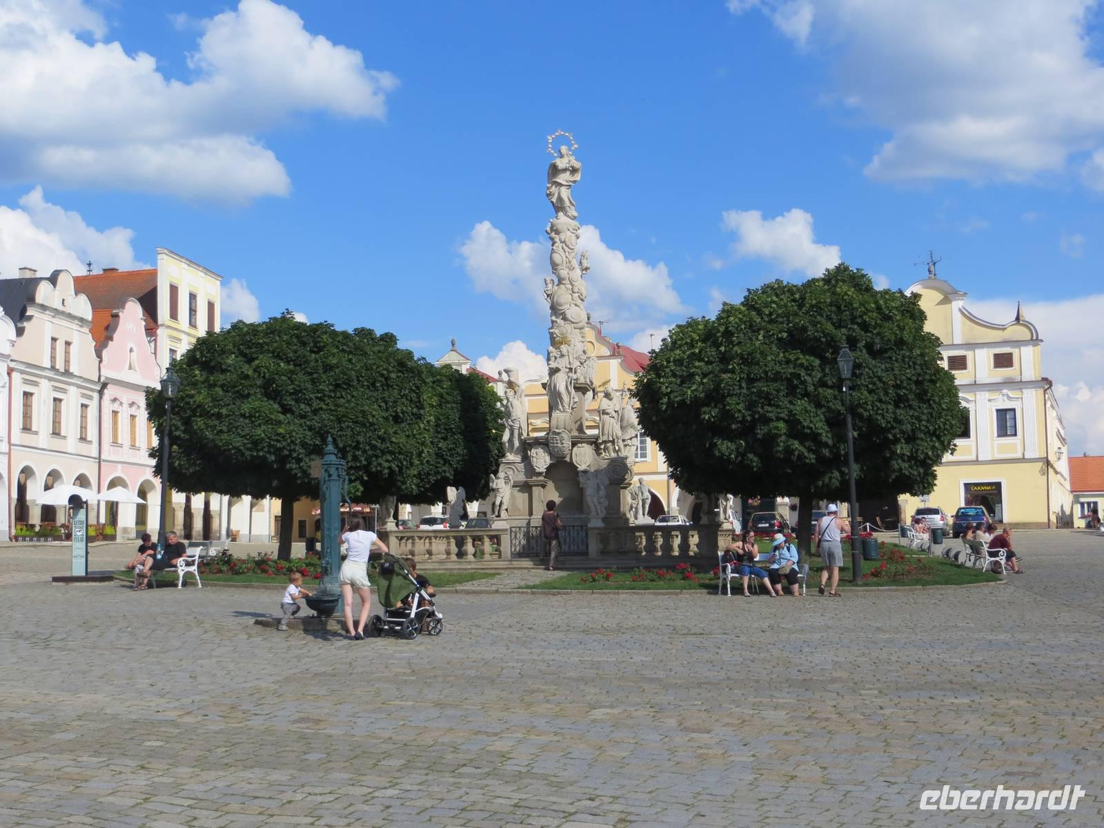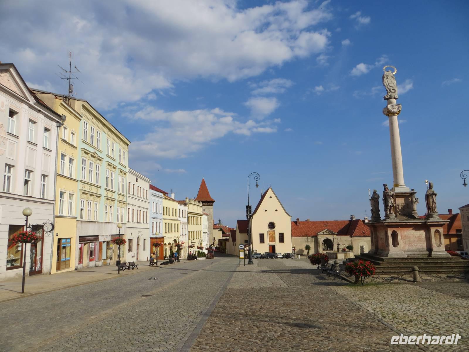 Durch dieses ging es dann in südöstlicher Richtung leicht abwärts. Gelbe oder rote Markierung? - auch wenn gelb kurzzeitig eine dörfliche Asphaltstraße nutzt, bleibt es der schönere und kürzere Weg. Durch Wiesen und an kleinen Teichen vorbei, auf halbem Weg die Burg Rostejn hinter uns und Telc vor uns sehend, erreichten wir den Marktplatz von Telc - Unesco Weltkulturerbe für eine einzigartige zusammenhängende Gebäudesubstanz von marktumgebenden Häusern aus Renaissance und Barock. Im nahen Hotel Anton, einst barocker Gutshof, später Fabrik, fanden wir ein gutes Wanderquartier. Am sommerlichen Abend bummelten viele nochmals hinüber zum Markt und zu den beliebten Fotostandorten von den Brückchen über die Teiche um die Altstadt.