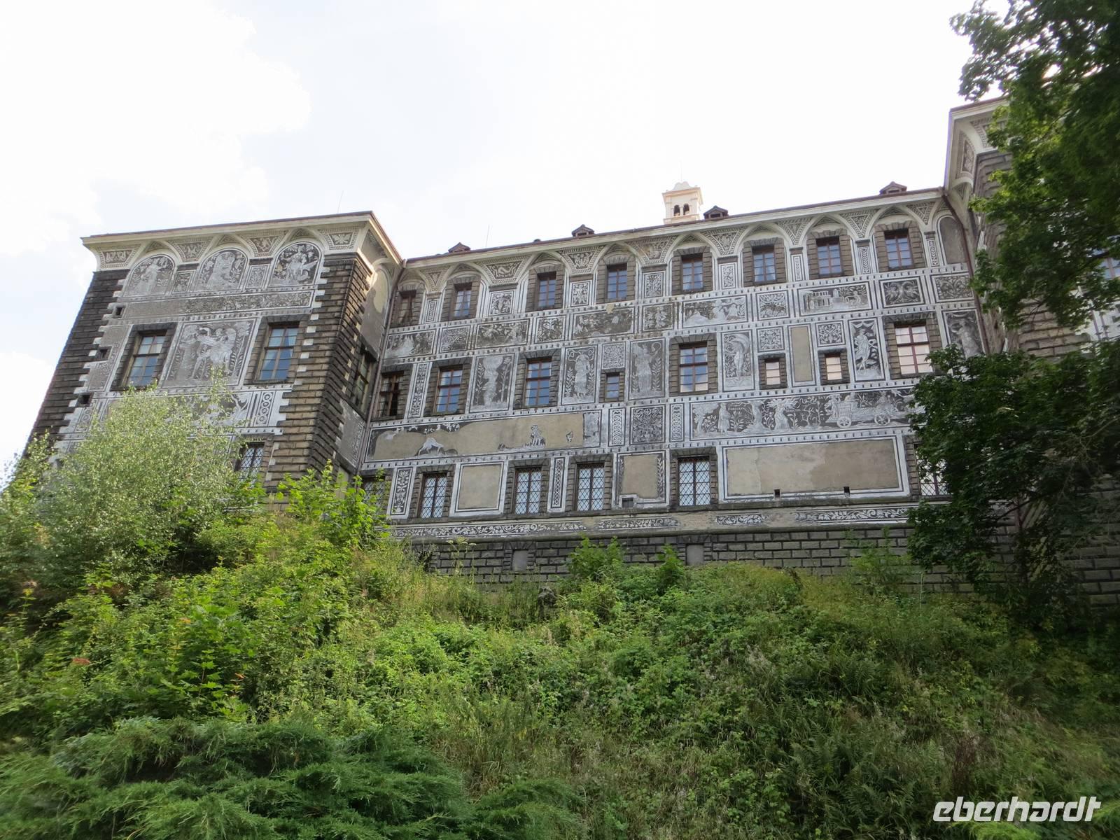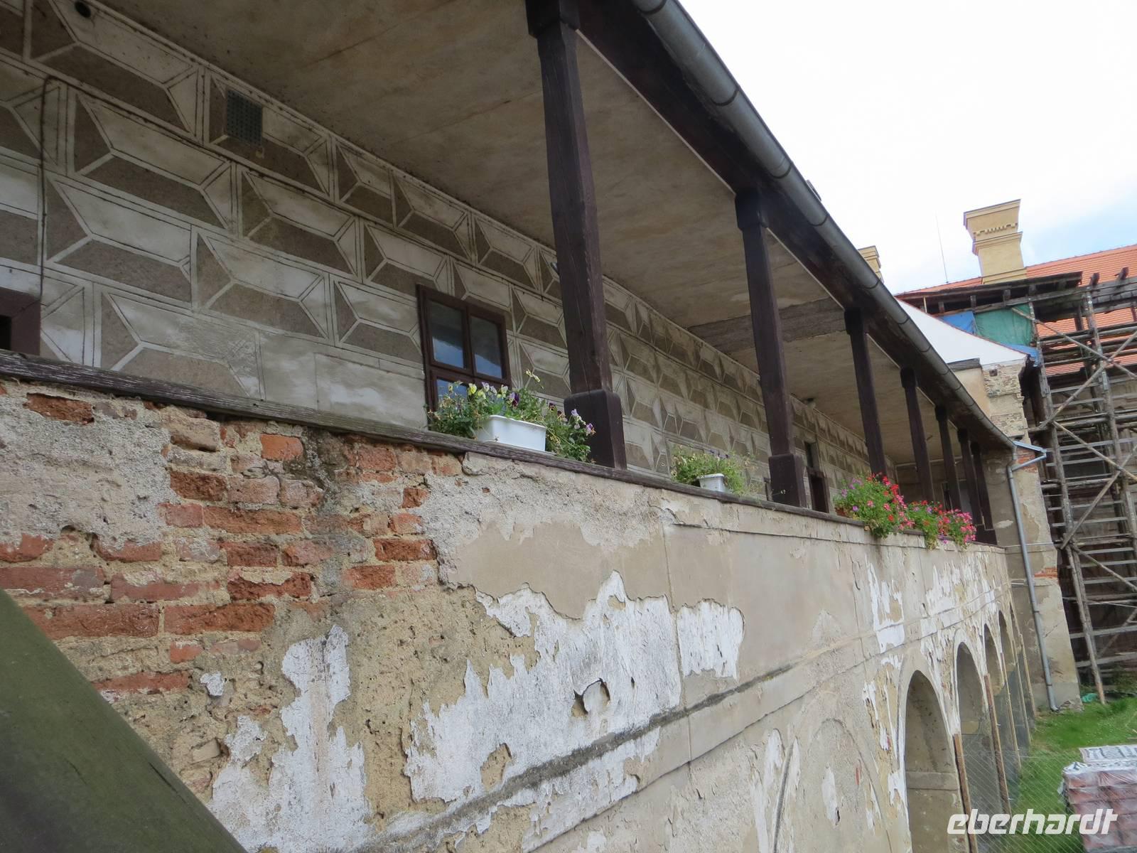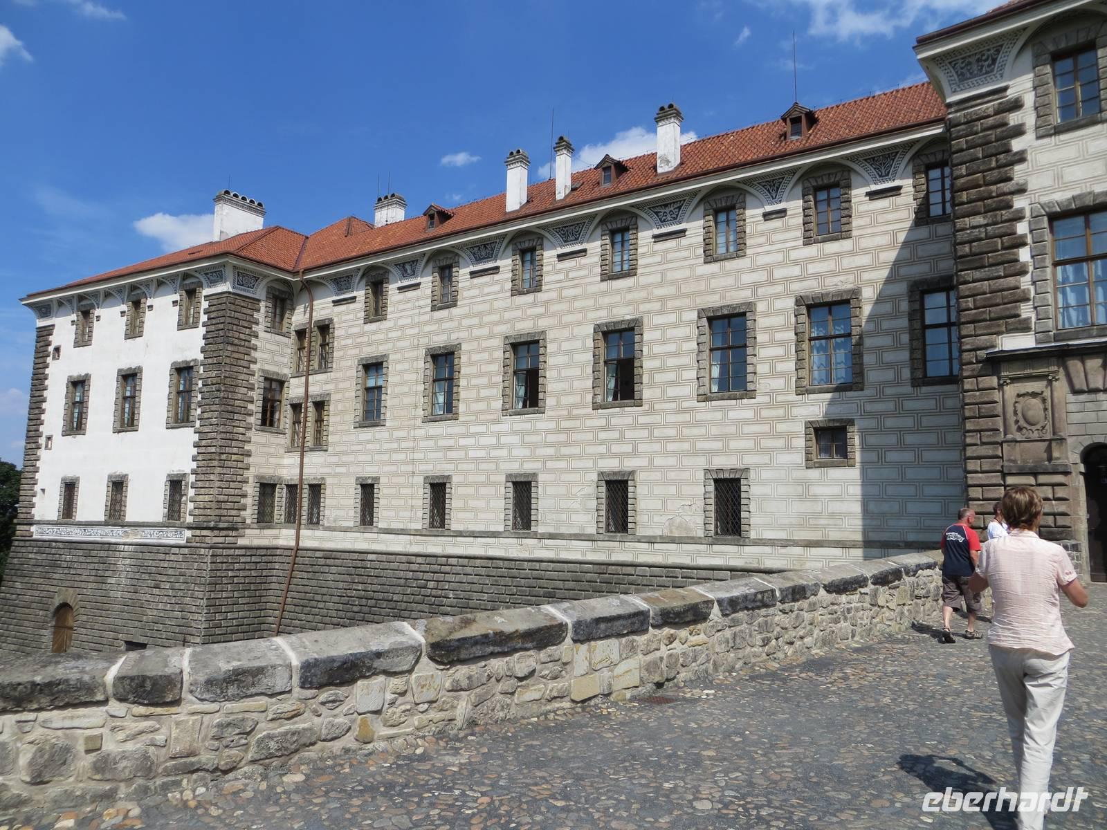 Zu den Klängen von Visegrad, der ältesten Prager Burg, aus Smetanas Zyklus „Mein Vaterland" verließen wir Prag. Im kleinen Ort Ledecko an der Sazava starteten wir unsere zehn Kilometer lange Wanderung. Zunächst entlang der hier eher träge fließenden Sazava stiegen wir auf nach Rataje. Das hiesige Schloss wird gerade rekonstruiert. Am Ortsausgang von Rataje dann noch die Reste der mittelalterlichen Burg Pinkstein bevor der Weg wieder hinab zur Sazava führt. Den mäandernden Flusslauf kreuzten wir durch den Wald und durch Dörfchen voller Hundekläffen. Nach knapp zwei Tagen erblickten wir vor uns die Burg Cesky Sternberk. Nach der Mittagspause nahmen wir den kleinen Anstieg in Angriff und standen bald im Burghof mit Blick nach unten auf die Sazava. Der Rundgang führte uns durch zahlreiche öffentliche Räume der Burg, die auch wieder durch die Sternberks bewohnt wird. Nach der Burgbesichtigung ging es nur wenige Kilometer weiter zum kleinen Städtchen Kacov, wo am Hang ein Schloss steht, das in der Bauzeit vom italienischen Barock geprägt wurde. Scheinfenster wurden hier bemalt, grad so, als ob Fürsten und Hofdamen aus dem Fenster schauen. Das Plätschern der Sazava noch im Ohr fuhren wir von den Klängen der Moldau begleitet nach Jihlava. Nur wenige Meter neben einem der größten Marktplätze Tschechiens logierten wir im Hotel Gustav Mahler ein, einem ehemaligen Kloster .