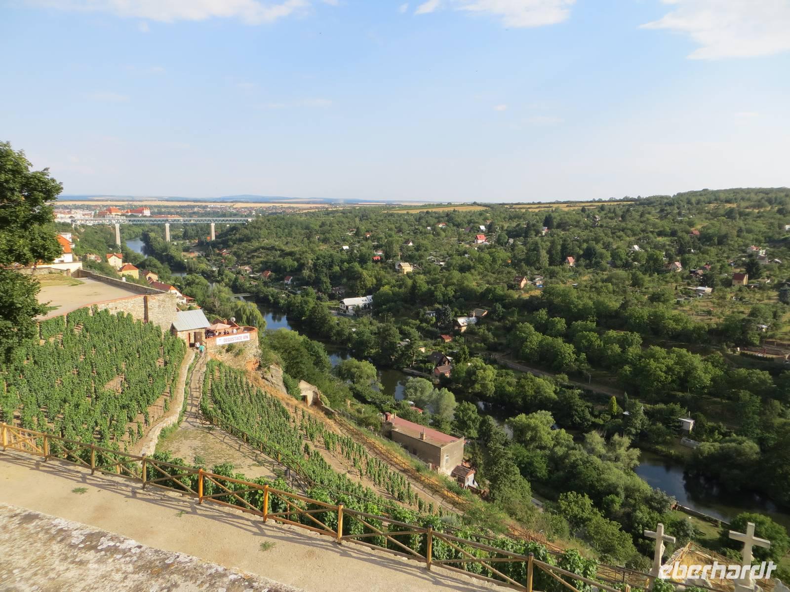 Die Strecke mutet kurz an, aber eine reichliche Stunde fährt der Bus doch von Telc bis Vranov nad Dyji - oder wie es auf Österreichisch-Deutsch heißt: Frain an der Thaya. Wer wie wir im Ort den Bus verlässt, steigt nochmals einen Kilometer nach oben zum prächtigen Schloss auf dem Felsen. Die Pause bis zum deutschsprachigen Führungsbeginn nutzten wir für das Suchen der besten Fotomotive. Der weißgelbe Barockbau glänzte in der heißen Sommersonne. Das barocke Schloss mit seinem bekannten Ahnensaal versprach nur wenig Abkühlung, aber das Erleben eines der schönsten Schlösser Mährens seiner Zeit. Von den Freiterrassen schauten wir hinab ins Thayatal, suchten bereits vorab unseren Wanderwegverlauf und besichtigten noch die großzügige Schlosskapelle. Nach der Mittagspause im Ort starteten wir zur vielleicht doch anspruchsvollsten Tour der Reise: zunächst entlang des Flusses ging es aufwärts und später im mittelhohen Bergland sogar über Felsgestein. Der sich unter uns windende Fluss war selten zu sehen, aber manche Waldöffnung gewährte Ausblick auf die nahe österreichische Seite des Nationalparks. Nach vierstündiger Wanderung erreichten wir in Lukov unseren wartenden Bus, der uns nach Znojmo brachte. Bevor wir das Hotel kennenlernten, bummelten wir über den Ober- und den Untermarkt des hübschen Städtchens am Hang bis hinüber zu St. Nikolai, dem markanten Dom der Stadt. Noch heute prägen vier Klostergebäude das Antlitz von Znojmo. Vom Ausblick am Dom zeichneten wir bereits gedanklich unseren Wanderweg für den kommenden Tag: hinab zur Thaya, hinauf durch Obstgärten auf ein Hochplateau am verkarsteten Ostrand des Nationalparks Podyji.