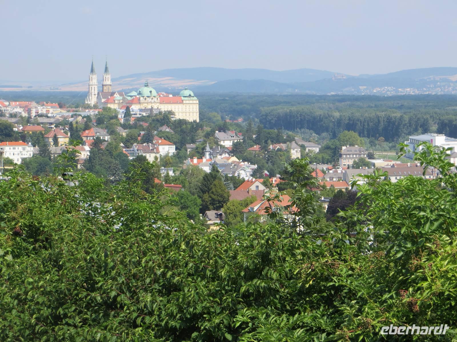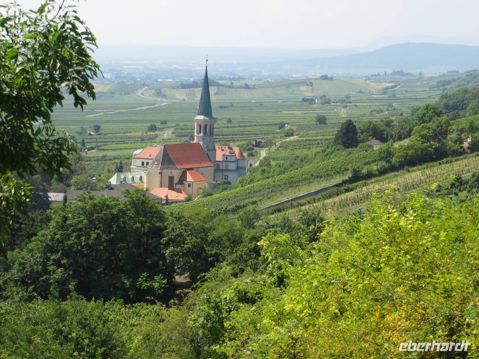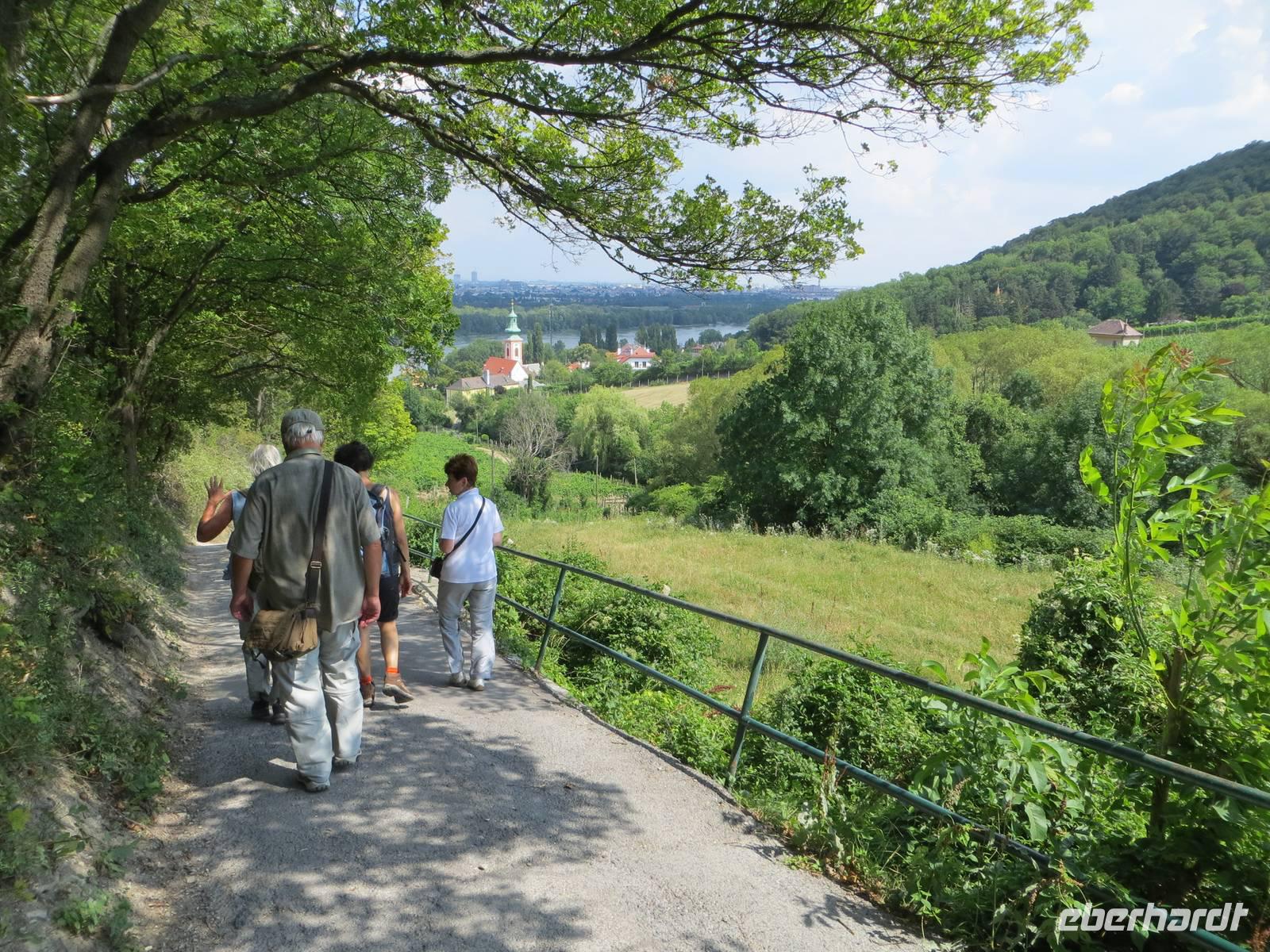 Die meisten trafen sich dann doch zum fakultativen Reiseleiterangebot einer Stadtwanderung von Klosterneuburg nach Wien-Nussdorf. Mit Wiener U- und S-Bahn fuhren wir nach Klosterneuburg und steigen auf zum weithin erkennbaren Stift. Auf der Gasse nach Weidling sahen wir erstmals was es an Winzerhöfen heißt: „ausg'steckt ist". Noch war es aber zu zeitig für ein Viertel; also stiegen wir auf zum Leopold- und Kahlenberg. Die Berge begrenzen im Westen Wien und sind die nördlichsten Ausläufer des Wienerwaldes. Hier oben, in der unmittelbaren Nähe eines großen Hochseilgartens, rasteten wir bei all den gastronomischen Freundlichkeiten der schnellen Wiener Küche: Leberknödelsuppe, Sacherwürstchen, Marillenknödel usw. Nach einer Aussicht auf Wien im trüben Hitzelicht, folgten wir dem Rat des Kneipers beim Abstieg. Durch schattiges Holz erreichten wir bei dreißig Grad Kahlenbergerdorf gerad pünktlich zum Kirchturmglockenschlag und der Öffnung einer Heurigenwirtschaft. Kellerwarm kann doch recht warm sein, aber nett war es doch im Innenhof der Winzerei. Der Abstieg führte uns dann schneller als gewollt an die Donaustraße, weiter nach Nussdorf und - wegen des ÖPNV-Tarifs - nach Heiligenstadt. Dreizehn Kilometer waren es dann auch, die wir auf der Stadtwanderung hinauf und hinab wanderten.