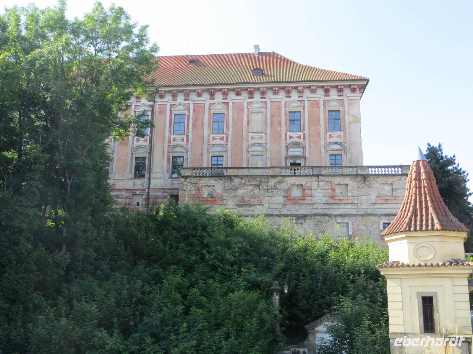 Den leichten, aber durchaus steilen Weg absolvierten wir in knapp einer Stunde und genossen manchen Ausblick in die Runde. Auf dem Berg steht seit dem 11. Jahrhundert eine Rotunde und erinnert heute daran, dass der Berg über Jahrhunderte ein wichtiges Pilgerziel freiheitlich denkender Tschechen, auch unabhängig ihres Glaubens war. Vom Rip ging es mit Bus nach Melnik, der Stadt über dem Zusammenfluss von Elbe und Moldau. Schön das wieder hergestellte Schloss der Lobkowitzer mit „Briefkuvertsgrafitto" und Sonnenuhr. Nach diesem Mittagsbummel ging - teilweise bei Starkregen und mit Straßensperrung bei Nelahosevis - es nach dem Prager Stadtteil Holesovice.