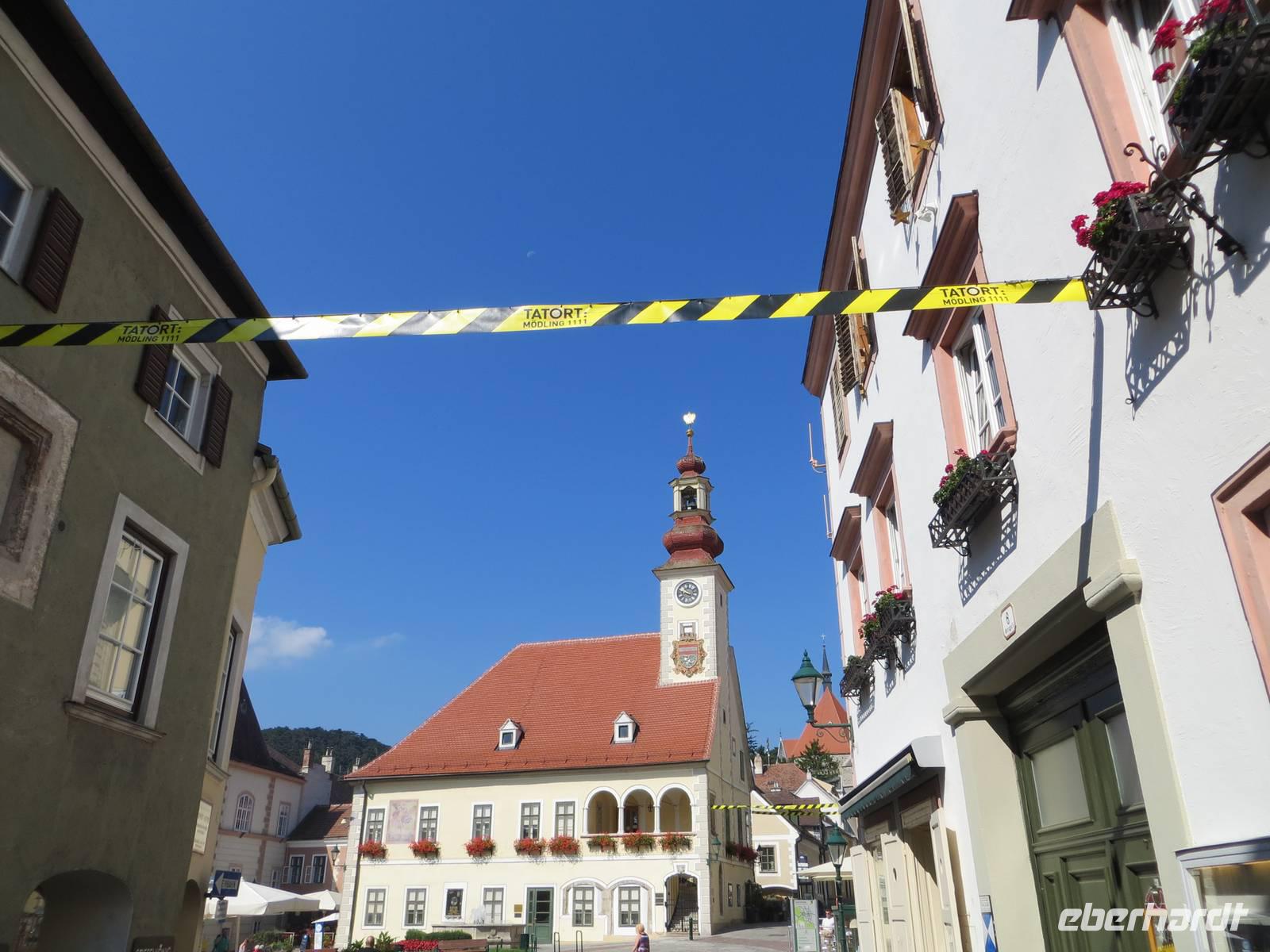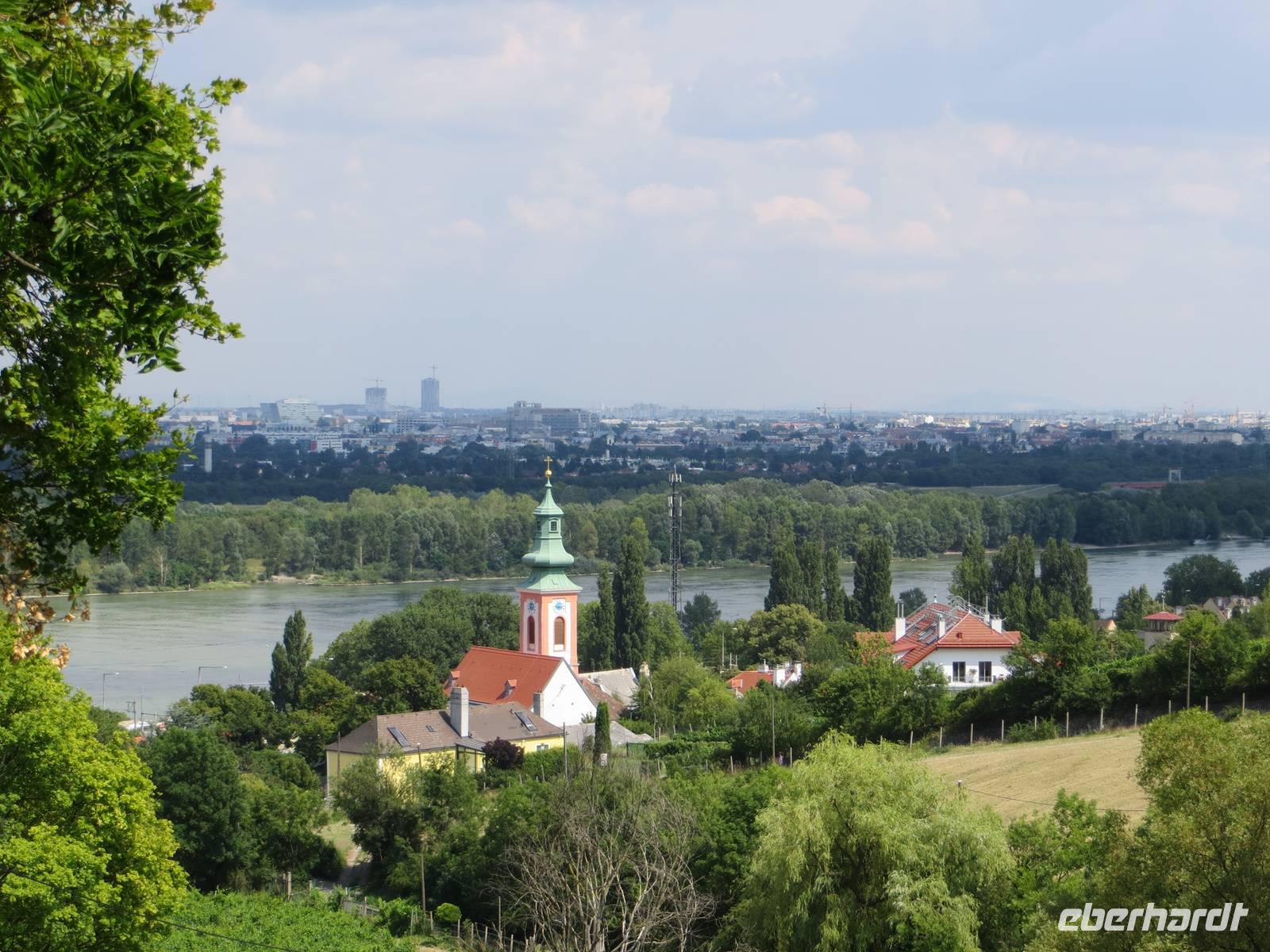 Die meisten trafen sich dann doch zum fakultativen Reiseleiterangebot einer Stadtwanderung von Klosterneuburg nach Wien-Nussdorf. Mit Wiener U- und S-Bahn fuhren wir nach Klosterneuburg und steigen auf zum weithin erkennbaren Stift. Auf der Gasse nach Weidling sahen wir erstmals was es an Winzerhöfen heißt: „ausg'steckt ist". Noch war es aber zu zeitig für ein Viertel; also stiegen wir auf zum Leopold- und Kahlenberg. Die Berge begrenzen im Westen Wien und sind die nördlichsten Ausläufer des Wienerwaldes. Hier oben, in der unmittelbaren Nähe eines großen Hochseilgartens, rasteten wir bei all den gastronomischen Freundlichkeiten der schnellen Wiener Küche: Leberknödelsuppe, Sacherwürstchen, Marillenknödel usw. Nach einer Aussicht auf Wien im trüben Hitzelicht, folgten wir dem Rat des Kneipers beim Abstieg. Durch schattiges Holz erreichten wir bei dreißig Grad Kahlenbergerdorf gerad pünktlich zum Kirchturmglockenschlag und der Öffnung einer Heurigenwirtschaft. Kellerwarm kann doch recht warm sein, aber nett war es doch im Innenhof der Winzerei. Der Abstieg führte uns dann schneller als gewollt an die Donaustraße, weiter nach Nussdorf und - wegen des ÖPNV-Tarifs - nach Heiligenstadt. Dreizehn Kilometer waren es dann auch, die wir auf der Stadtwanderung hinauf und hinab wanderten.