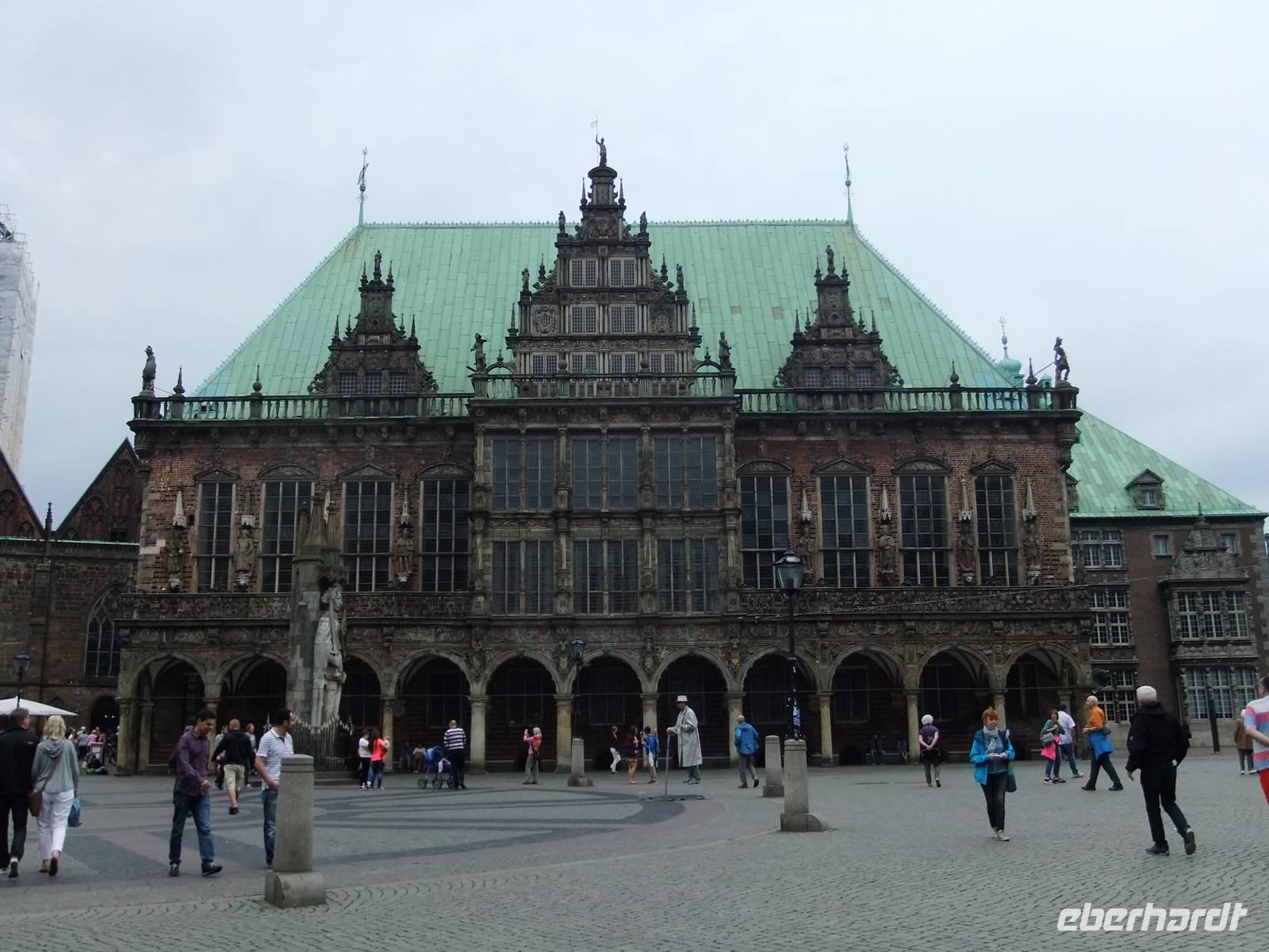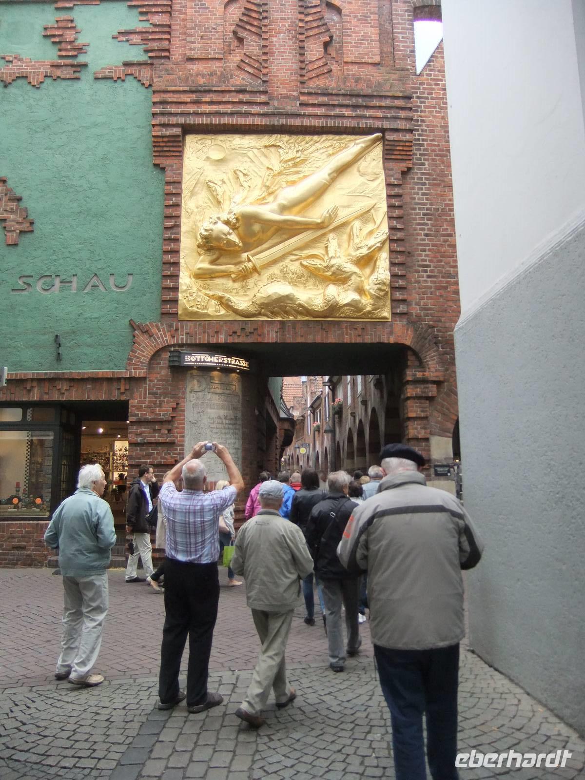 Wir kommen gut voran und erreichen kurz nach 13 Uhr die Hansestadt Bremen. Hier werden wir schon von der Stadtführerin erwartet. Sie unternimmt mit uns eine kleine Rundfahrt. Über die „letzte Brücke vor New York" erreichen wir die Neustadt. Wir kommen vorbei am „Kellogg's"-Werk, an der Becks-Brauerei, an der Hachez-Schokoladenfabrik und am Verwaltungssitz von „Jacobs"-Kaffee. Auch können wir einen Blick auf die Weserpromenade „Schlachte" werfen. Dann geht es auf dem Osterdeich entlang der Weser. Immer wieder sehen wir vornehme Villen mit vielen Erkern und kleinen Türmchen. Einen weiteren Blickfang bildet die Mühle am Watt. Wieder zurück im Zentrum verlassen wir den Bus und spazieren zum Schnoorviertel. Es ist Bremens ältestes Viertel mit vielen kleinen Häusern des 15. Bis 16. Jahrhunderts. Die Gassen sind hier sehr eng und wir sehen auch das wohl kleinste Hotel der Welt, das grüne Hochzeitshaus, nur vier Schritte breit und vier Schritte tief. Unser nächstes Ziel ist der Marktplatz - seit Jahrhunderten Herz der Hansestadt. Wir besuchen den St. Petri-Dom, bestaunen den Bremer Roland und sind von der Weser-Renaissance-Fassade des Rathauses begeistert. An der Westmauer des Gebäudes entdecken wir die Bremer Stadtmusikanten. Natürlich werden Esel, Hund, Katze und Hahn fotografiert. Nun ist es gleich 15 Uhr, deshalb laufen wir vom Marktplatz zur Böttchergasse, denn hier erklingt zur vollen Stunde ein Glockenspiel aus Meißner Porzellan. Dabei werden im drehbaren Turm holzgeschnitzte Tafeln mit Darstellungen der Ozeanüberquerung gezeigt. Nicht weit von der Böttchergasse entfernt endet unser Rundgang wieder am Bus. Nur gut - denn plötzlich öffnet der Himmel seine Schleusen.