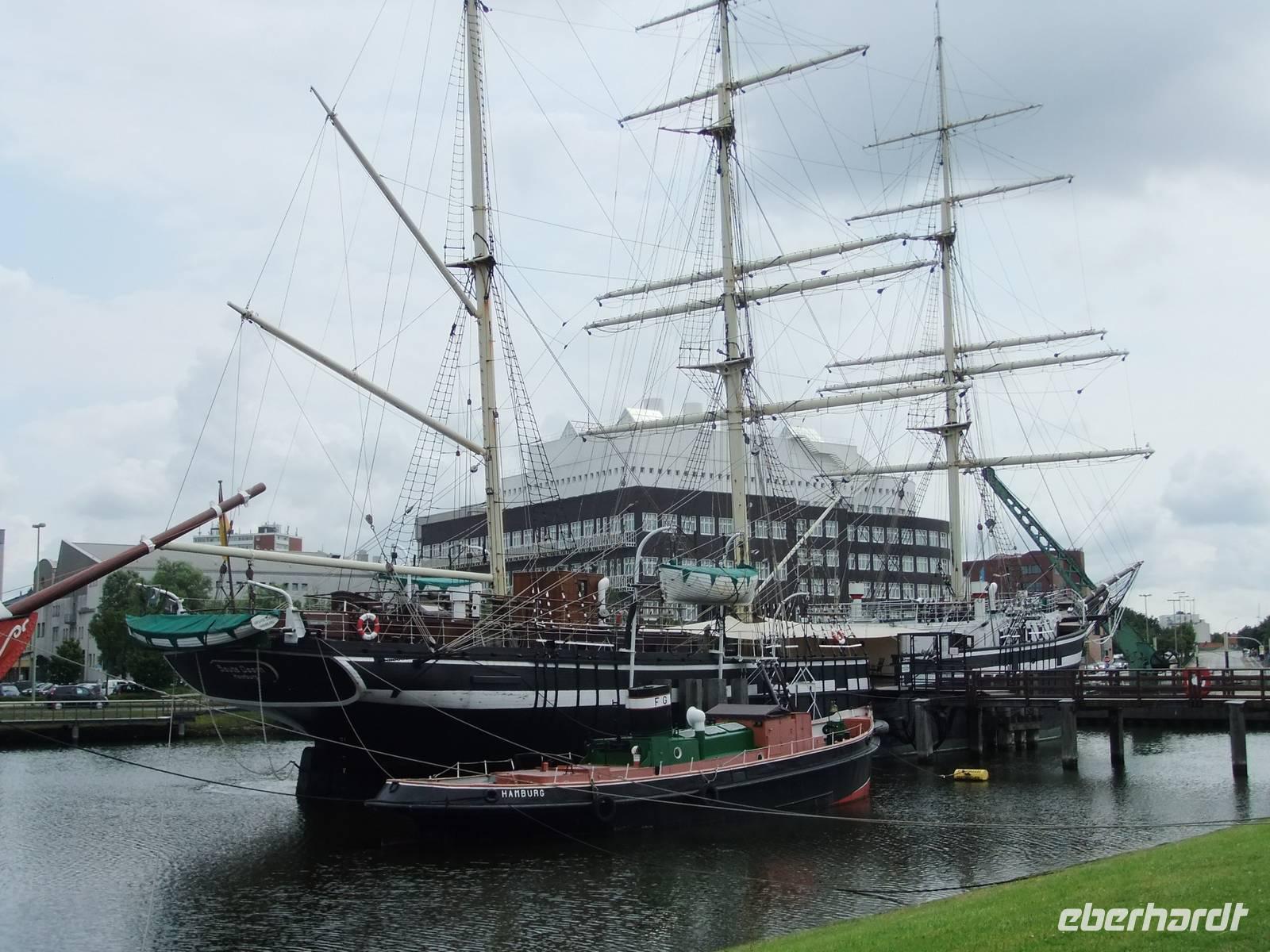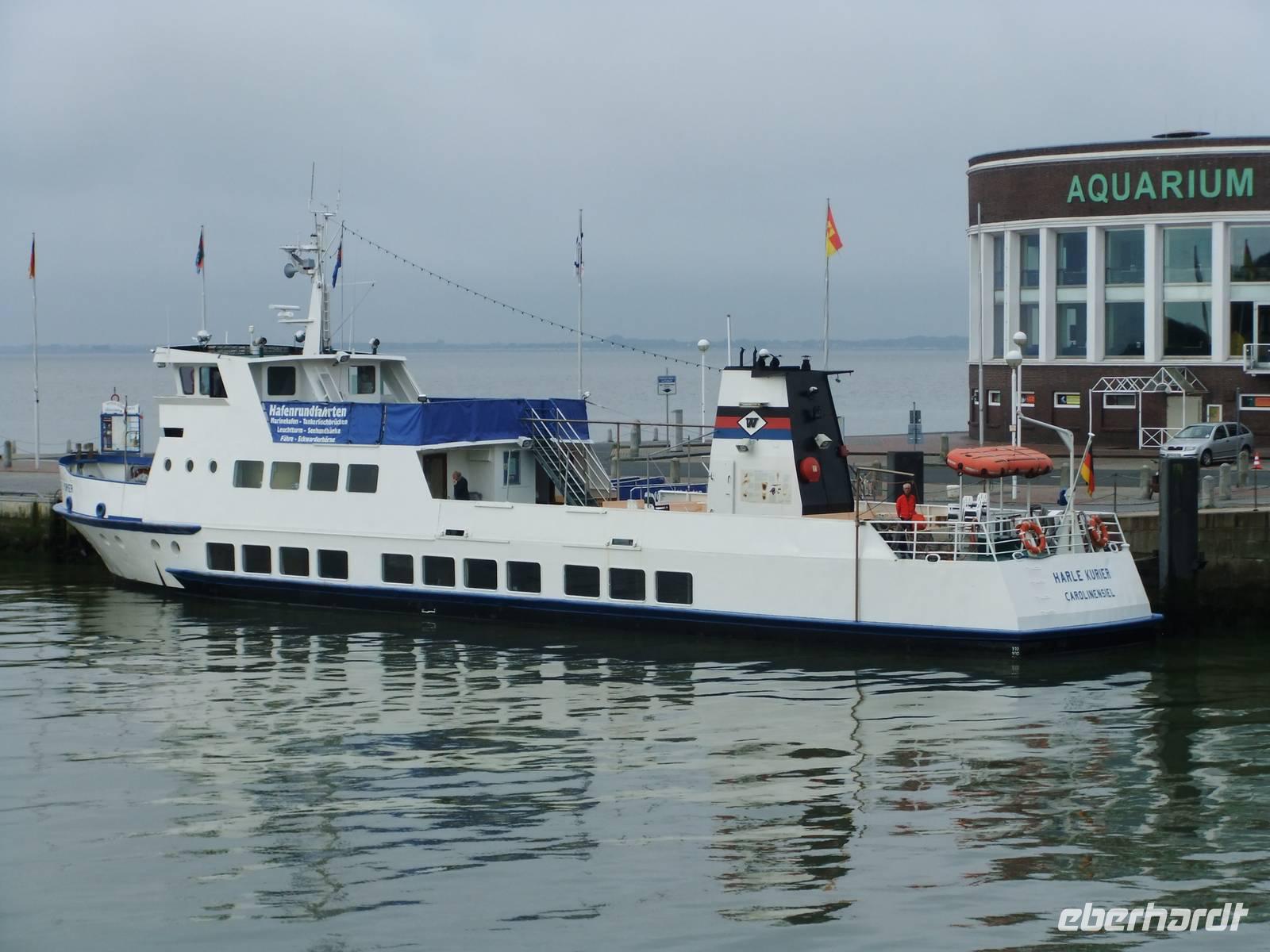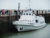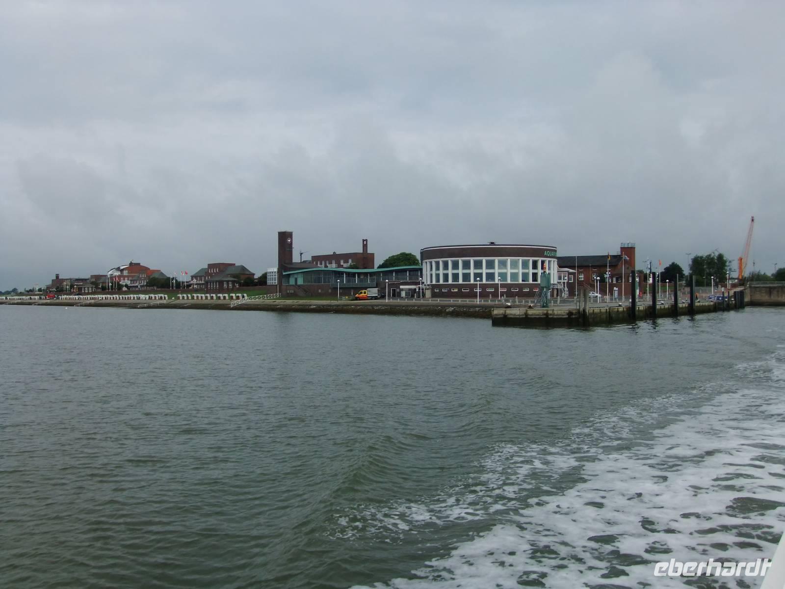 Dann gehen wir an Bord der MS „Harle Kurier". Pünktlich 9 Uhr legt sie ab zur Fährüberfahrt über den Jadebusen. Von Bord aus haben wir einen guten Blick zum Marinehafen. Nach ca. 40 Minuten erreichen wir Eckwarderhörne. Hier machen wir ein Gruppenfoto und beobachten die Schafe auf dem Deich. Inzwischen ist Alf mit dem Bus auch angekommen - er musste ja den Jadebusen umrunden - und wir fahren über die Halbinsel Butjadingen und durch den Wesertunnel nach Bremerhaven.