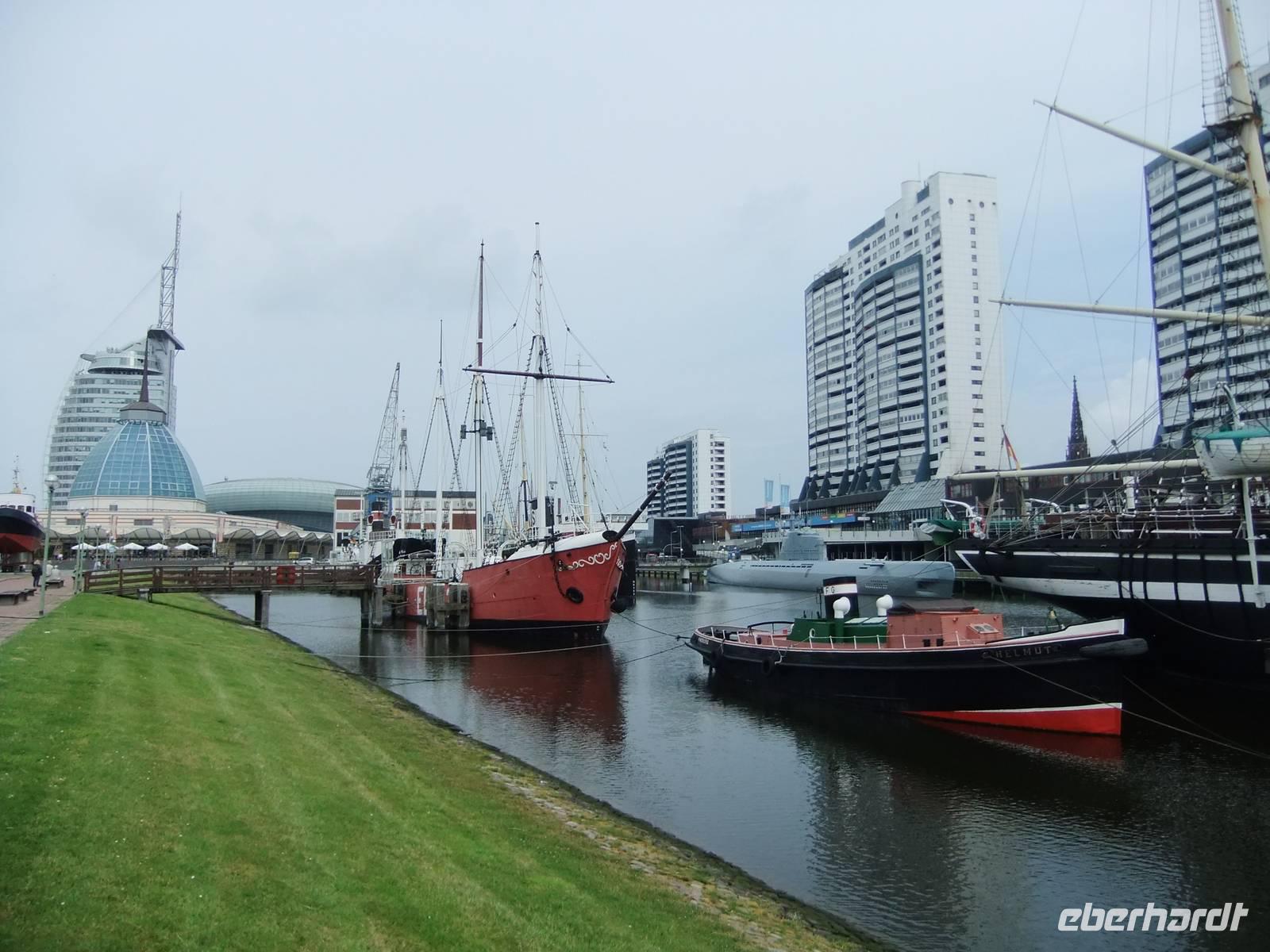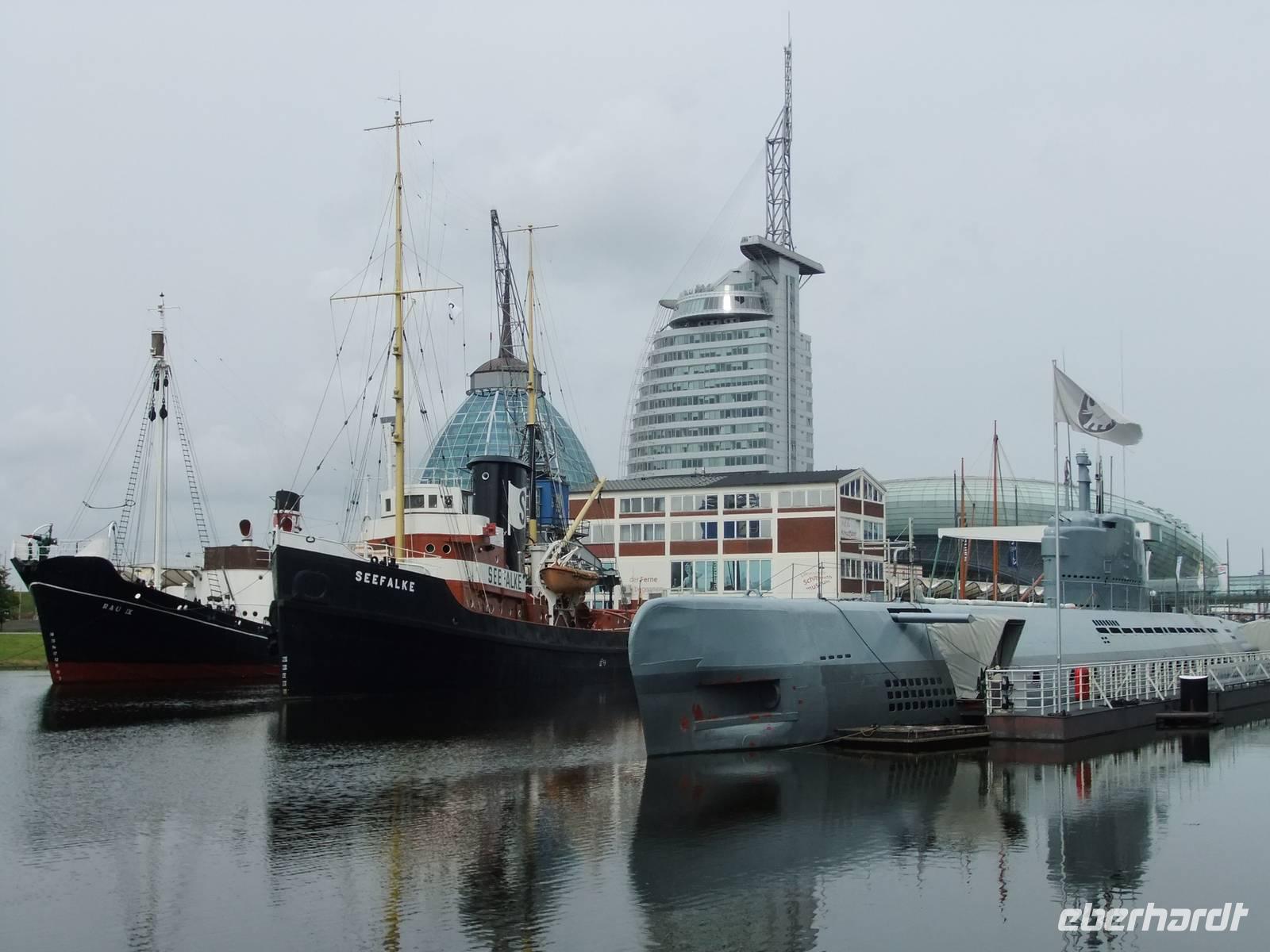 Im maritim geprägten Stadtviertel „Hafenwelten" warten jede Menge Sehenswürdigkeiten auf uns. Einige Gäste begeben sich im Klimahaus entlang des 8. Längengrades einmal um die Erde, andere unternehmen im Deutschen Auswandererhaus eine Zeitreise durch drei Jahrhunderte deutscher Aus- und Einwanderergeschichte. Auch der Museumshafen mit dem U-Boot „Wilhelm Bauer", das Deutsche Schifffahrtsmuseum und der Zoo am Meer sind Anziehungspunkte. Ein besonders schöner Blick auf Bremerhaven bietet sich von den Aussichtsplattformen des Radarturmes oder des Atlantic-Hotels. Einige Gäste unternehmen auch eine Hafenrundfahrt zu den riesigen Schiffen, Autoumschlagplätzen, Docks und Werften. Nach vier Stunden treffen wir uns alle wieder und es gibt viel zu erzählen. Wir haben wie gestern Glück, denn erst als alle im Bus sind, beginnt es zu regnen.