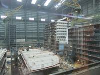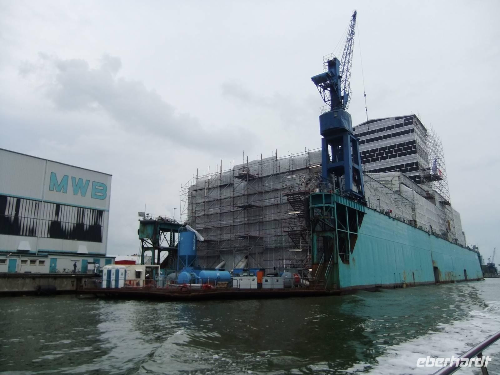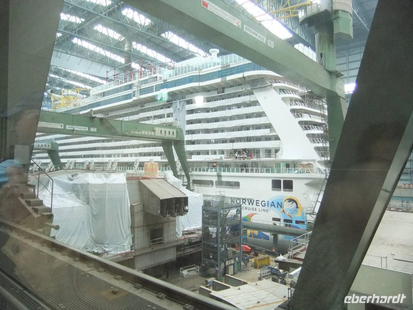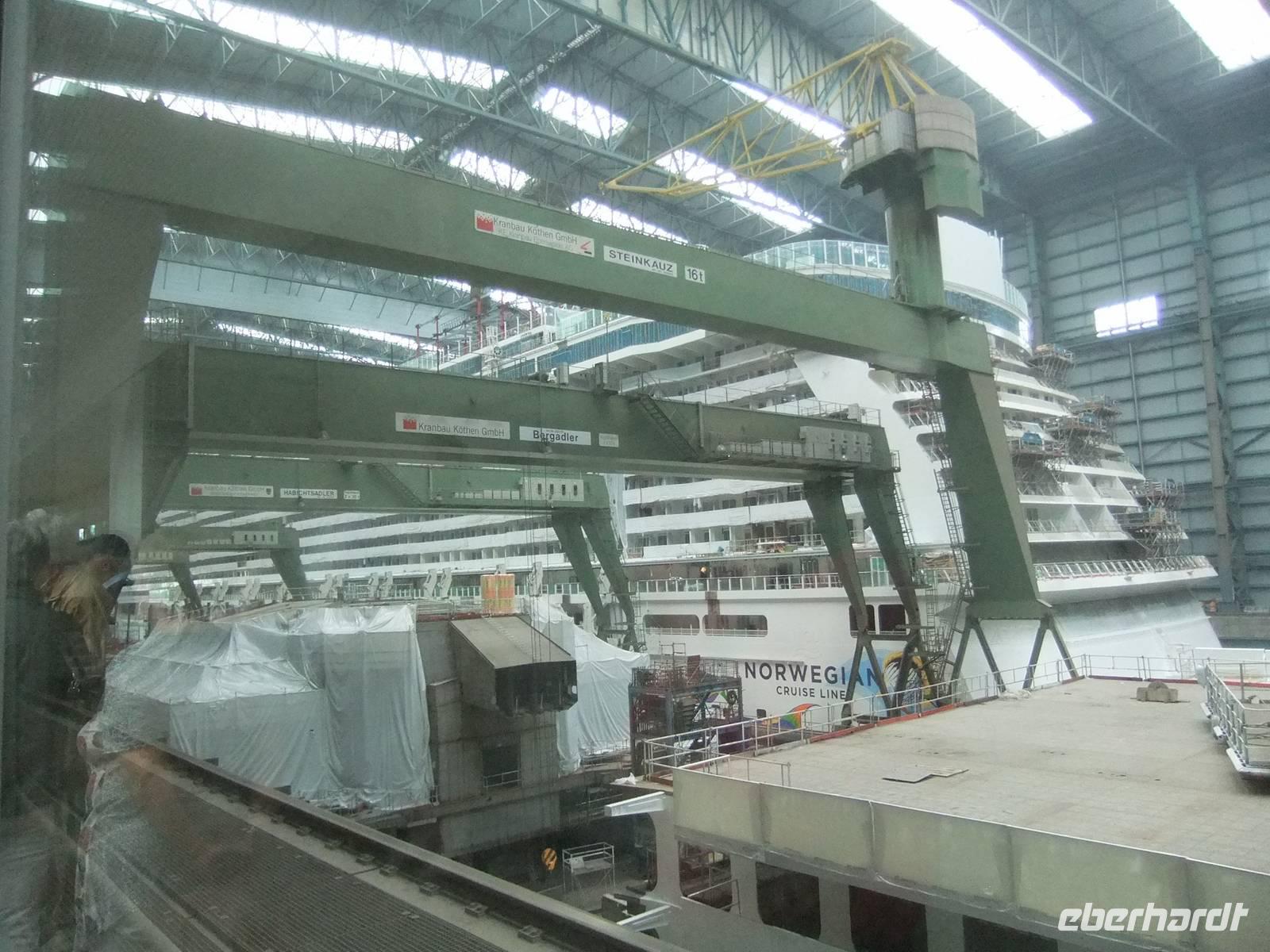 Nun wird es gigantisch. Den Mittelpunkt des Betriebes bilden die beiden riesigen überdachten Baudockhallen. Hier entstehen u.a. Kreuzfahrtschiffe, Fähren und Gastanker. Im Rahmen einer Führung verfolgen wir den Bau der Ozeanriesen zuerst per Film und dann hautnah. In der großen Halle wir zur Zeit ein Kreuzfahrtschiff für über 4.000 Passagiere fertiggestellt. Es soll im September auslaufen. Im neugestalteten Besucherzentrum präsentieren sich u.a. mehrere Originalkabinen, ein Modell einer Schiffsschraube und 20 Schiffsmodelle der Meyer-Werft. Auf einer elektronischen Seekarte können wir live verfolgen, auf welchen Weltmeeren sich diese Ozeanriesen zur Zeit befinden. Anhand eines Films begeben wir uns zudem auf eine Reise in die 215jährige Firmengeschichte. Heute hat die Werft mehr al 3000 direkt Beschäftigte. Interessant für uns ist auch, wie die riesigen Schiffe von Papenburg über die Ems ins Meer geleitet werden. Beeindruckt von den Dimensionen verlassen wir das Werftgelände.