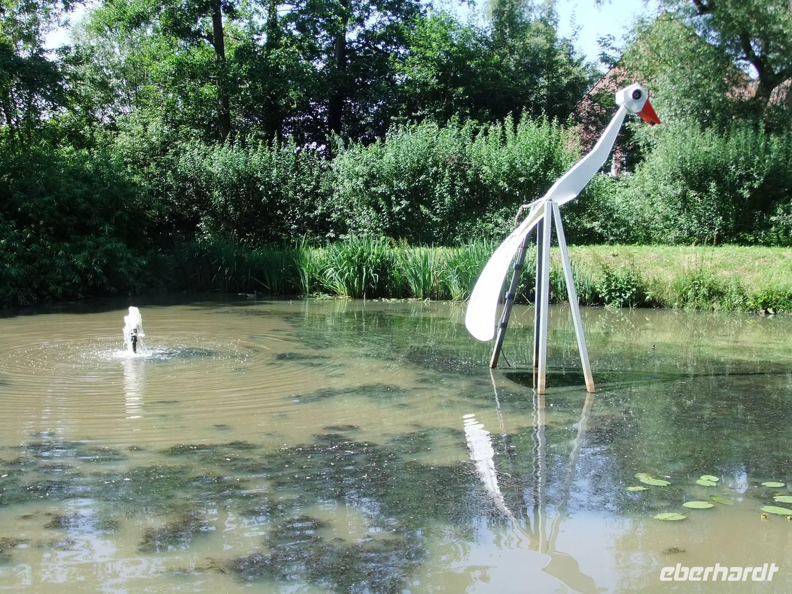 Nach dem Abendessen lockt die Sonne noch zu einem letzten Spaziergang in den Schlosspark hinter das Hotel. Hier wartet schon der große Storch auf uns, den wir dann auch gern Wasser spucken lassen.