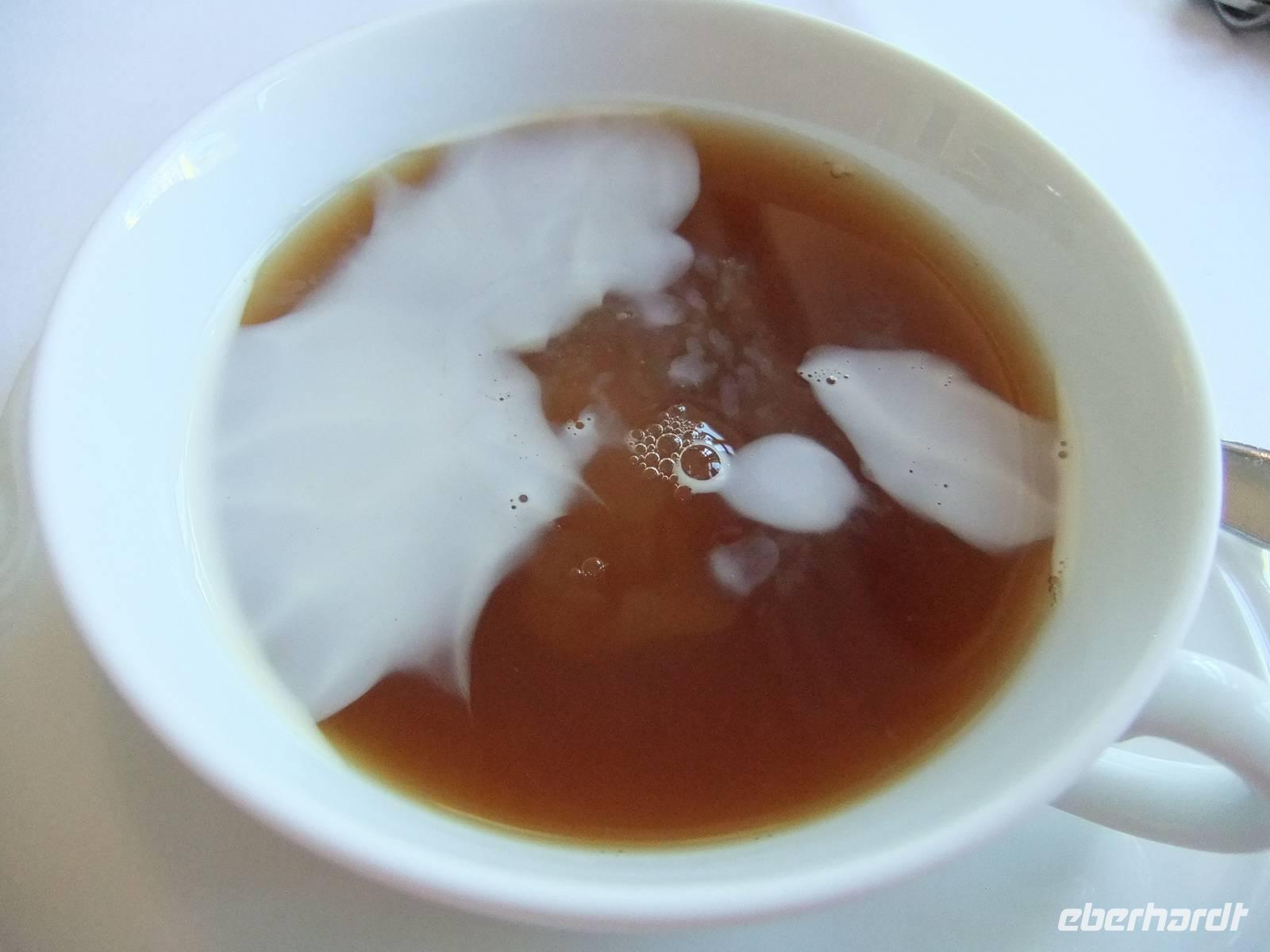 Hier erwartet uns nämlich noch eine ostfriesische Tradition. Wegen des herausragenden Stellenwertes, den der Tee in Ostfriesland genießt, entwickelte sich im Laufe der Zeit eine spezielle Teekultur. Die Zeremonie, die damit verbunden ist, lernen wir nun kennen. Vor dem Eingießen legt man einen Kluntje in die Tasse. Der Tee wird dann auf den Kluntje in die Teetassen gefüllt. Anschließend gibt man mit einem "Rohmlepel" einen Tropfen "Rohm" hinzu, und zwar so, dass "n Wulkje" entsteht. Nach der alten Sitte "Dree is Oostfresenrecht" trinken alle mindestens drei Tassen.