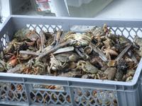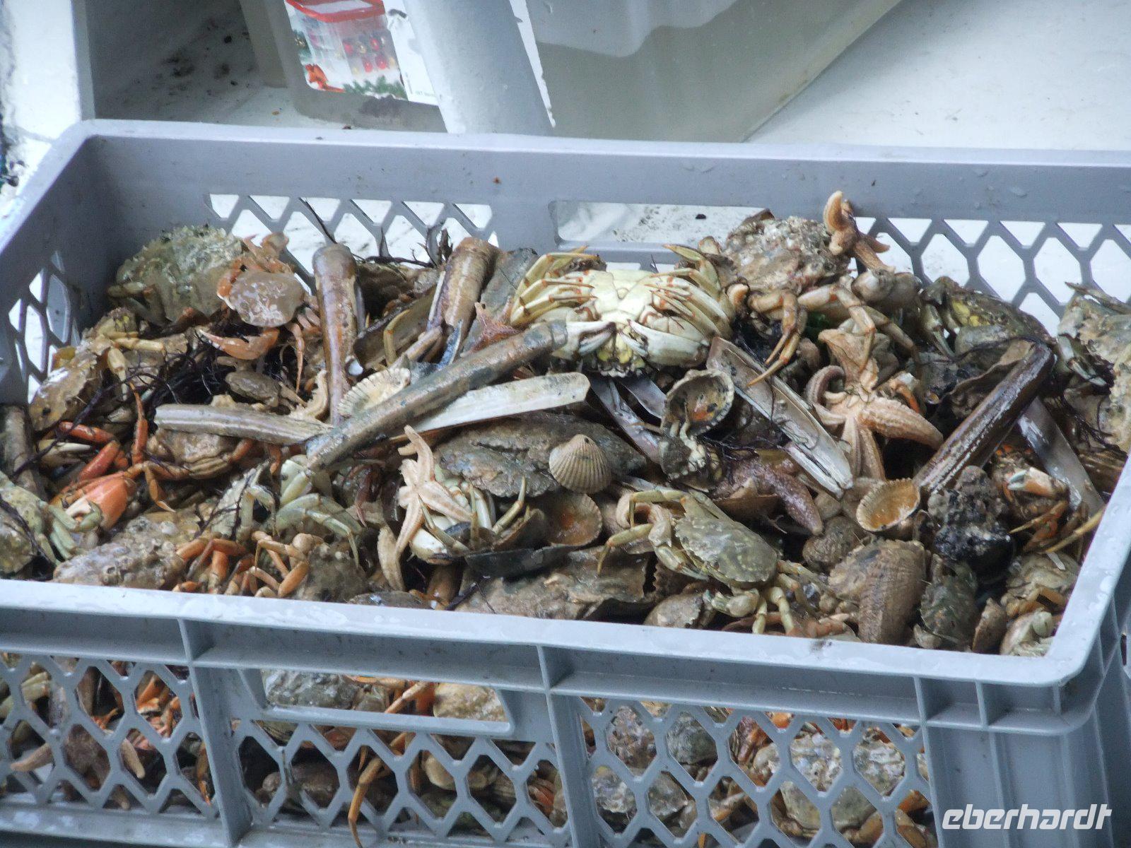Wir sehen, wie Krabben und Muscheln im Sand verschwinden,