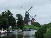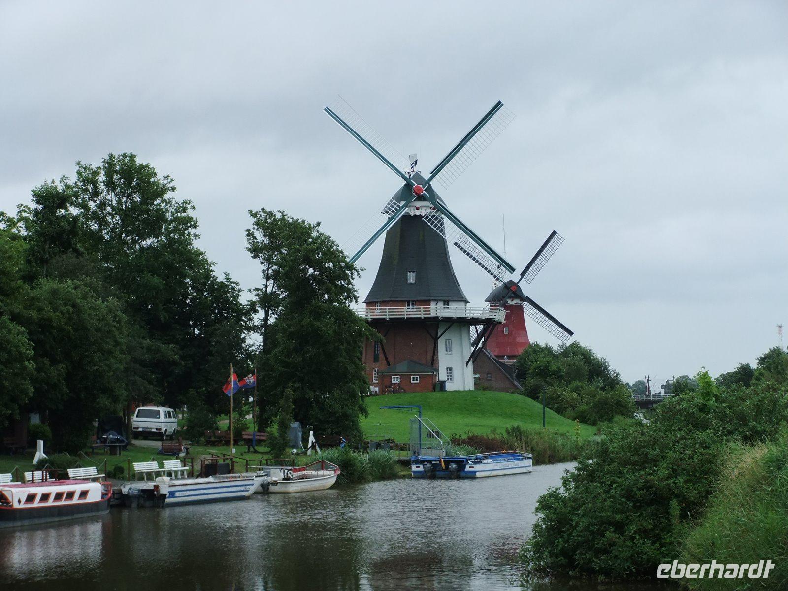 Gleich am Ortseingang zwei Holländerwindmühlen stehen.