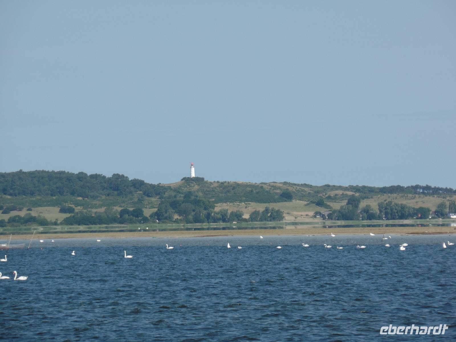 Bereits vom Schiff aus ist das Wahrzeichen von Hiddensee zu sehen, der Leuchtturm im Hochland von Kloster.