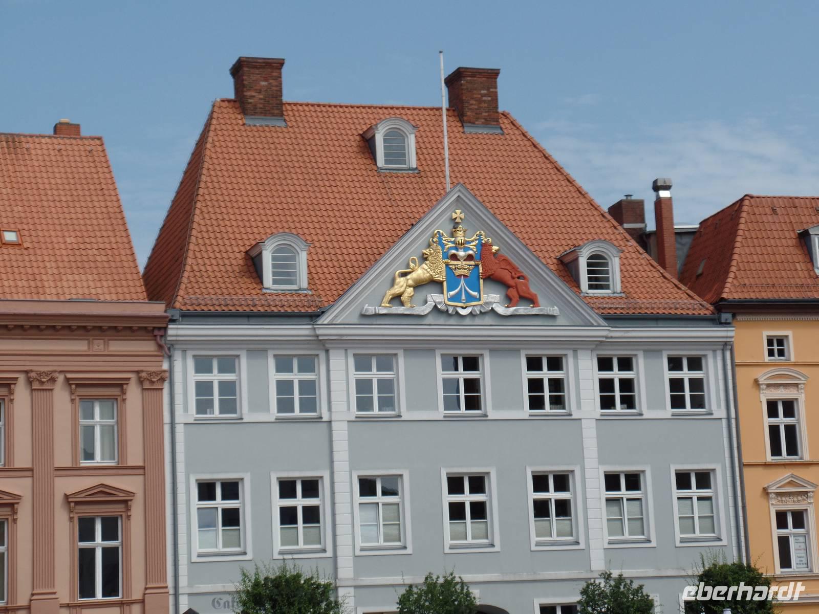 Über den großen Fenstern deuten Wappen der Hansestädte Wismar, Lübeck, Hamburg, Greifswald, Stralsund und Rostock auf alte Seehandelsbeziehungen hin.
