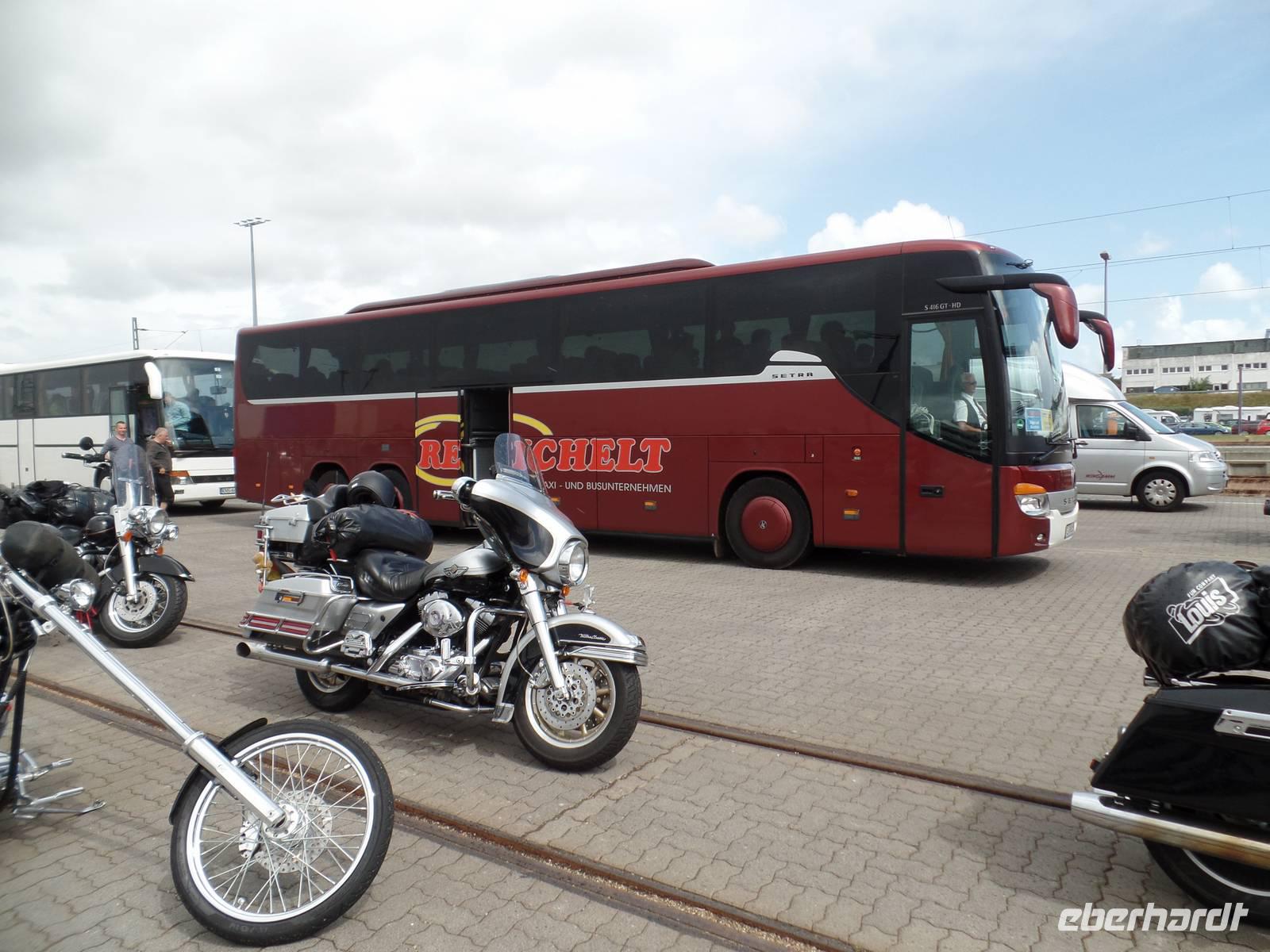 Nach dem Zustieg aller Reisegäste und der Anreise über den Berliner Ring wurden wir am Nachmittag von unseren beiden Stadtführern in Stralsund begrüßt. Gemeinsam fuhren wir ein kleines Stück bis zum Hafengelände.