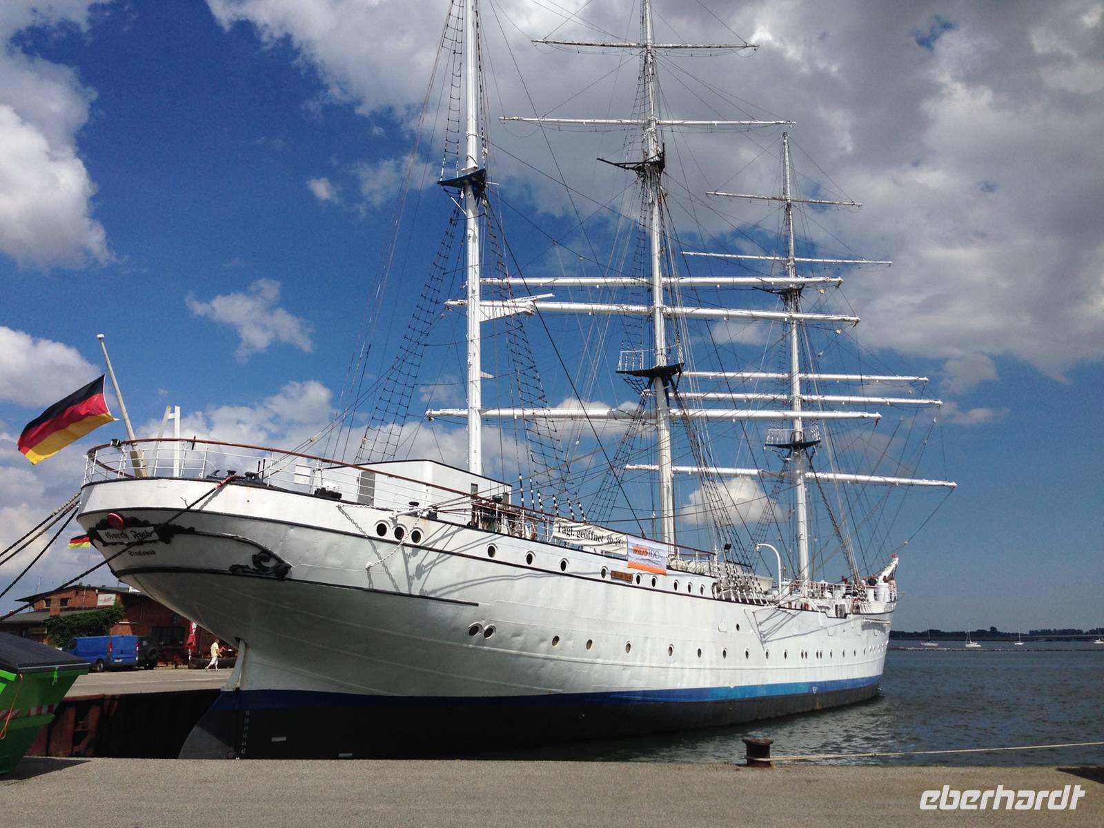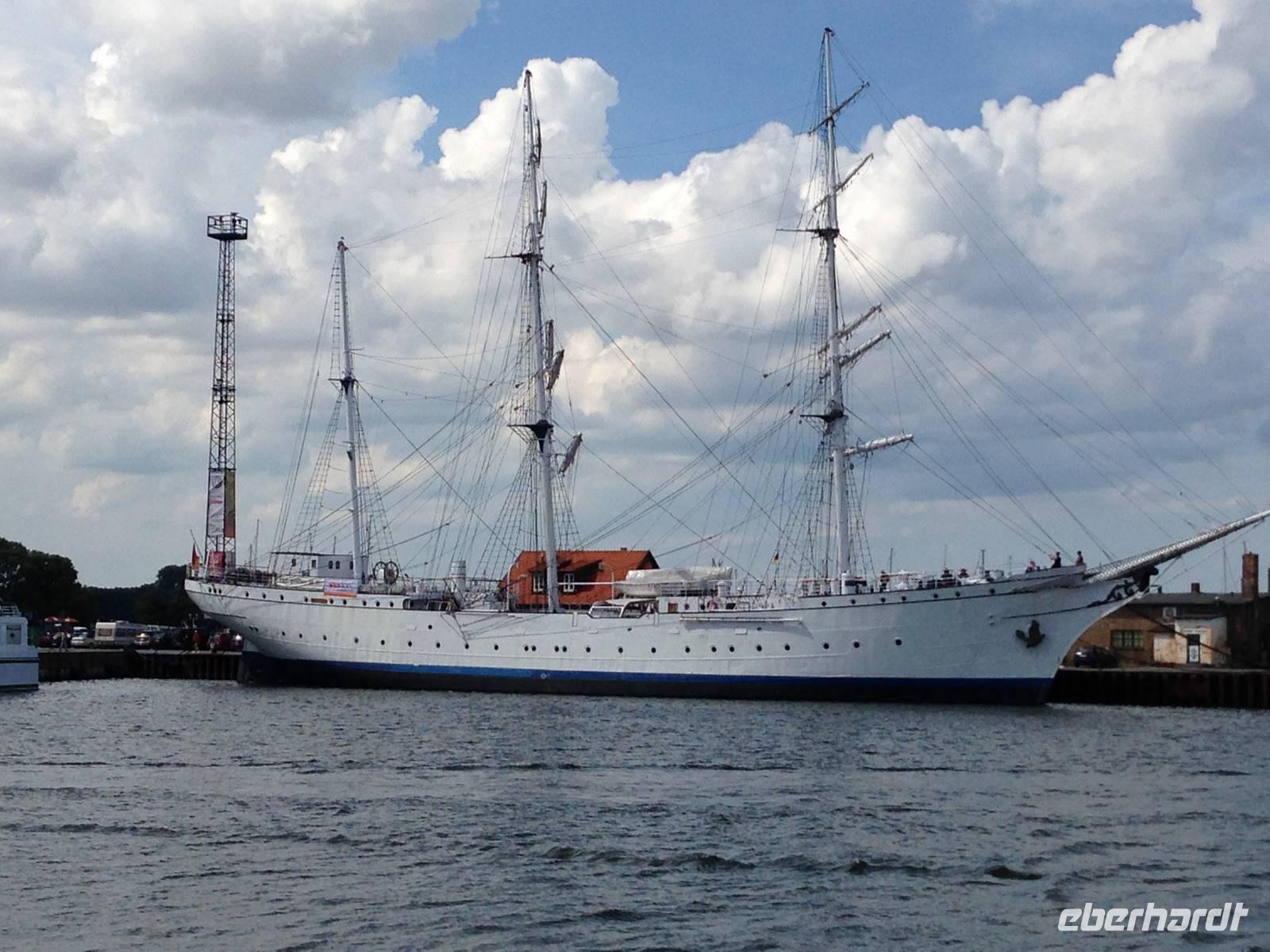 Nach dem Treffen am Dresdner Flughafen und dem Zustieg weiterer Gäste bei Berlin fuhren wir bei herrlichem Wetter über den Berliner Ring und die BAB 11 sowie die BAB 20 in Richtung Stralsund, wo wir uns am ZOB mit den beiden Stadtführern trafen. Von dort ging es mit dem Bus zuerst zum Ozeaneum, direkt am Stadthafen Stralsund. Erste maritime Eindrücke erweckte das ehemalige Segelschulschiff Gorch Fock. Nach der Stadtführung ging es weiter über die 2006 eröffnete Rügenbrücke auf die Insel Rügen in Richtung Breege.