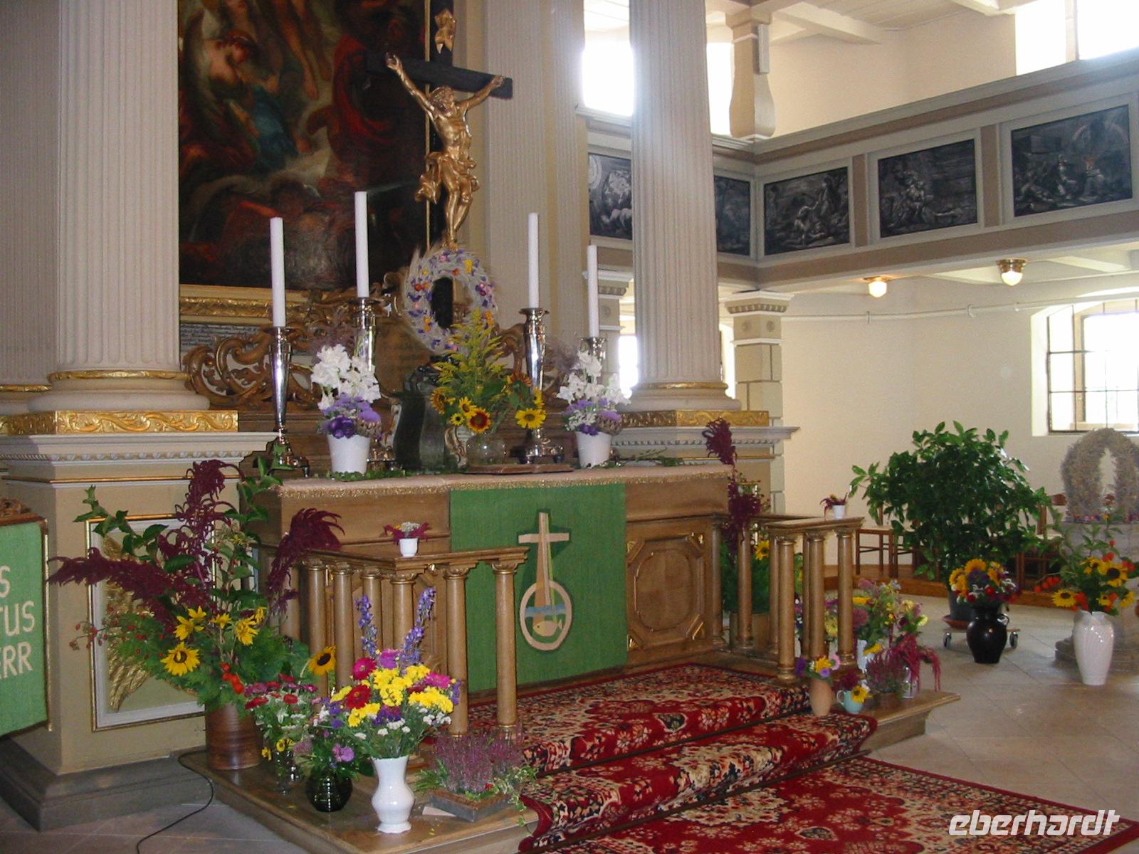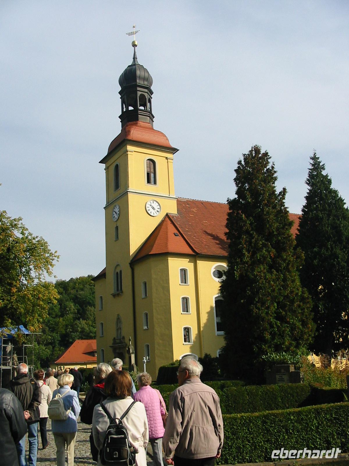 Zuerst fuhren wir nach Großschönau. Hier besichtigten wir die evangelisch-lutherische Kirche. Sie wurde zwischen 1703 und 1705 erbaut. Mit drei Emporen bietet sie Platz für 2.000 Kirchgänger. Damit ist sie die zweitgrößte Dorfkirche Sachsens. Die größte Kostbarkeit ist das von Johann Eleazar Zeissig (genannt Schenau) 1787 gemalte Altarbild "Christi Auferstehung". Mit einem Orgelkonzert beenden wir die Besichtigung. Entlang der Mandau findet man viele der regional typischen Umgebindehäuser. Das gesamte Ortsbild der Gemeinde wird von über 650 Umgebindehäusern geprägt