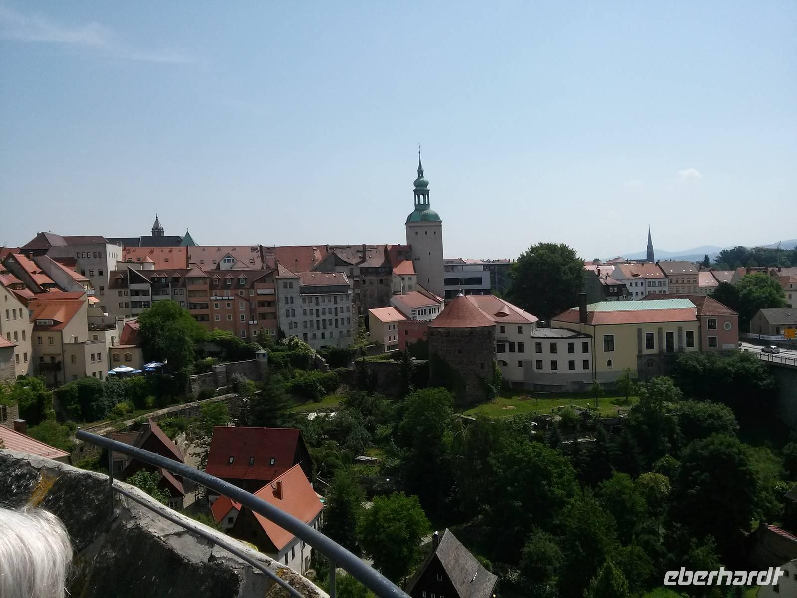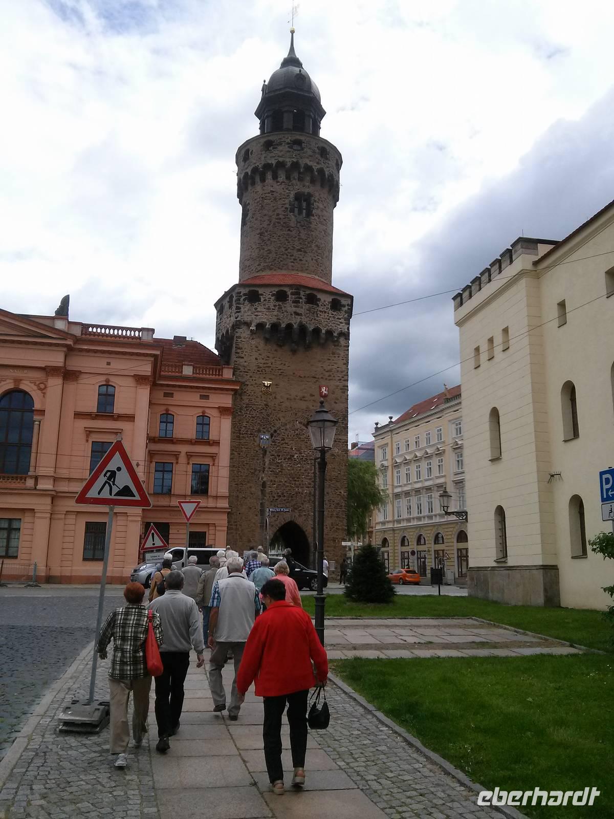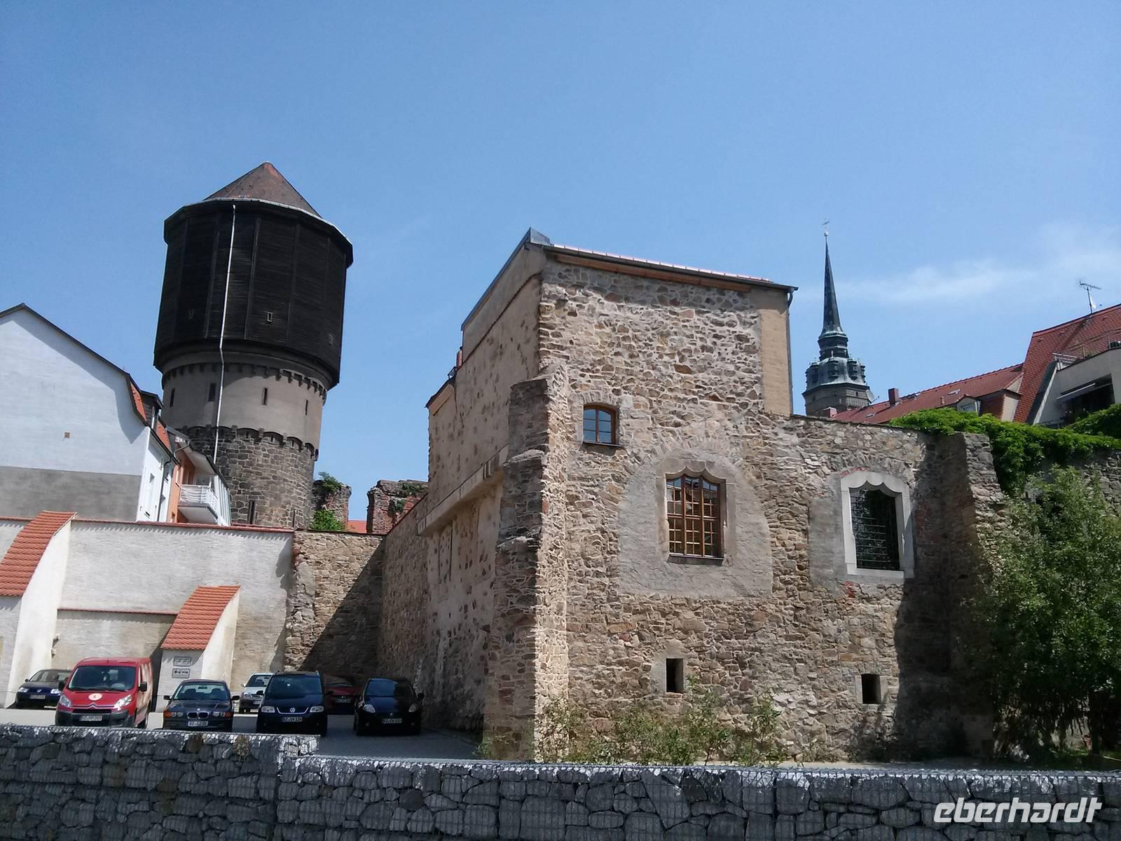 Von dort ging es am ehemaligen Franziskanerkloster vorbei zur Alten Wasserkunst, einer Vorrichtung, die seit 1529 Wasser aus der Spree über mehrere Etagen in die Höhe pumpte und so die Stadt mit Wasser versorgte. Bis etwa 1920 blieb die Alte Wasserkunst in Betrieb, heute kann man den Turm gegen 2,50 € besteigen. Etwas preiswerter war der Aufstieg auf den Reichenturm (2,00 €), der 1,44 m zur Seite neigt, was man aber kaum bemerkt. Von oben hat man dafür nach einem Pläuschchen mit der Türmerin einen wunderbaren Ausblick auf Bautzen und seine Umgebung.