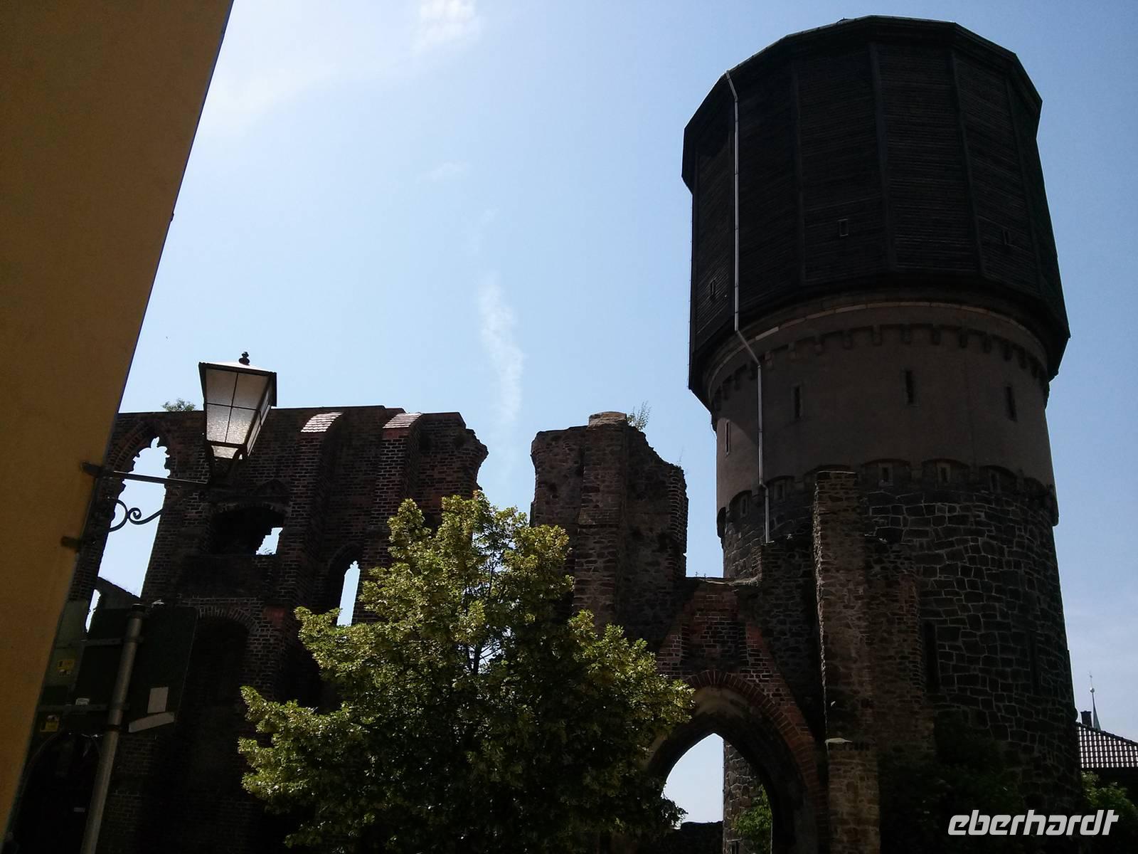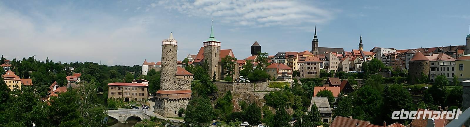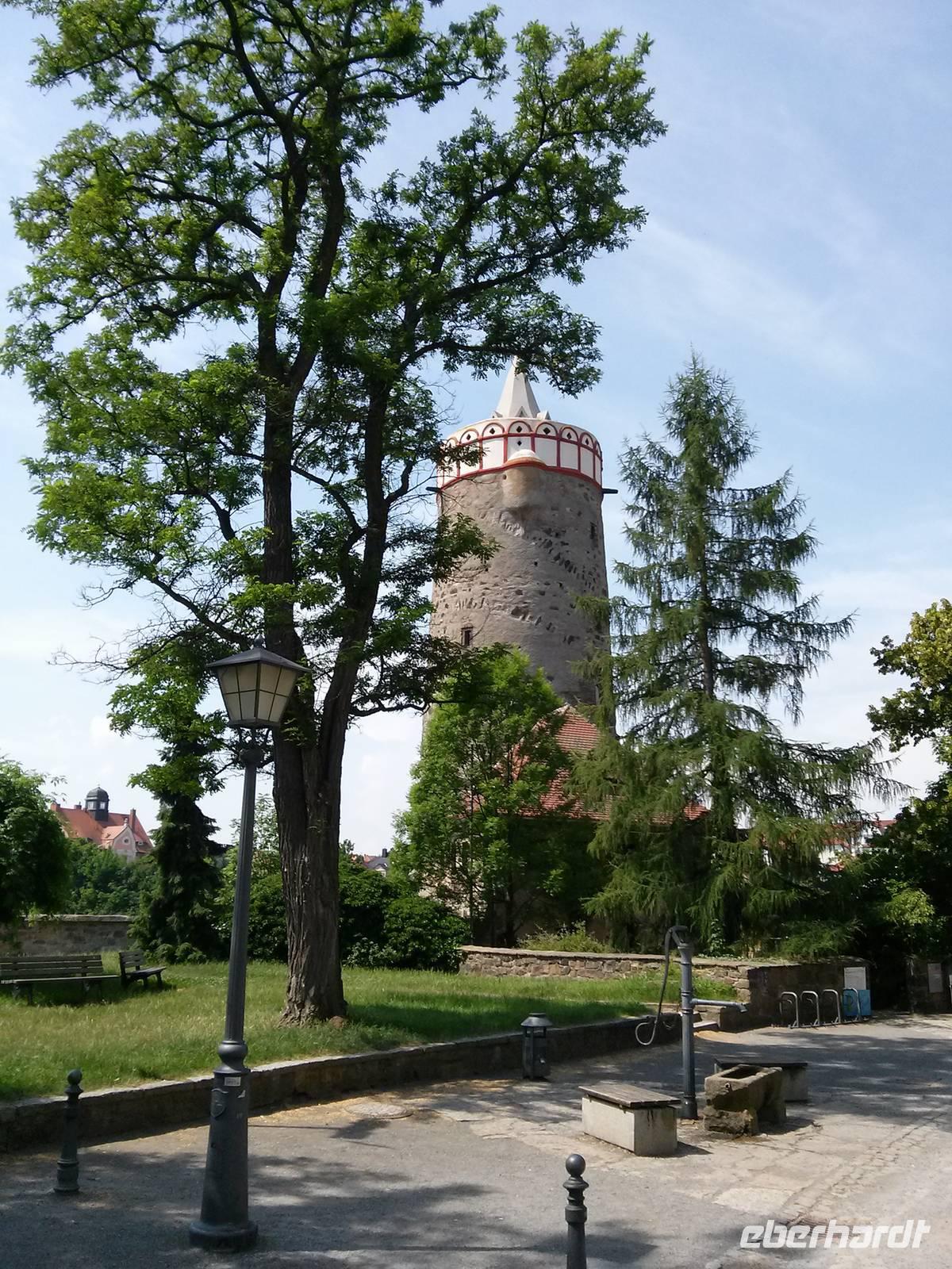 Von dort ging es am ehemaligen Franziskanerkloster vorbei zur Alten Wasserkunst, einer Vorrichtung, die seit 1529 Wasser aus der Spree über mehrere Etagen in die Höhe pumpte und so die Stadt mit Wasser versorgte. Bis etwa 1920 blieb die Alte Wasserkunst in Betrieb, heute kann man den Turm gegen 2,50 € besteigen. Etwas preiswerter war der Aufstieg auf den Reichenturm (2,00 €), der 1,44 m zur Seite neigt, was man aber kaum bemerkt. Von oben hat man dafür nach einem Pläuschchen mit der Türmerin einen wunderbaren Ausblick auf Bautzen und seine Umgebung.