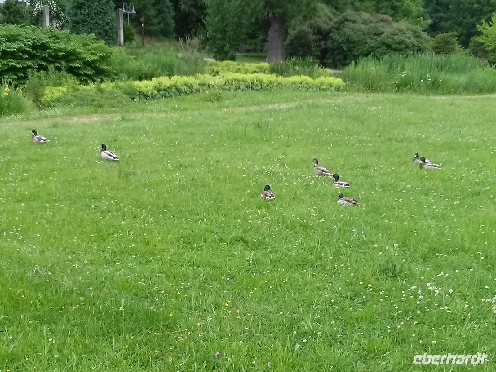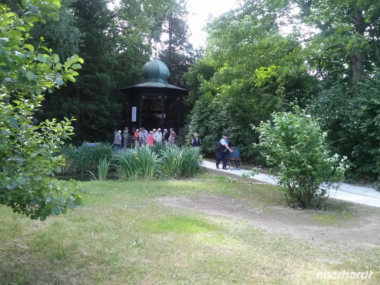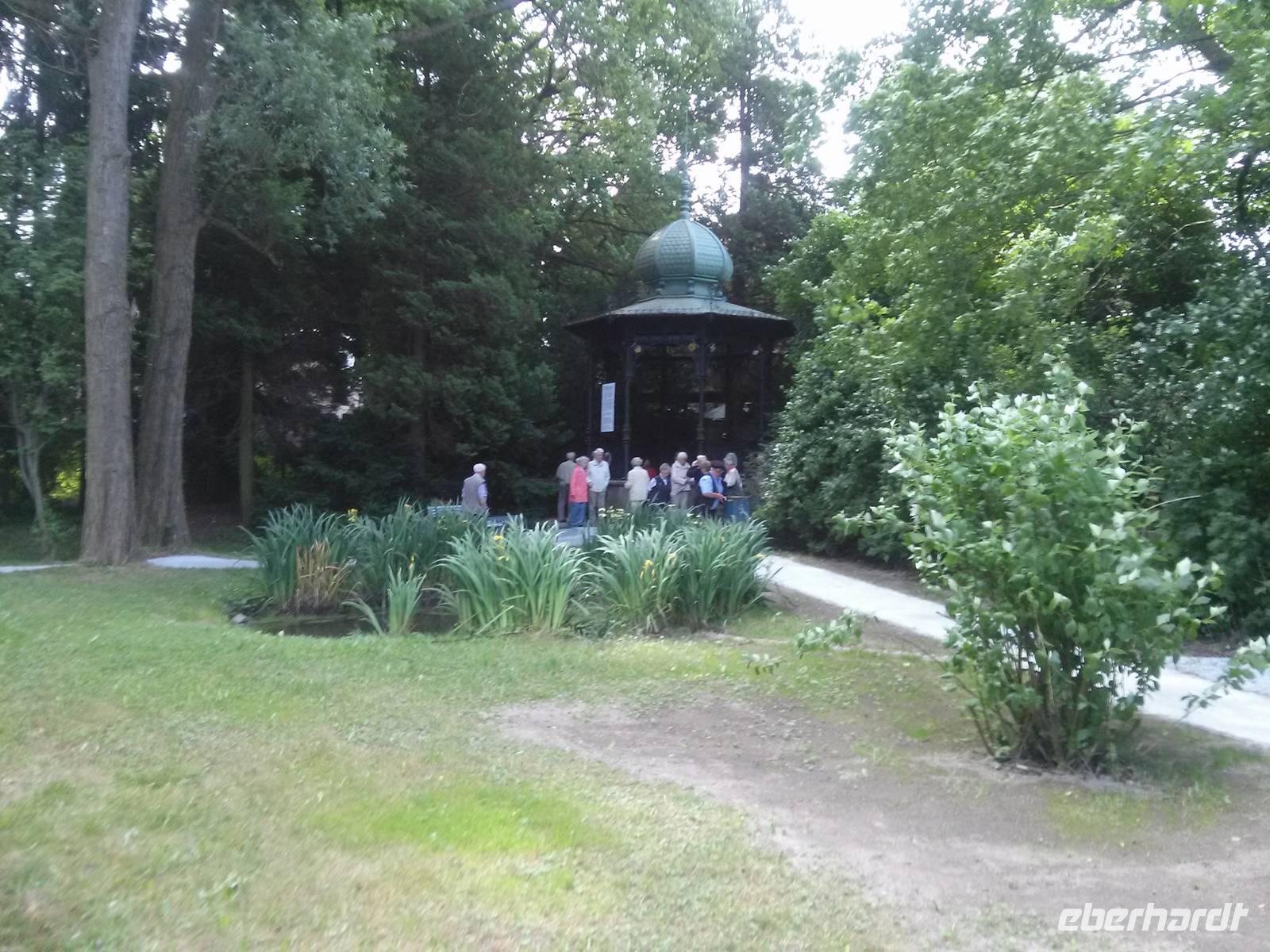 Die Spree hat drei Quellen, welche als genuine Spreequellen angesehen werden, zwei davon befinden sich in Ebersbach. Während von der einen Quelle nur ein Nachbau an öffentlich zugänglicher Stelle zu sehen ist, befindet sich die zweite in einem gut gepflegtem Park. Hier trafen wir Leierkastenmann "Nante" der uns, vorbei an Teichen mit Entengrütze, zur Quelle begleitete und uns vom Durchfluss der Spree durch Österreich berichtete - bis 1918. An dem die Quelle überdachenden Bau ist daher immer noch das österreichische Kaiserwappen angebracht.Wenn die Berliner Politik weiterhin solchen Unsinn machte, so drohte "Nante" wollten die Lausitzer den Berlinern in Zukunft die Spreequellen verstopfen...