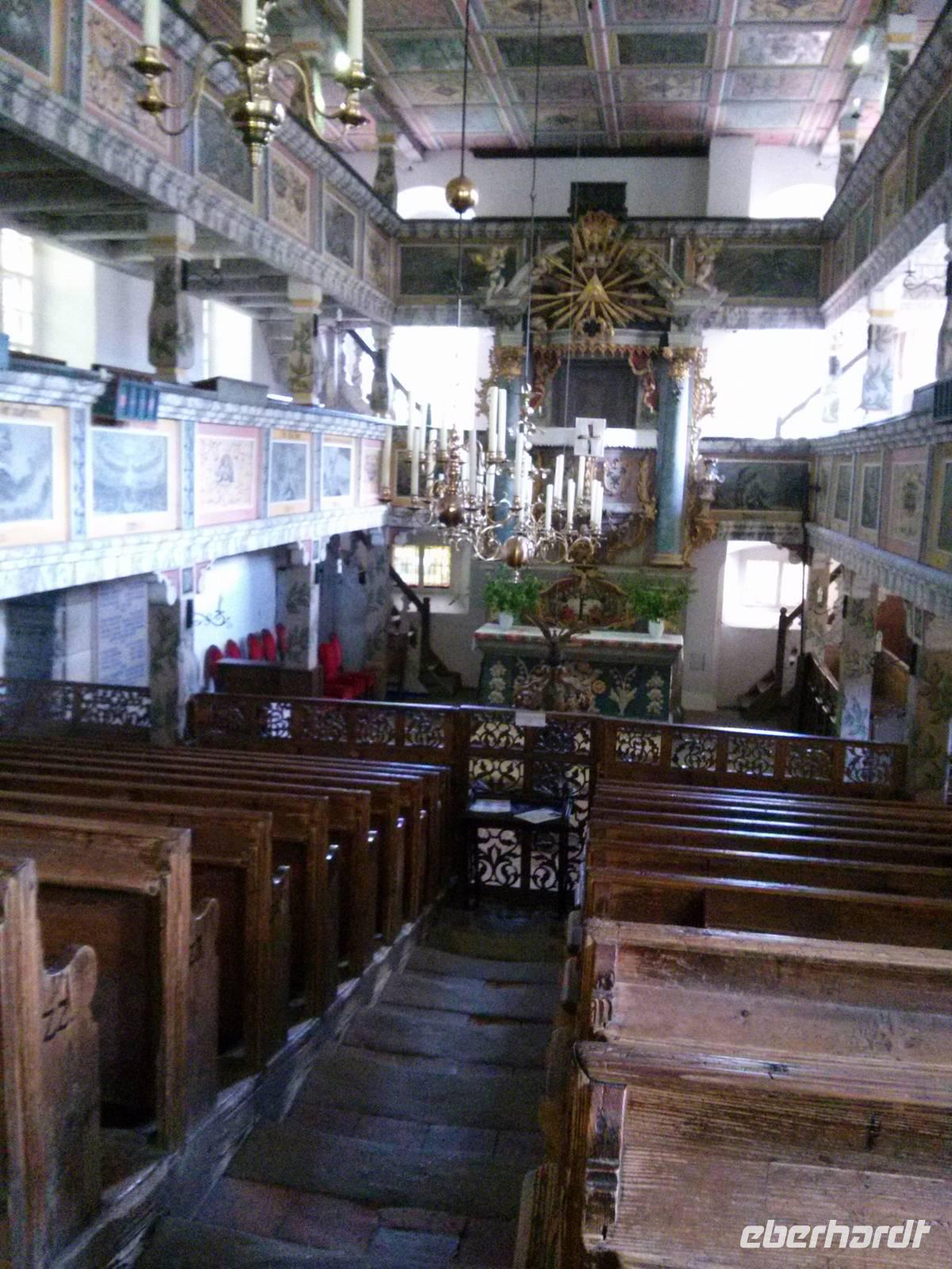 Auf der untersten Empore sind Grisaillenmalereien des Großschönauer Musterzeichners David Christian Berndt angebracht. Auf der vom Altar aus gesehen linken Seite werden Szenen des Alten Testaments, auf der rechten des Neuen Testaments gezeigt. Leider hat es in der Nacht vom 23. Auf den 24. April einen Einbruch in die Kirche gegeben, neben Metalldiebstahl wurden auch zwei der Grisaillenmalereien gestohlen. Die Grisaillenmalereien haben ihren Ursprung in der Damastherstellung, die Malereien dienten als Vorlage für die Stickereien, die auf die Tücher aufgebracht werden sollten.