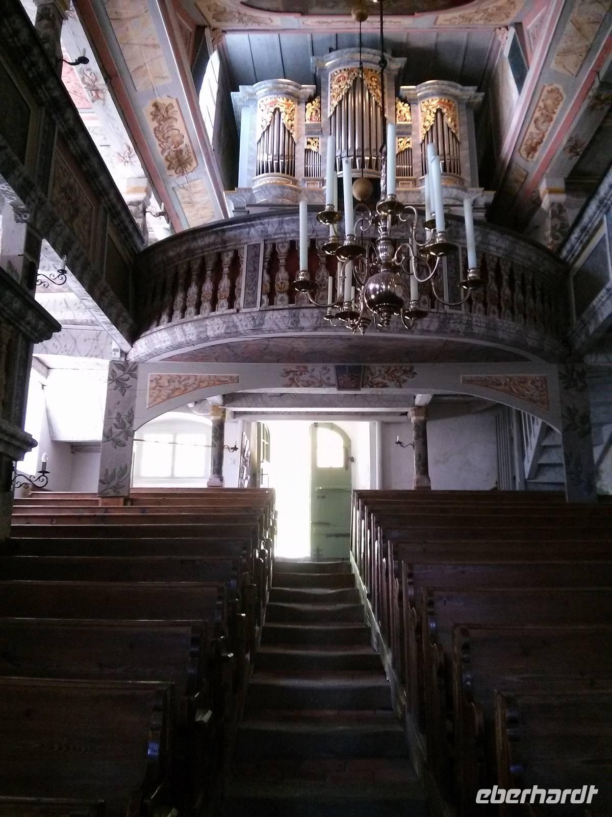 Nach einem herzhaften Frühstück trafen wir uns um 9:30 ("halb zaahne") zur Abfahrt nach Großschöndorf, ins 'Manchester der Oberlausitz', wo wir zunächst die größte Dorfkirche der Lausitz besuchten. Lothar Hommel, Vorsitzender des Fördervereins der evangelischen Kirche, hielt einen Vortrag zur Geschichte der Kirche, die mit ihren drei Emporen mal bis zu 2.000 Besuchern fasste (heute nur noch max. 1.100) und Organist Michael Tittmann spielte auf der Ersatzorgel - die Kirche bekam eben eine neue Orgel, die sich noch im Rohstadium befand - das "Allegro in B-Dur" von Johann Gottfried Walter und den "Pilgermarsch" von Hermann Wenzel.