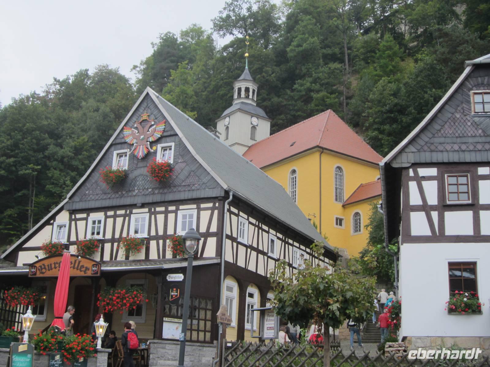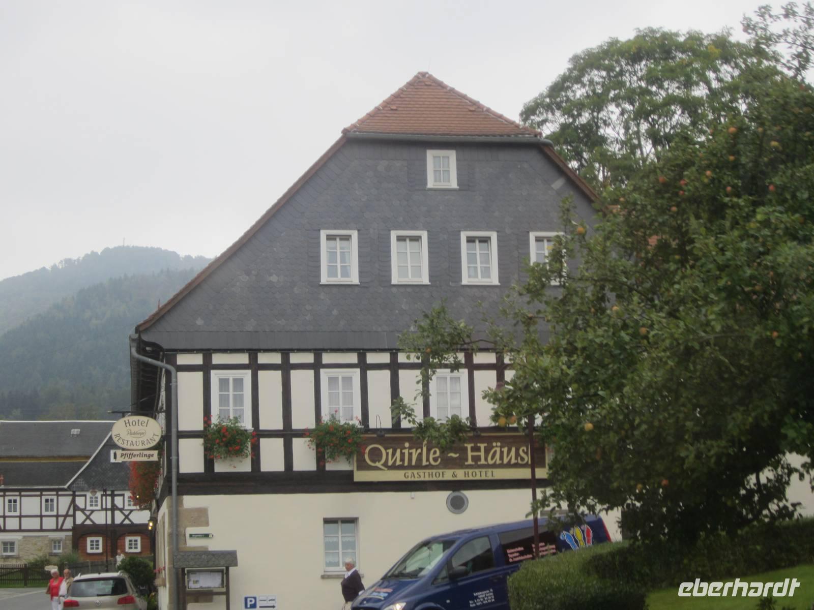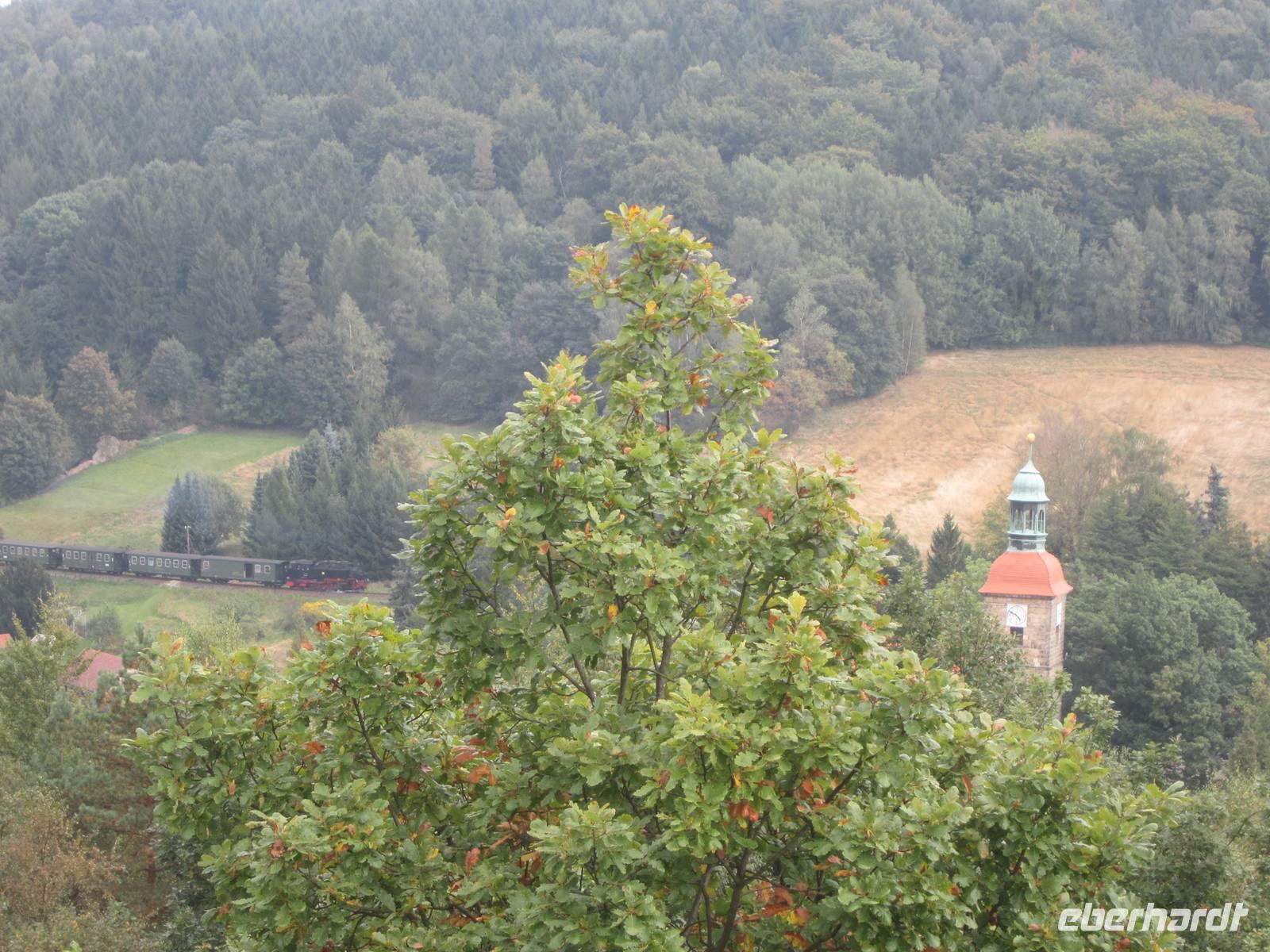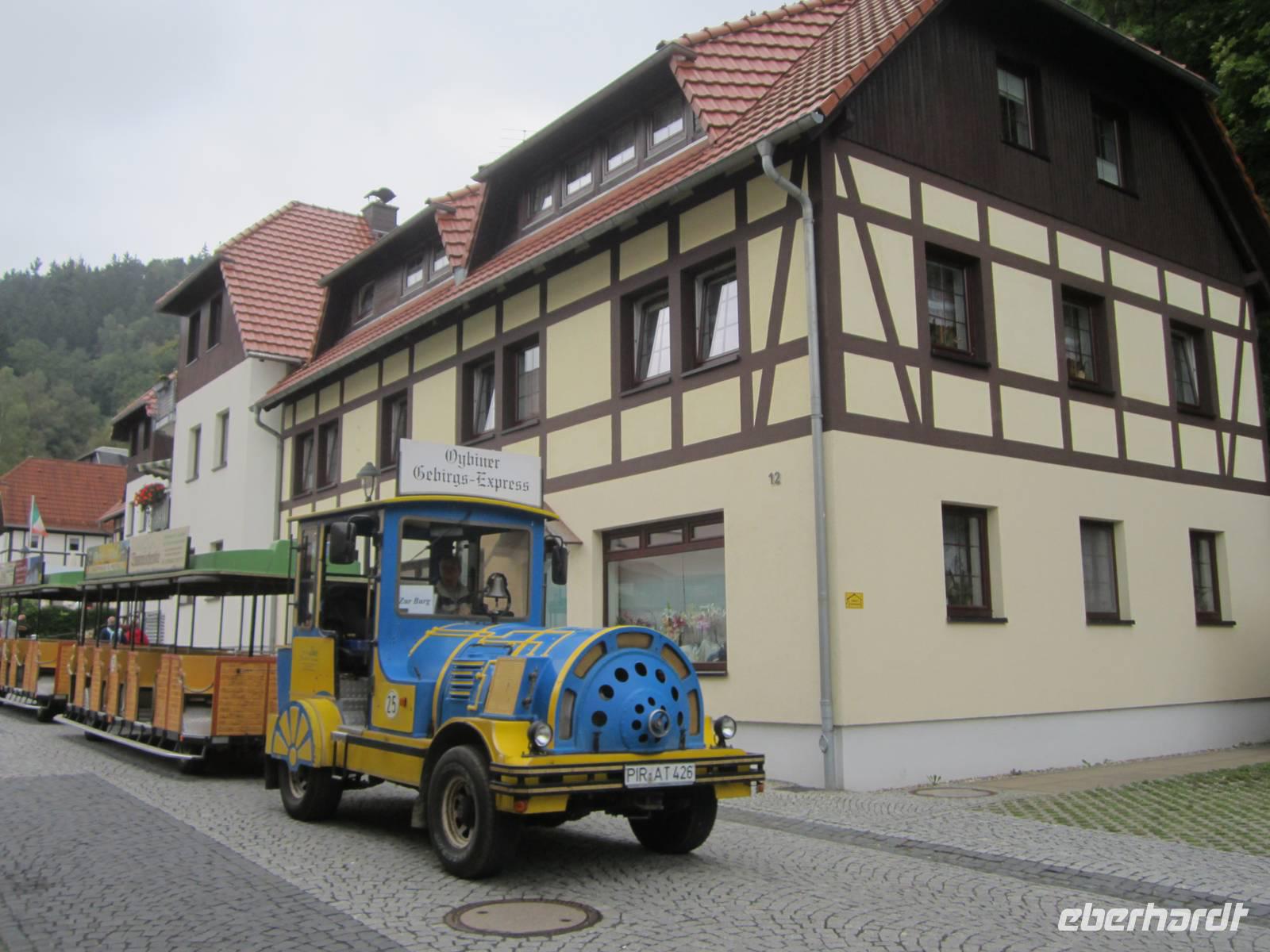 Gegen 14.00 Uhr setzen wir unsere Rundfahrt fort . Wir fahren über Waltersdorf und können immer wieder die schönen Umgebindehäuser sehen und die schönen dazu gehörenden Bauerngärten. Am Quirle-Häuls vorbei, nach Großschönau ins 'Manchester der Oberlausitz',. Hier geht's zum Werksverkauf von Frottana und mach einer von uns kam mit neuen Handtüchern zurück . Auf der weiteren Fahrt durch das Zittauer Gebirge kommen wir durch Bertsdorf , dem schönsten Dorf von Sachsen und weiter entlang der Lückendorfer Rennstrecke, die durch das Bergrennen bekannt ist. Eine geologische Besonderheit sehen wir noch vor Oybin, die Rosensteine. Eine besondere Formation ist der Kelch. Gegen 15.30 Uhr sind wir in Oybin angekommen und erleben als erstes die Zittauer Schmalspurbahn. Die mit Volldampf zwischen Zittau, Olbersdorf und den Kurorten Oybin und Jonsdorf verkehrt. Unser Spaziergang durch Oybin endet an der Bergkirche oder auch "Hochzeitskirchlein" wie sie genannt wird . Auf dem Berg Oybin erkennen wir die Burg- und Klosteranlage, die an die Geschichte des Ortes erinnert.