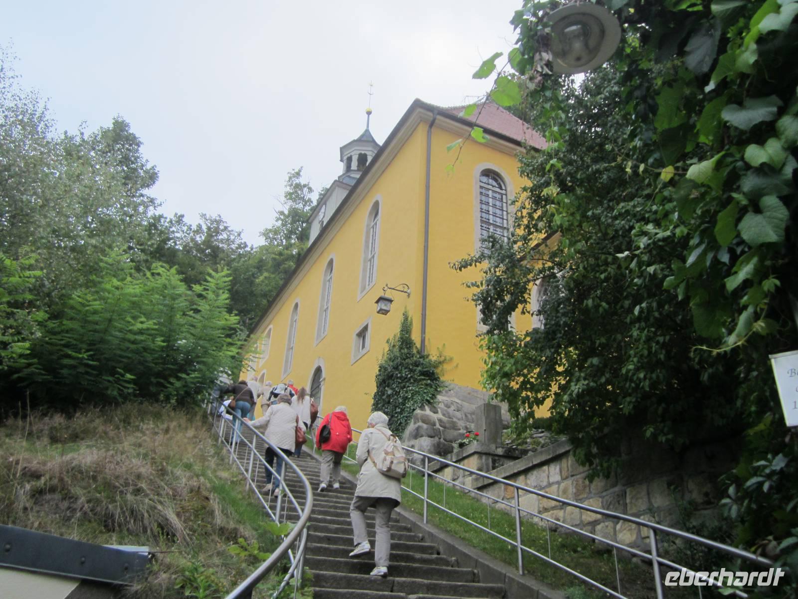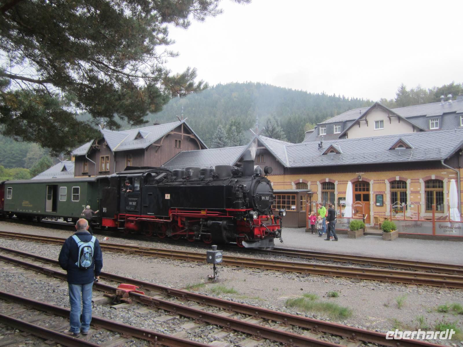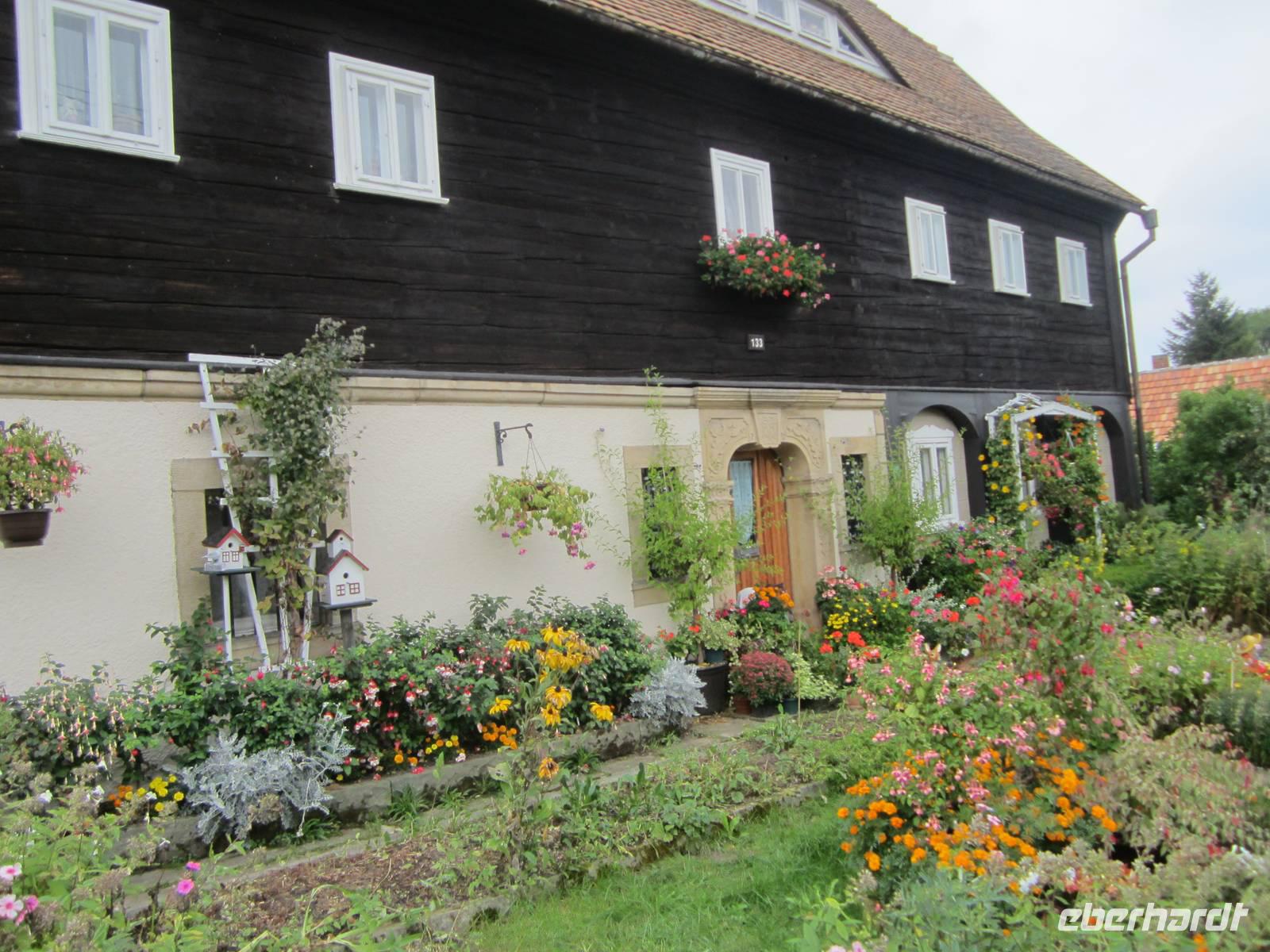 Gegen 14.00 Uhr setzen wir unsere Rundfahrt fort . Wir fahren über Waltersdorf und können immer wieder die schönen Umgebindehäuser sehen und die schönen dazu gehörenden Bauerngärten. Am Quirle-Häuls vorbei, nach Großschönau ins 'Manchester der Oberlausitz',. Hier geht's zum Werksverkauf von Frottana und mach einer von uns kam mit neuen Handtüchern zurück . Auf der weiteren Fahrt durch das Zittauer Gebirge kommen wir durch Bertsdorf , dem schönsten Dorf von Sachsen und weiter entlang der Lückendorfer Rennstrecke, die durch das Bergrennen bekannt ist. Eine geologische Besonderheit sehen wir noch vor Oybin, die Rosensteine. Eine besondere Formation ist der Kelch. Gegen 15.30 Uhr sind wir in Oybin angekommen und erleben als erstes die Zittauer Schmalspurbahn. Die mit Volldampf zwischen Zittau, Olbersdorf und den Kurorten Oybin und Jonsdorf verkehrt. Unser Spaziergang durch Oybin endet an der Bergkirche oder auch "Hochzeitskirchlein" wie sie genannt wird . Auf dem Berg Oybin erkennen wir die Burg- und Klosteranlage, die an die Geschichte des Ortes erinnert.