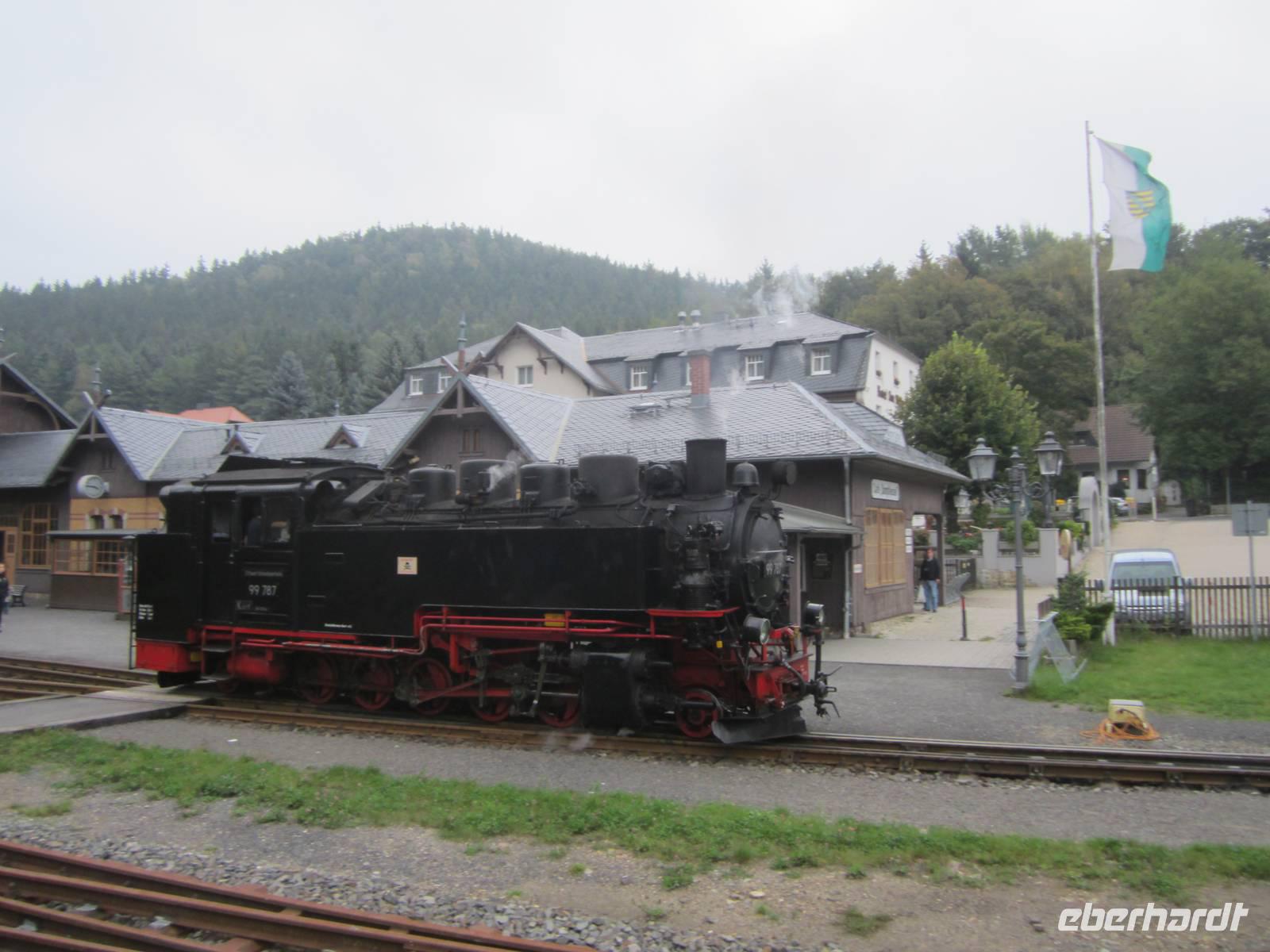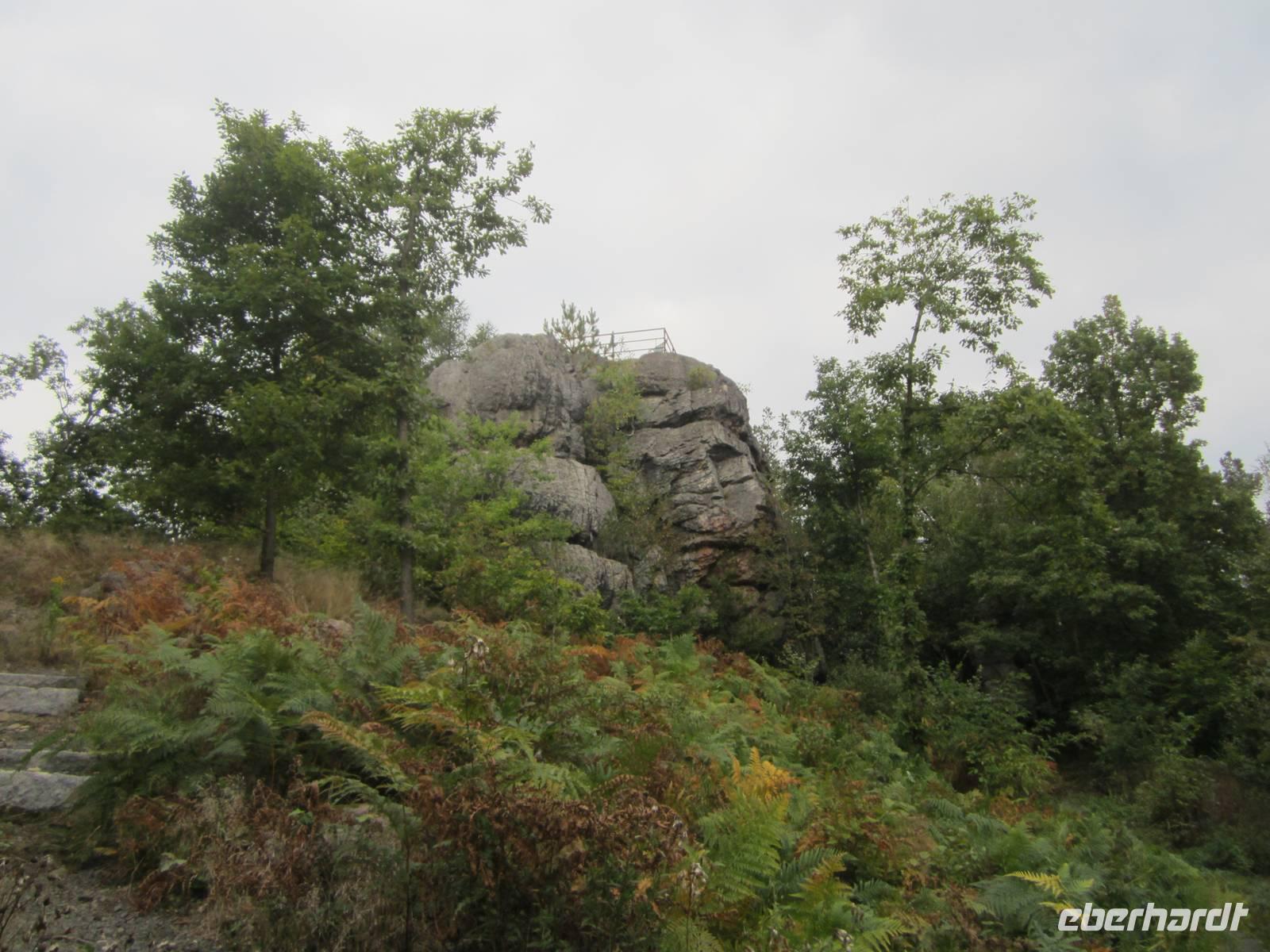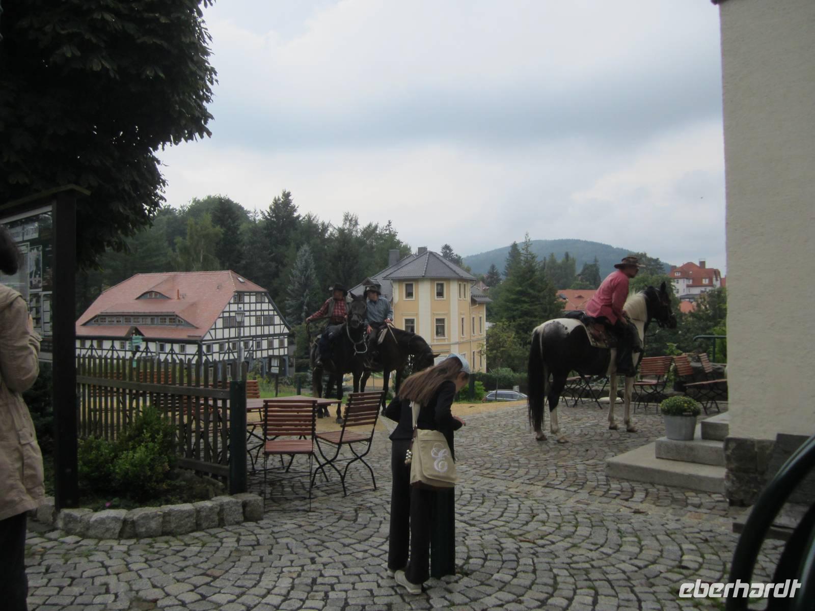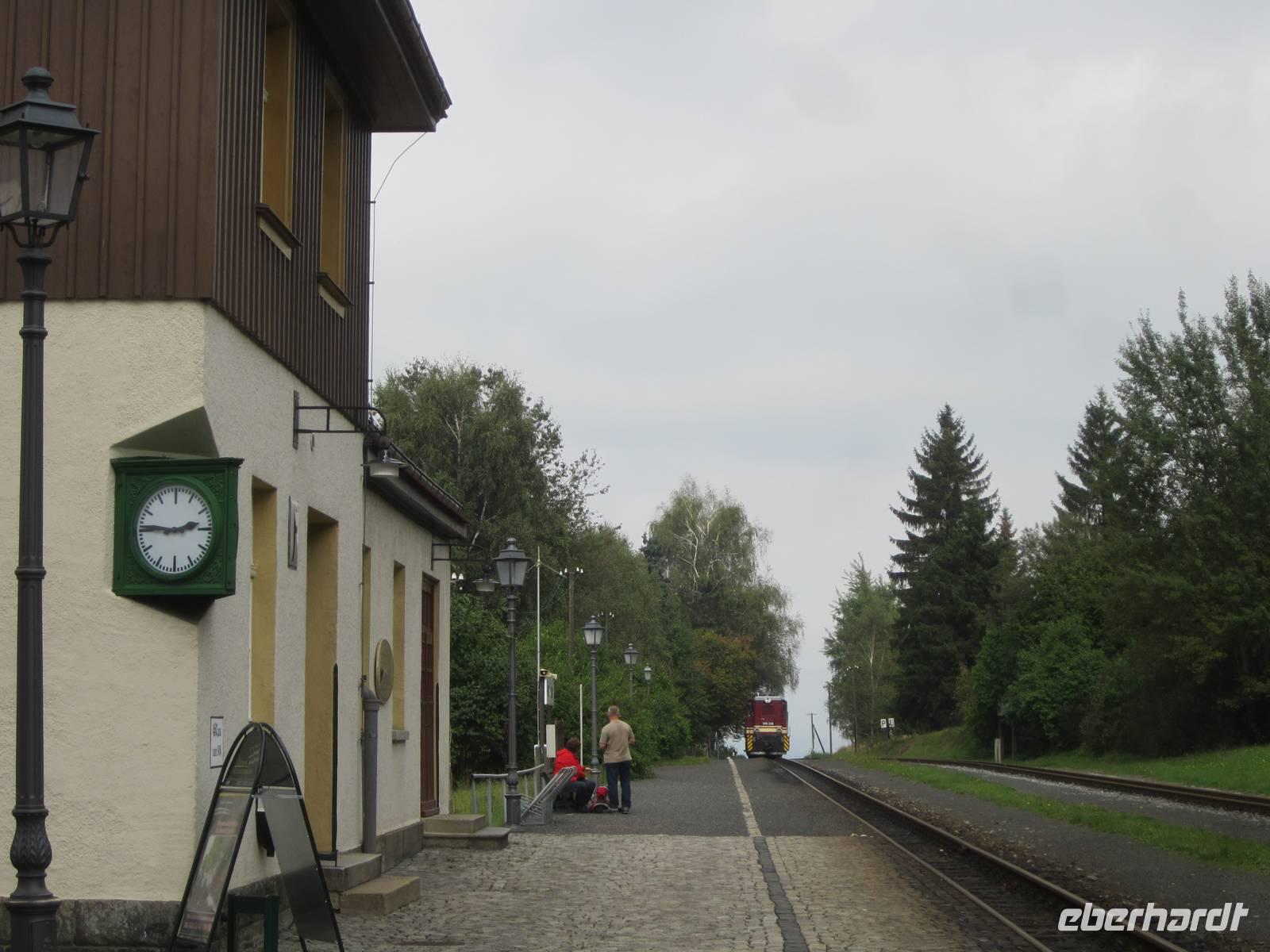 Gegen 14.00 Uhr setzen wir unsere Rundfahrt fort . Wir fahren über Waltersdorf und können immer wieder die schönen Umgebindehäuser sehen und die schönen dazu gehörenden Bauerngärten. Am Quirle-Häuls vorbei, nach Großschönau ins 'Manchester der Oberlausitz',. Hier geht's zum Werksverkauf von Frottana und mach einer von uns kam mit neuen Handtüchern zurück . Auf der weiteren Fahrt durch das Zittauer Gebirge kommen wir durch Bertsdorf , dem schönsten Dorf von Sachsen und weiter entlang der Lückendorfer Rennstrecke, die durch das Bergrennen bekannt ist. Eine geologische Besonderheit sehen wir noch vor Oybin, die Rosensteine. Eine besondere Formation ist der Kelch. Gegen 15.30 Uhr sind wir in Oybin angekommen und erleben als erstes die Zittauer Schmalspurbahn. Die mit Volldampf zwischen Zittau, Olbersdorf und den Kurorten Oybin und Jonsdorf verkehrt. Unser Spaziergang durch Oybin endet an der Bergkirche oder auch "Hochzeitskirchlein" wie sie genannt wird . Auf dem Berg Oybin erkennen wir die Burg- und Klosteranlage, die an die Geschichte des Ortes erinnert.