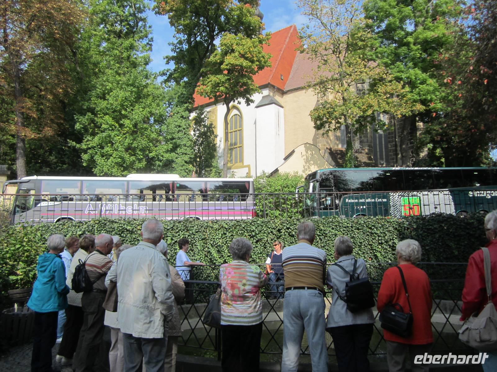 Wir starten unsere Reise in Chemnitz bereits gegen 8.00 Uhr. In Dresden am Flughafen ist unsere Gruppe komplett. 22 Gäste haben sich für die Reise entschieden. Frank vom Unternehmen Wilhelm kommt aus der Oberlausitz und ist für uns ein sehr sachkundiger Begleiter. Auf der A 4 entlang fahren wir nach Bautzen. Schon auf der Autobahn können wir den der Beschriftung auf den Infotafeln entnehmen, dass wir in das Zentrum der Oberlausitzer Sorben kommen. Die vieltürmige Stadt wurde bereits 1002 das erstmals erwähnt und 1213 erhielt Bautzen Stadtrecht. Unser Rundgang durch die Stadt führt uns entlang der Reichenstraße mit den schönen stattlichen Bürgerhäusern zum Hauptmarkt. Hier ist nicht nur das barocke Rathaus interessant, sondern auch der Bautzener Senfladen, an dem wir vorbeispazieren um auf den Fleischmarkt zu kommen. Unübersehbar ist hier der Dom St. Petri. Eine der Besonderheiten ist, dass sie seit 1524 Simultankirche für Katholiken und Protestanten ist. Leider können wir nur einen Film zum Inneren der Kirche sehen, da der Dom zurzeit renoviert wird.