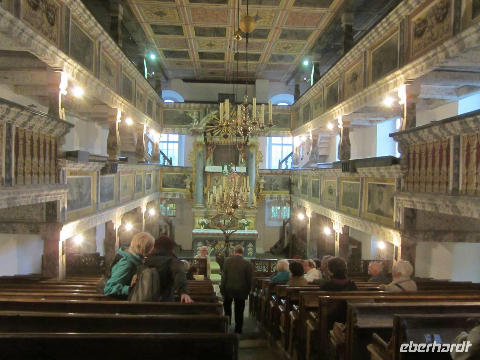 Das Wetter hat sich wieder geändert und somit beginnen wir unsern Tag zur Oberlausitzer Rundfahrt gut gelaunt. Unser Reiseleiter ist heute Gerd Linke. Zuerst haben wir die Kirche in Großschönau auf dem Programm. Wo wir zunächst die größte Dorfkirche der Lausitz besuchten. Der Vorsitzende des Fördervereins der Kirche Lothar Hommel informiert uns zur Geschichte der Kirche. Danach hören wir einige Stücke auf der Ersatzorgel. Eine neue Orgel wird zurzeit eingebaut. Eine Besonderheit ist das Altarbild die Auferstehung Christi Johann Eleazar Zeissig, genannt Schenau der auvh Direktor der Kunstakademie in Dresden war Sein Grabstein sehen wir auf dem Alten Friedhof.
