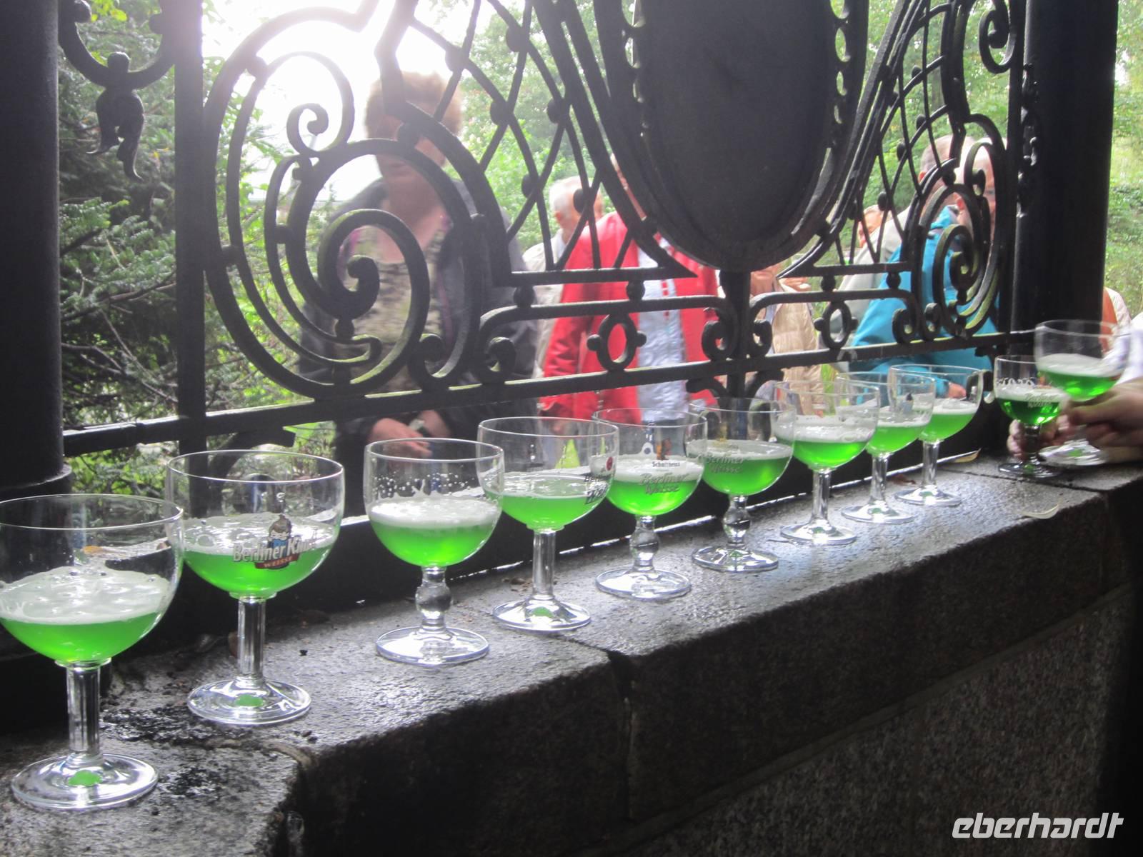 Weiter führt unsere Fahrt über Warnsdorf und Seifhennersdorf .In Neugersdorf erinnert Gerd Link an den Jacobimarkt und da fiel ihn doch gleich die "Altweibermühle" ein. Vorsicht, die Mühle muss sich in die richtige Richtung drehen sonst wird es nichts mit den schönen, jungen Frauen. Weiter geht es zu den Spreequellen. Drei Quellen gibt es. An der Nachgebauten in Ebersbach fahren wir vorbei. Am Spreeborn steigen wir aus und laufen mit "Nante" und dem Leierkasten zur Quelle. Mit einer Berliner Weiße, die aus dem Ententeich stammen soll, halten wir diesen schönen Moment in einem Gruppenfoto fest.