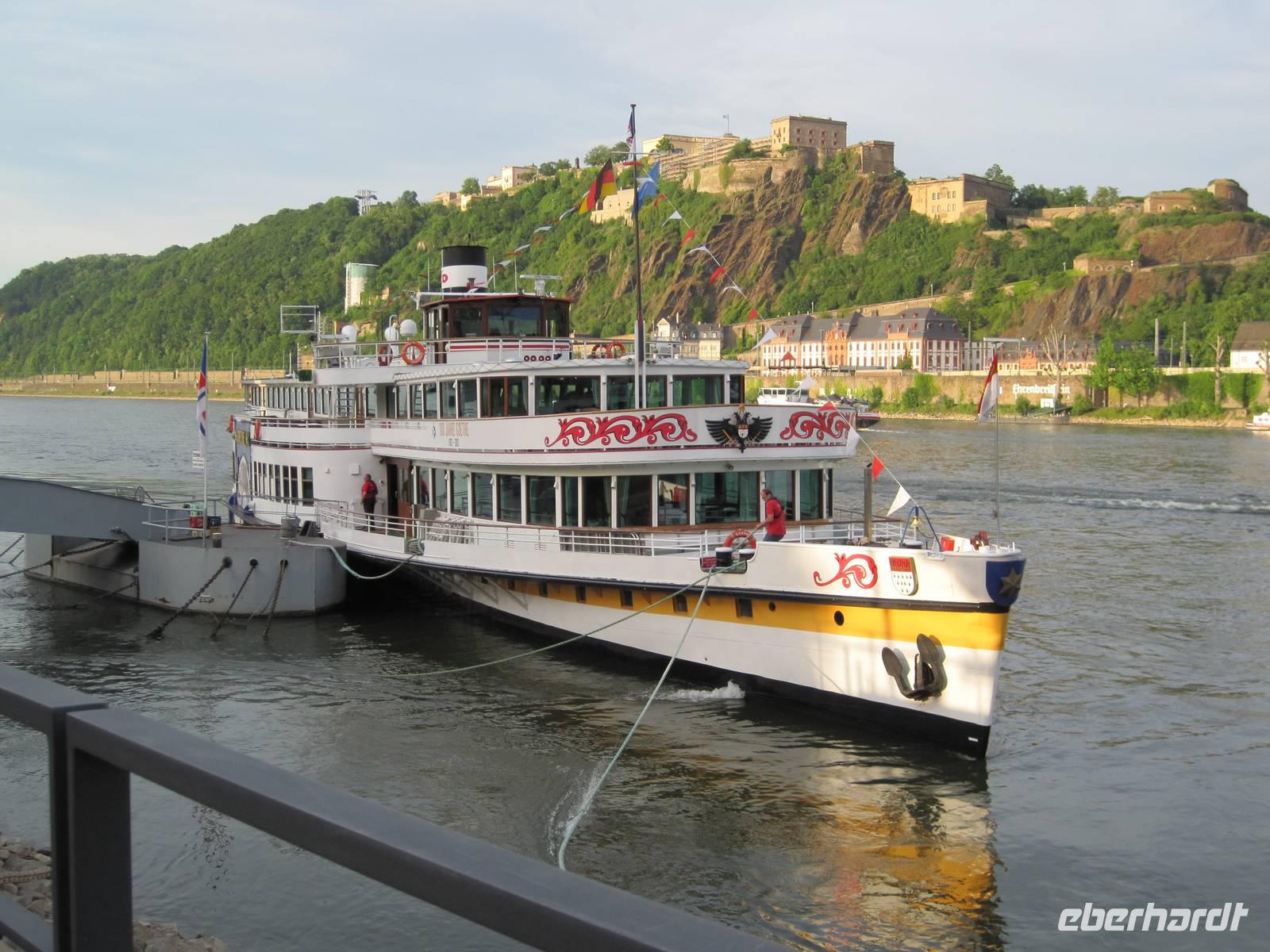 Nach dem ersten gutem Frühstück in unserem Hotel Anker, traten wir die Busfahrt entlang der Mosel, vorbei an dem berühmten Weinort Winningen, nach Koblenz an. Eine Verzögerung beim Treffen mit unserer örtlichen Reiseleiterin brachte zwar eine leichte Umstellung unserer Route in Koblenz ein, aber mit etwas Flexibilität wurde noch ein schöner Stadtrundgang der Stadt Koblenz am Zusammenfluss der Mosel mit dem Rhein kreiert. Der Koblenzer Schengel, der Jesuitenplatz, das Deutsche Eck und weitere einmalige Details der lebenden Stadt Koblenz brachten einen netten Eindruck der Metropole Koblenz. Direkt anschließend traten wir die Fahrt mit der Seilbahn zur Festung Ehrenbreitstein an. Das phantastische Erlebnis mit der zur BUGA 2011 war verbunden mit der Errichtung Seilbahn, mit der diagonalem Überquerung des Rheines in luftiger Höhe von ca. 110 m. Die nette Überraschung, war der traumhaft schöner Ausblick vom Plateau der Burg über dem Rhein mit den Highlights des Deutschen Ecks, der schönen Sicht auf dem Hunsrück und der Eifel in seiner ganzen Schönheit der geographischen Lage. Die Dauerausstellung in den Gebäuden der Burg mit den „ Technischen Meilensteinen der Region Rheinland/Pfalz „ und den Darstellungen der bekanntesten Unesco Welterbeplätze in Deutschland gab uns einen guten Einblick zur Vielfältigkeit der Ausstellungen auf der Festung Ehrenbreitstein. Unsere Busfahrt entlang der rechten Seite des Rheines war die beste Übersicht der Romantik des Mittelrheintales und ein guter Vorgeschmack auf die beabsichtigte Bootsfahrt von Rüdesheim bis zurück nach Koblenz. Nach der Ankunft in Rüdesheim hatte natürlich der Besuch der berühmten Drosselgasse erste Priorität. Die Ansammlung der Kaffes, Hotels, Weinläden und Läden für allerlei Andenken hat sein eigenes Flair. Für einige unserer RG war natürlich der berühmte „ Rüdesheimer Kaffee „ ein besonderes leckeres Erlebnis, das besondere lokale Angebot von Rüdesheim. Die Schifffahrt zurück nach Koblenz entwickelte sich danach zum wirklichen Höhepunkt unseres Tagesausfluges an dem wunderschönen deutschen Rhein. Das traditionelle Schiff der KD-Schifffahrtsgesellschaft „ Goethe „ hatte die würdige Umgebung für diese traumhaft schöne und romantische Schiffsfahrt, vorbei an den vielen Orten und Burgen des wohl wichtigsten deutschen Stromes, dem majestätischen Rhein. Schon die Begrüßung der Schiffsbesatzung mit der Führung zu unseren reservierten Plätzen im Restaurant des Schiffes, war eine willkommende Geste an unsere RG. Das Gedeck zum Kaffe, bestehend aus der „ Rüdesheimer Doppelwaffel „ mit Kirschdessert, war allen Schiffsreisender eine Spitzenleistung. Die während der folgenden Fahrt vielen neuen Ansichten der Umgebung nach jeder Rheinkurve, brachten natürlich alle Fotoliebhaber in freudiger Stimmung und emsiger Aktivität. Nach ca. 4 stündiger, romantischer Schiffsfahrt bis nach Koblenz hatten jedoch alle RG genügend Appetit und Hunger auf das verspätete, aber besonders leckere Abendessen in unserem Hotel. Die Freude unserer Gäste über den Tagesausflug war der offensichtliche und willkommene Dank für die Erlebnisse am wunderschönen Rhein mit der Region des Weltkulturerbes.