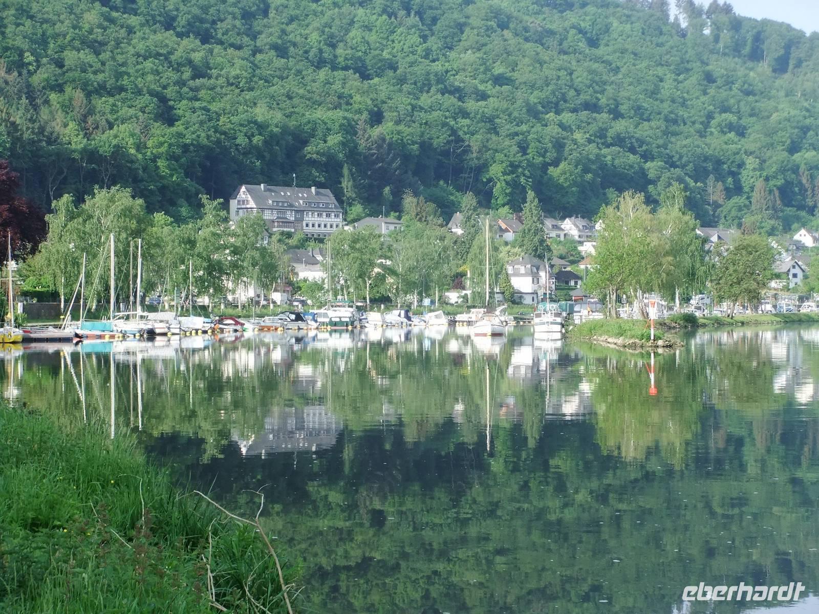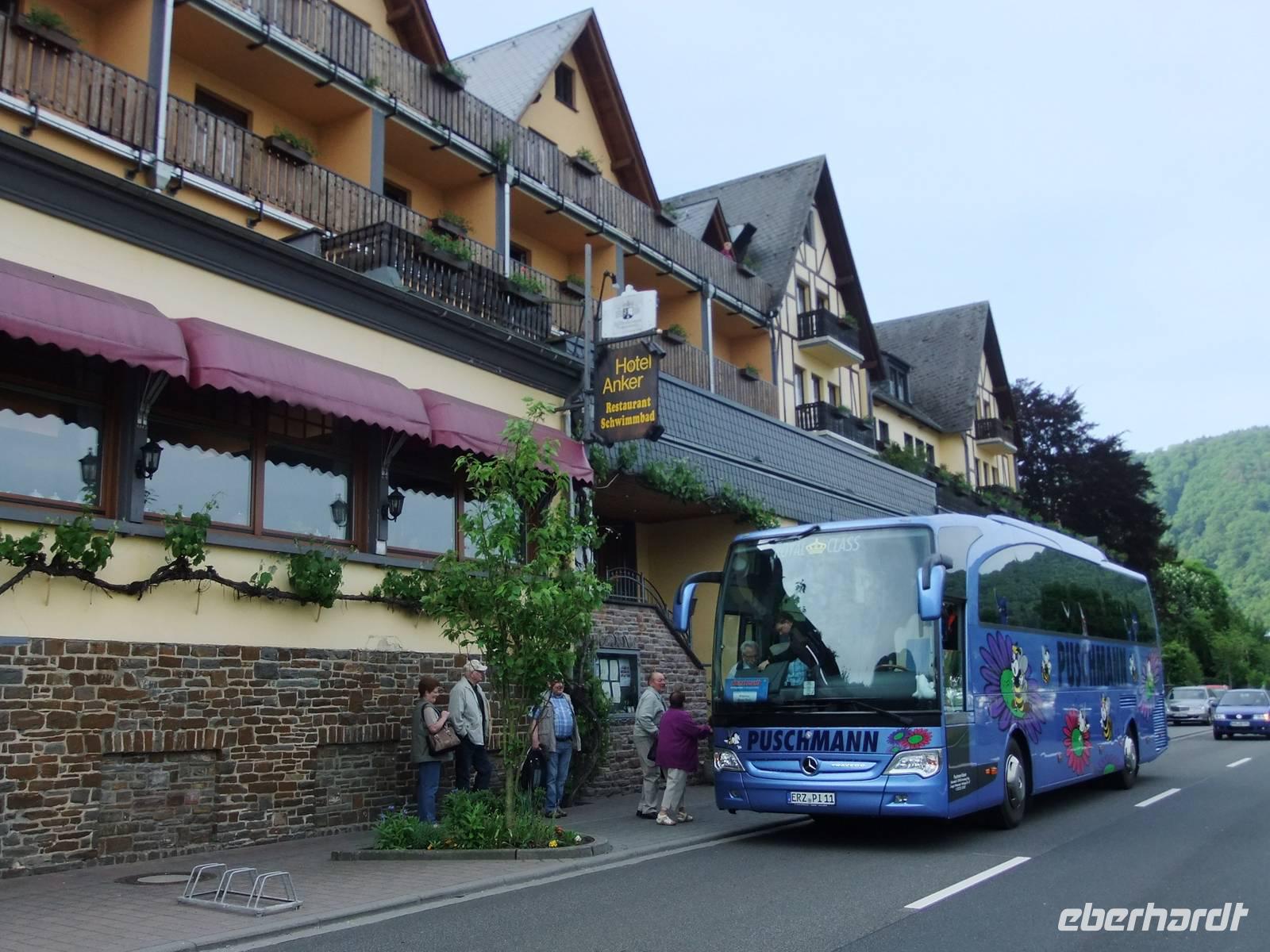 Voller Vorfreude starten 30 Reisegäste mit Chauffeur Ingo und mir Richtung Westen. Vorbei geht es am Thüringer Wald und durch Hessen. Dann haben wir schon bald das Lahntal erreicht und können kurz darauf auch über den Rhein fahren. An der 136 m hohen Moseltalbrücke machen wir unsere letzte Pause und werfen wir einen ersten Blick auf den Fluss, an dessen Ufer wir die die nächsten Nächte wohnen werden. Ziel ist das Moselstädtchen Brodenbach. Schon seit vielen Jahren kommen Eberhardt-Reisegäste hier ins Hotel „Anker". Vom Chef des Hauses werden wir schon erwartet. Schnell sind die Schlüssel verteilt und die Zimmer bezogen. Zum Abendessen treffen wir uns alle wieder und lassen uns mit Hausmannskost verwöhnen. Danach unternehmen die meisten Gäste noch einen kleinen Verdauungsspaziergang an der Mosel.