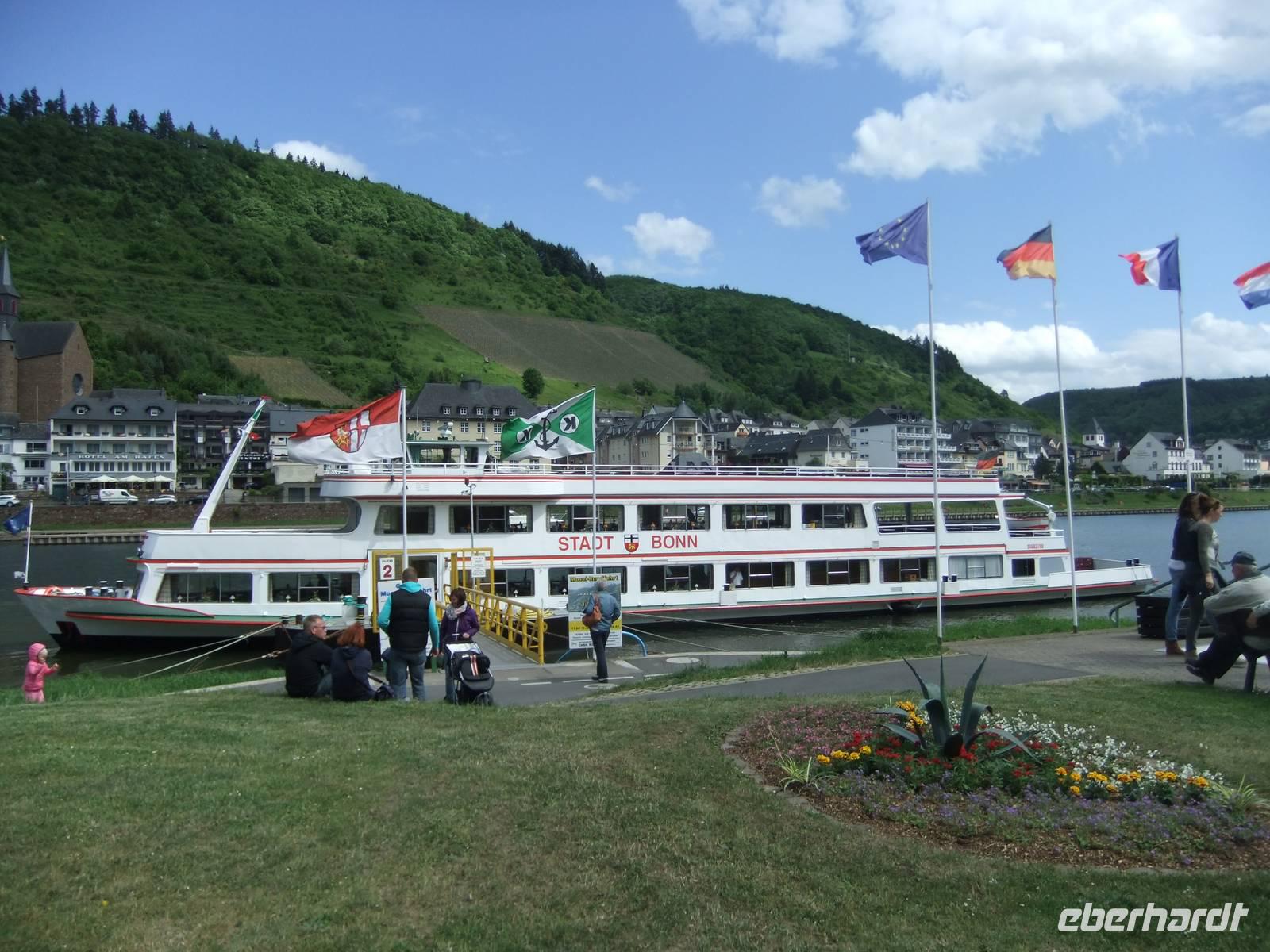 Nun geht es wieder an die Mosel, denn Cochem ist unser nächstes Ziel. Schon von weitem können wir die Reichsburg hoch über der Stadt sehen. Wir haben Zeit für einen Spaziergang dort hinauf, auch für die Fahrt mit dem kleinen Touristenzug oder einen Bummel durch die Gassen. Dann treffen wir uns am Schiffsanleger. Mit der „Stadt Bonn" unternehmen wir eine einstündige Fahrt auf der Mosel.