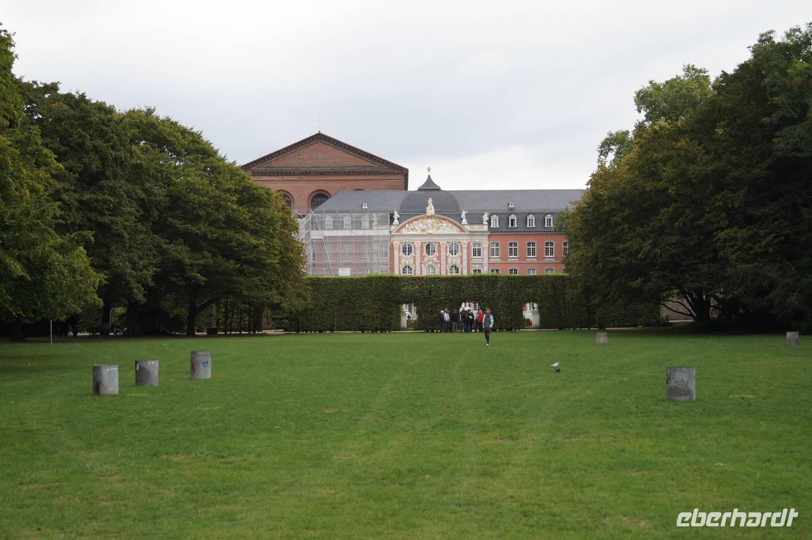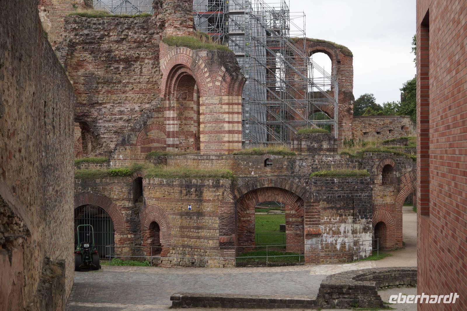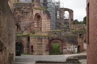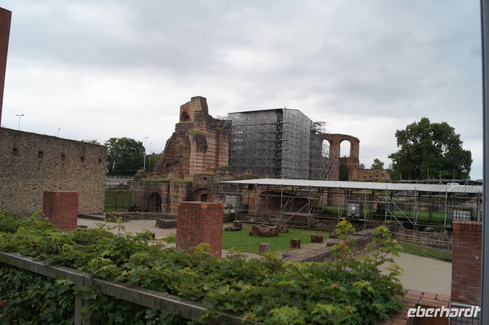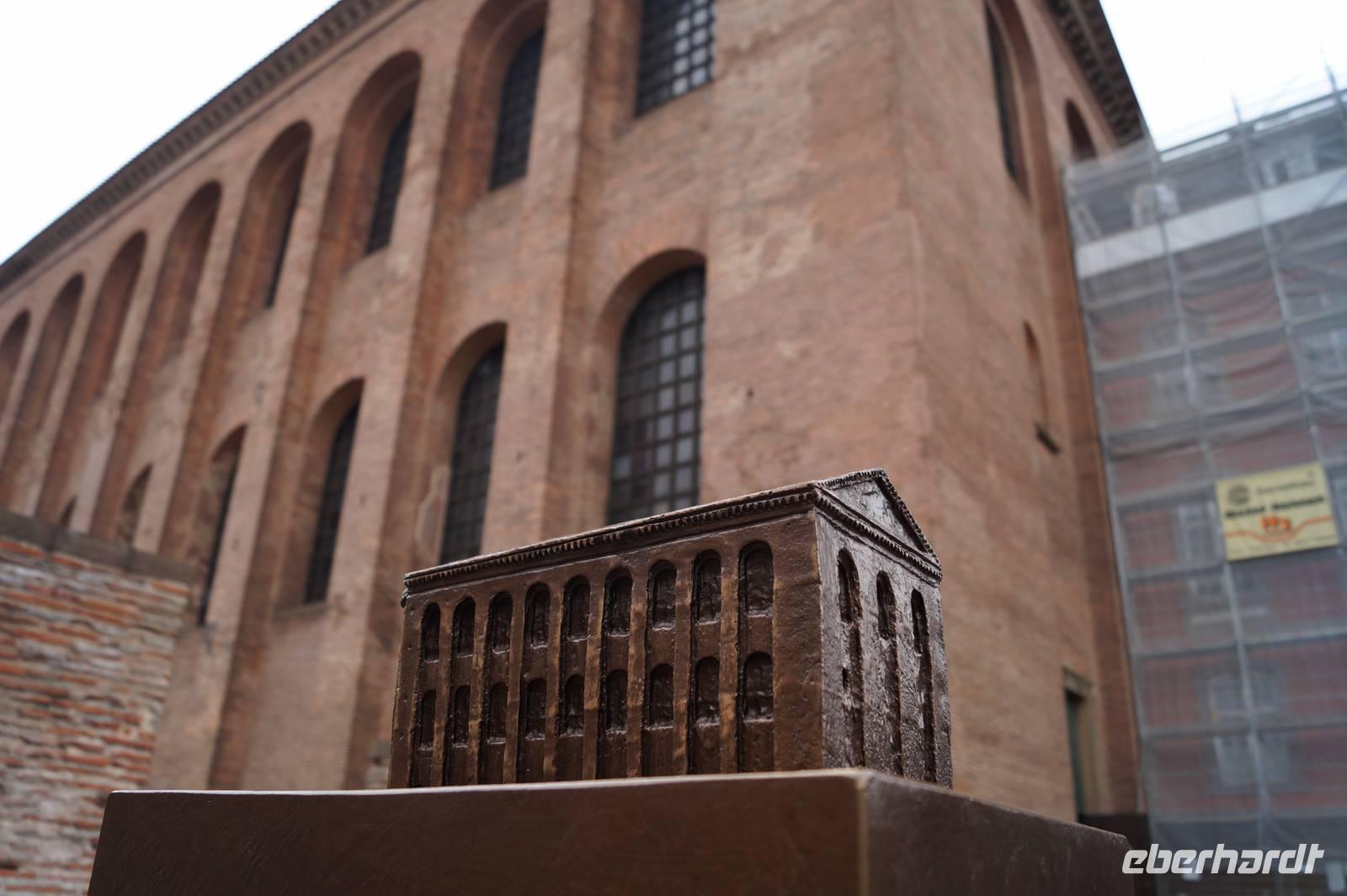 Von Simeonsstift und Porta Nigra, jenem im Mittelalter zur Kirche umgebauten römischen Stadttor, folgten wir der Simeonsstraße bis zum Markt (vorbei am Elternhaus des späteren Begründers des Marxismus Karl M. und am Warenhaus der Kölner Händler, benannt nach den Stadtpatronen von Köln: Dreikönigenhaus). Von dort aus führte uns unser Weg zu Dom und Liebfrauenkirche, vorbei auch am Palais Kesselstatt zur Aula Regia (Konstantinsbasilika), welche in den Barockpalast des Trierer Erzbischofs und Kurfürsten einbezogen worden ist. Hier wurden uns Hypokaust (antike Fußbodenheizung) und Wandheizung nebst Abzügen erklärt, ebenso, wie man mit dem Spiel der Fenstergrößen Raumwirkung erzielte.