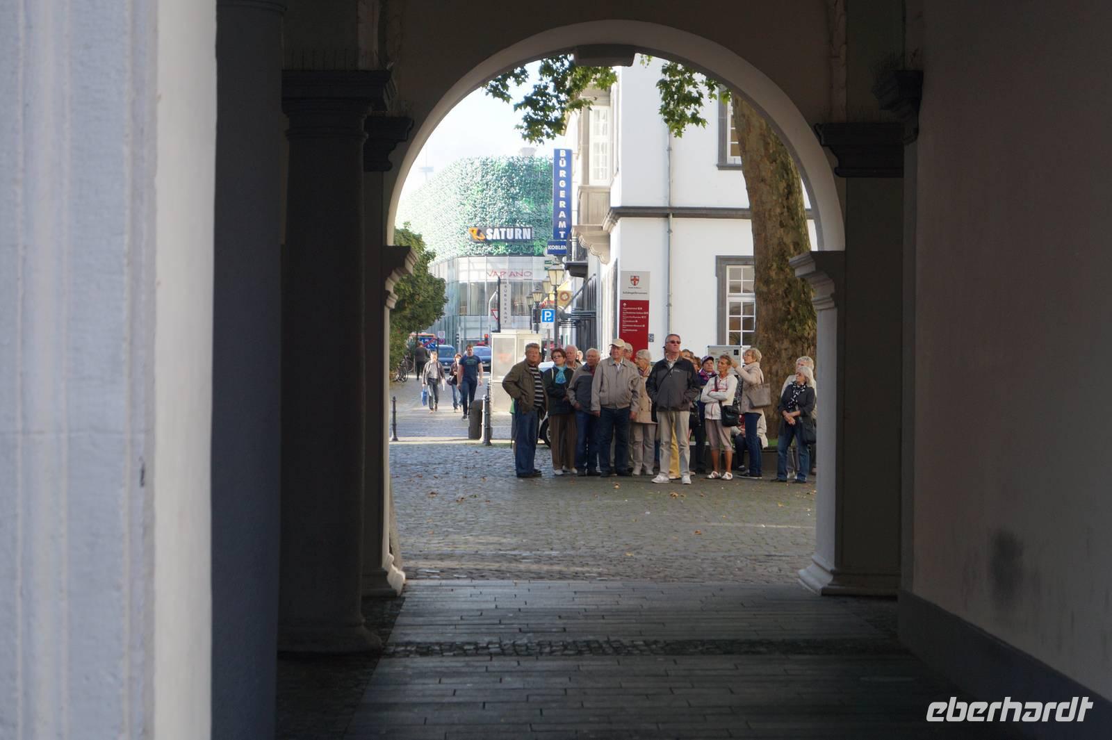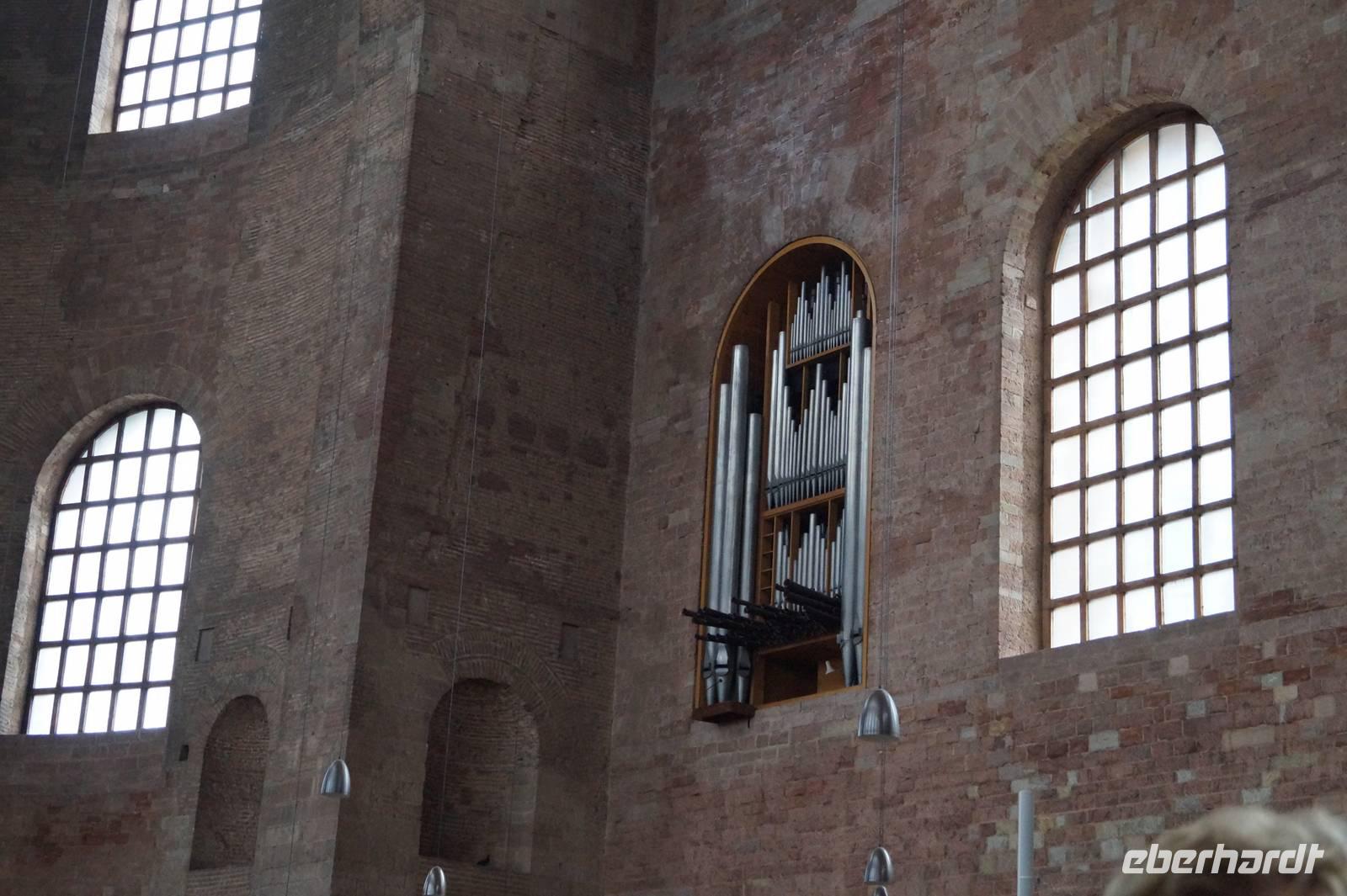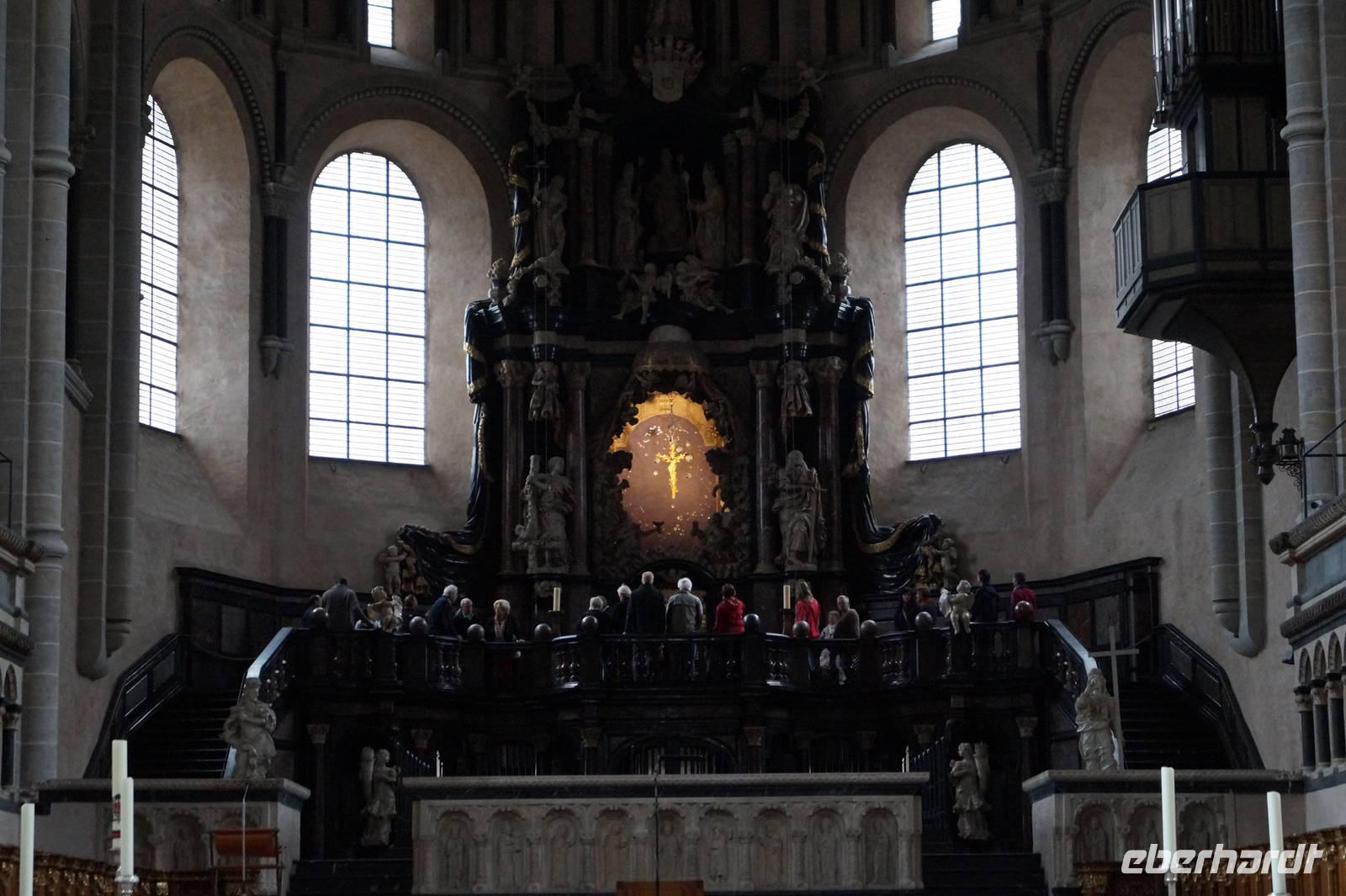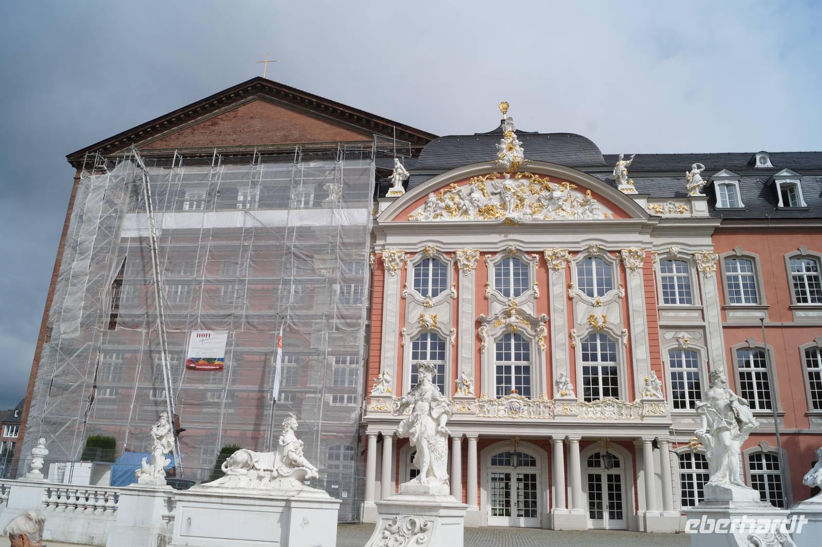 Von Simeonsstift und Porta Nigra, jenem im Mittelalter zur Kirche umgebauten römischen Stadttor, folgten wir der Simeonsstraße bis zum Markt (vorbei am Elternhaus des späteren Begründers des Marxismus Karl M. und am Warenhaus der Kölner Händler, benannt nach den Stadtpatronen von Köln: Dreikönigenhaus). Von dort aus führte uns unser Weg zu Dom und Liebfrauenkirche, vorbei auch am Palais Kesselstatt zur Aula Regia (Konstantinsbasilika), welche in den Barockpalast des Trierer Erzbischofs und Kurfürsten einbezogen worden ist. Hier wurden uns Hypokaust (antike Fußbodenheizung) und Wandheizung nebst Abzügen erklärt, ebenso, wie man mit dem Spiel der Fenstergrößen Raumwirkung erzielte.