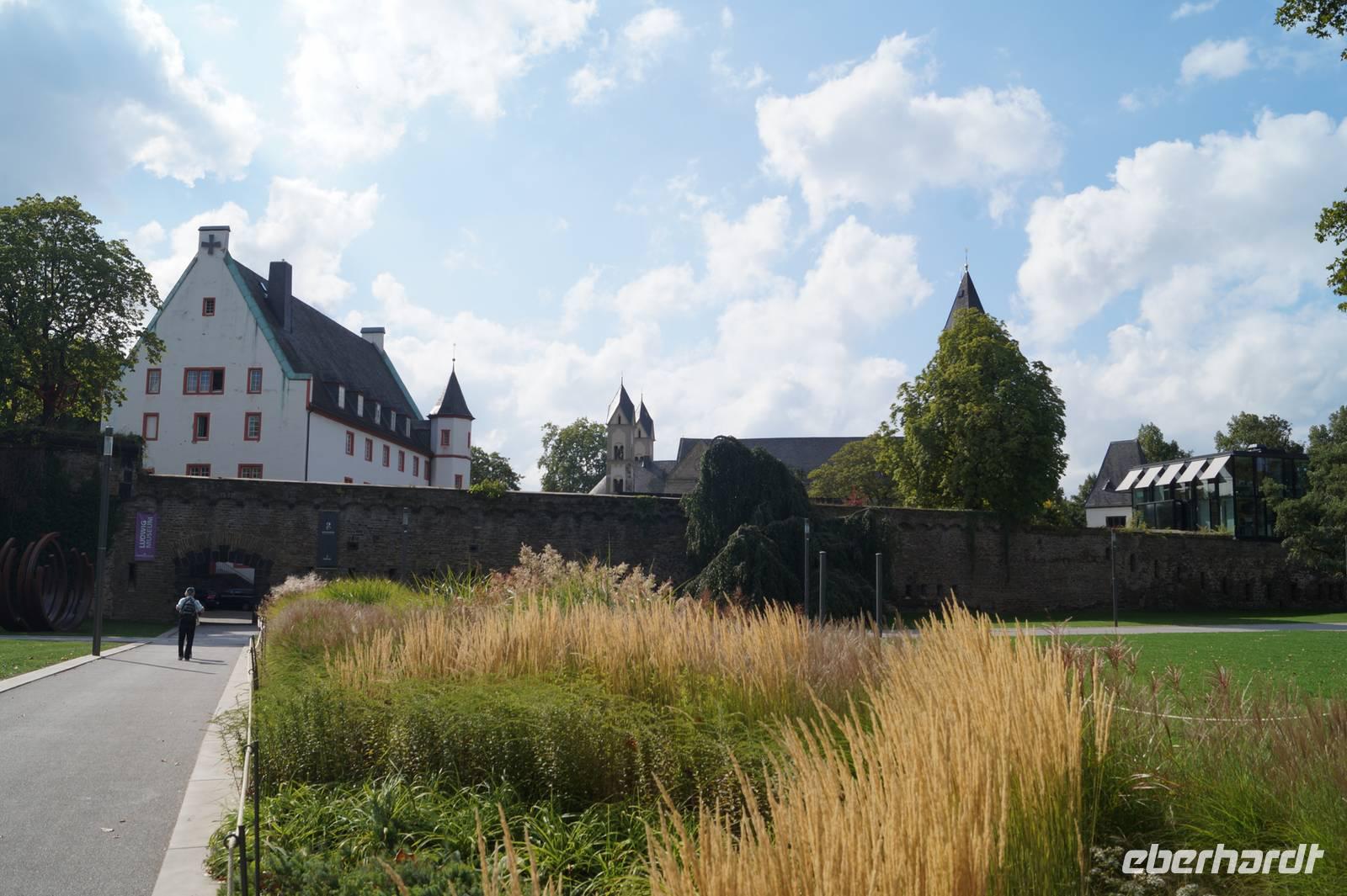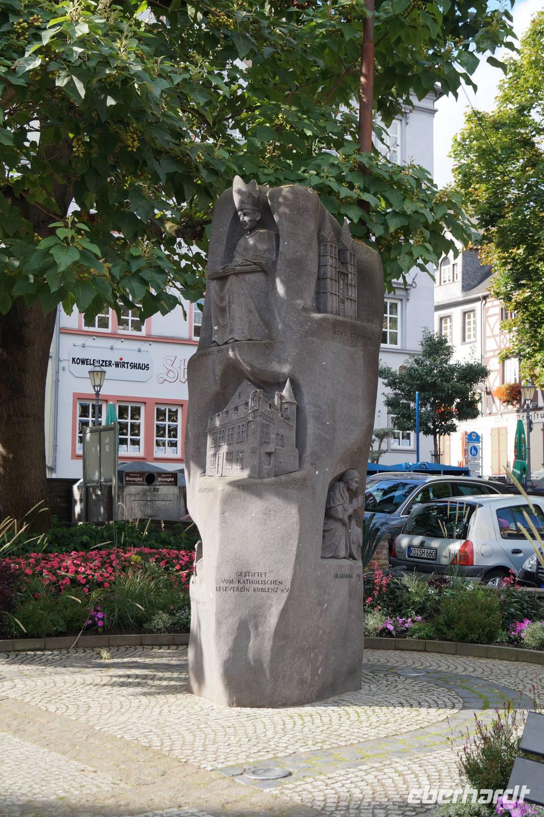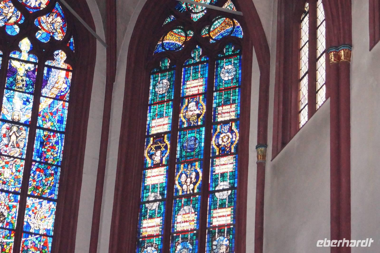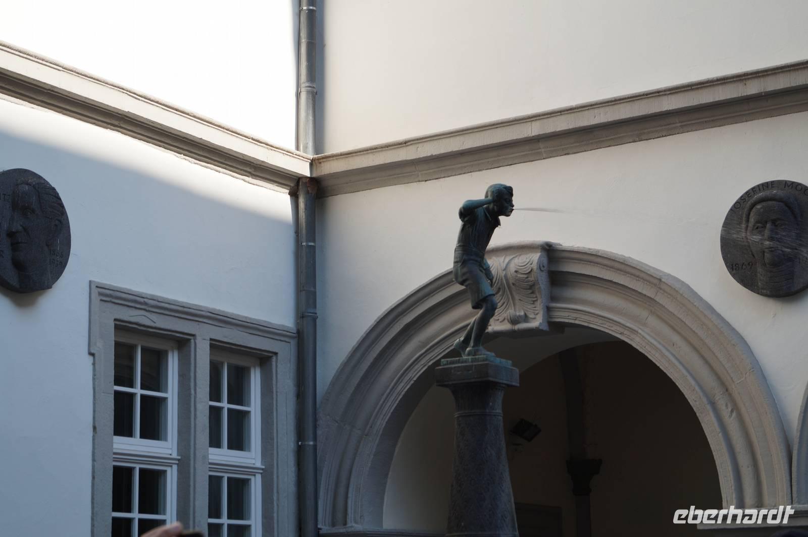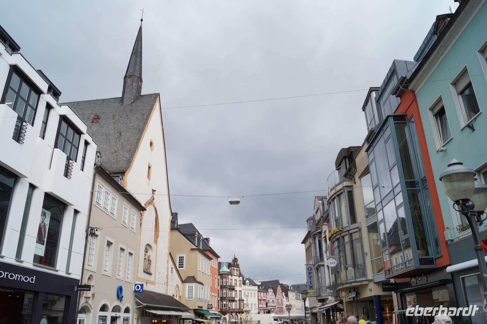 Am Morgen teilten wir uns wieder in zwei Gruppen auf, um an den jeweiligen Führungen durch Koblenz, dem lateinischen Confluentia ('Zusammenfluss') teilzunehmen, die uns durch die Stadt führten. Wir sahen das Jesuitengymnasium, den Verlauf der römischen Stadtmauer und die Deutschordensballei am Deutschen Eck (dieses hat seinen Namen von der Ballei, nicht etwa von den wilhelminischen Monumentalbauten am Zusammenfluss von Mosel und Rhein). An der Florinskirche, die als Stiftskirche nach der Säkularisation erst zum Pferdestall und später zur preußischen Garnisonskirche wurde - und daher heute eine protestantische Kirche ist - sahe wir das Kauf- und Danzhaus mit dem Augenroller und in der Liebfrauenkirche das Fenster, in dem neben Mutter Theresa und Edith Stein auch Sophie Scholl zu sehen ist: Eine Protestantin in einem Fenster einer katholischen Kirche.