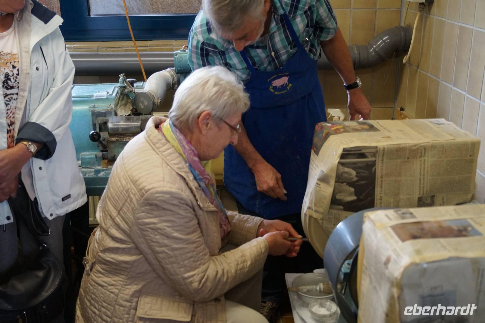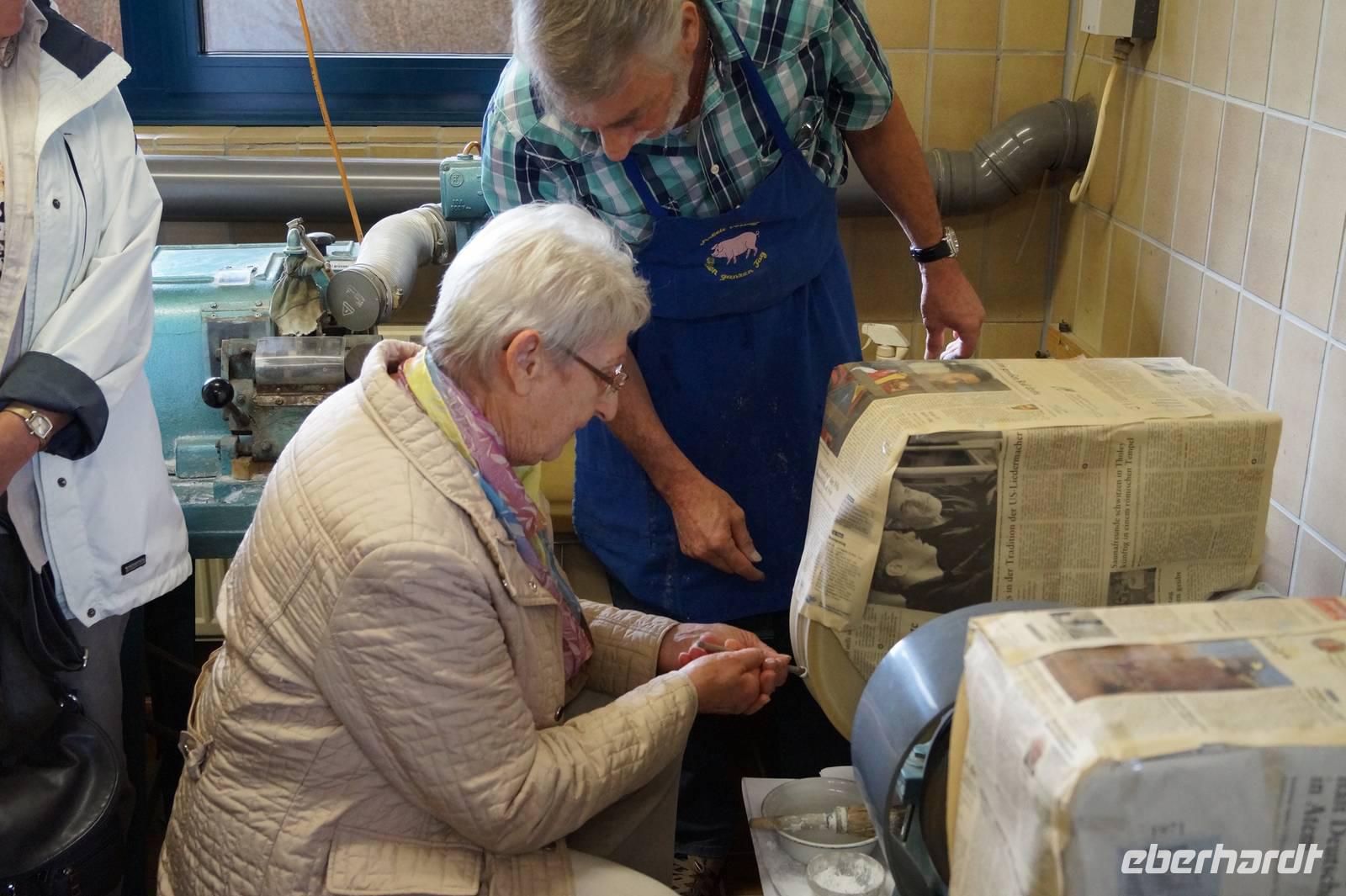 Im Anschluss an den Aufenthalt in Trier kehrten wir über den Hunsrück nach Brodenbach zurück. Hier im Hunsrück, in einem der Dörfer, welche zusammen die Stadt Idar-Oberstein bilden, jener Stadt, in der Sich Goldschmiede und Edelsteinschleifer ansiedelten, besuchten wir eine Edelsteinschleiferei, wo wir nicht nur der Schleifung eines Edelsteins beiwohnten sondern auch eine Teilnehmerin der Reise selbst einen Dalmatinerjaspis, der aufgrund seiner hellen Grundfarbe und seiner schwarzen Flecken so heißt, unter Anleitung des Meisters schliff.