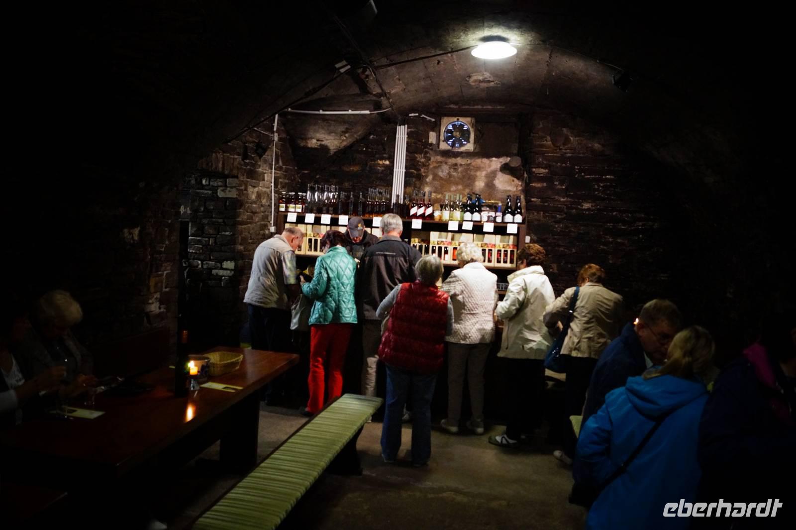 Letzte Station des heutigen Tages war die Weinkellerei Hammes in Alken, wo sich der Jungwinzer, der unsere Weinprobe leitete, als Lausitzer Jung entpuppte, der sich bei einem Urlaub in der Moselregion in seiner Kindheit in den Kopf gesetzt hatte, Winzer zu werden und dies nach erfolgreich bestandenem Abitur dann auch ebenso erfolggreich in die Tat umsetzte. Zu jedem Wein und auch zur Weinlese hatte er etwas zu berichten und er erklärte uns die Unterschiede zwischen Qualitätswein, Spätlese und Eiswein, aber auch, welche Rebe am besten zu welcher Zeit geerntet würde, und dass die Pflücker auch immer einen Rest von Trauben an den Reben beließen, für Eichhörnchen, Rehe, Wildschweine und Touristen...