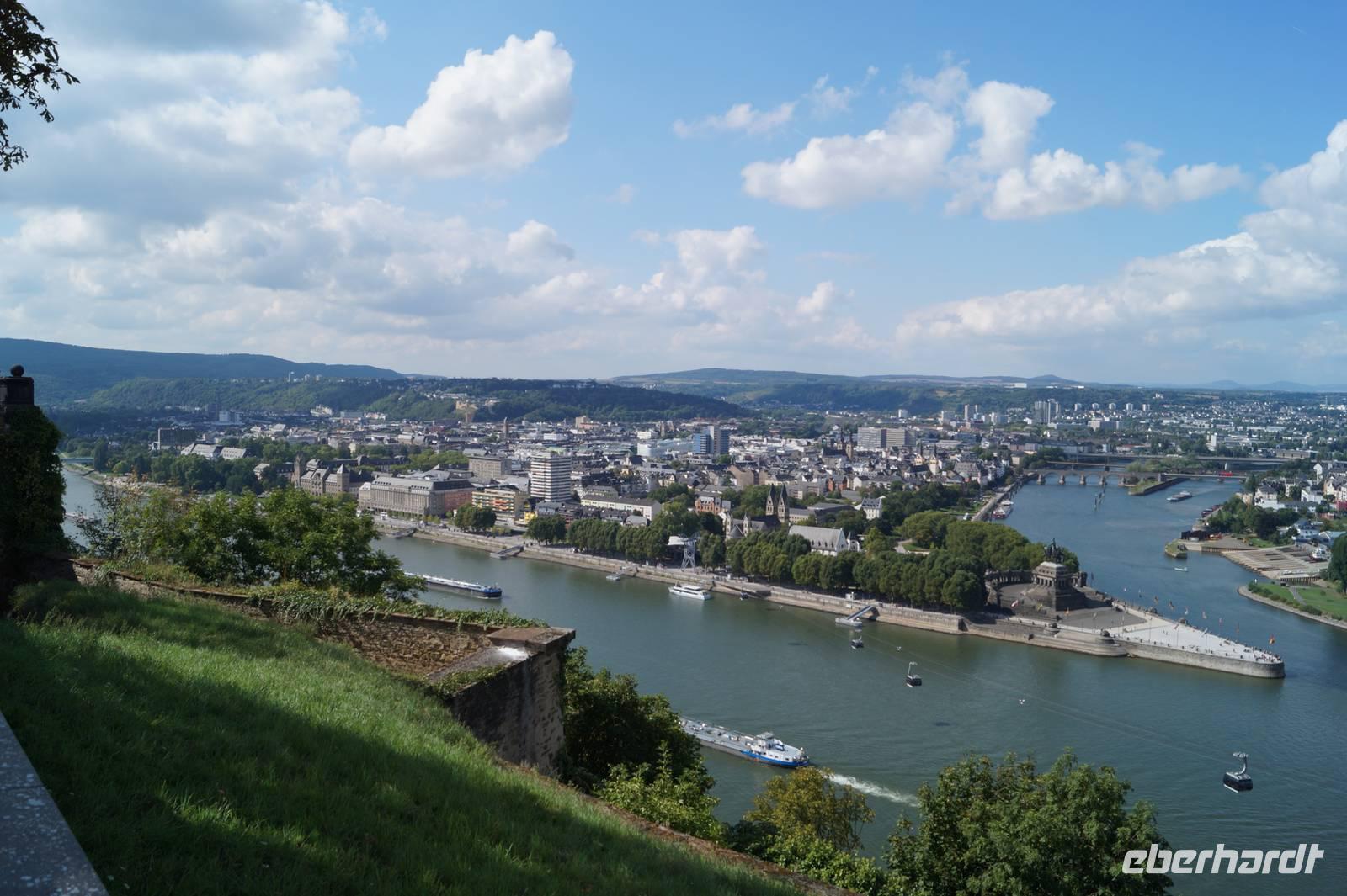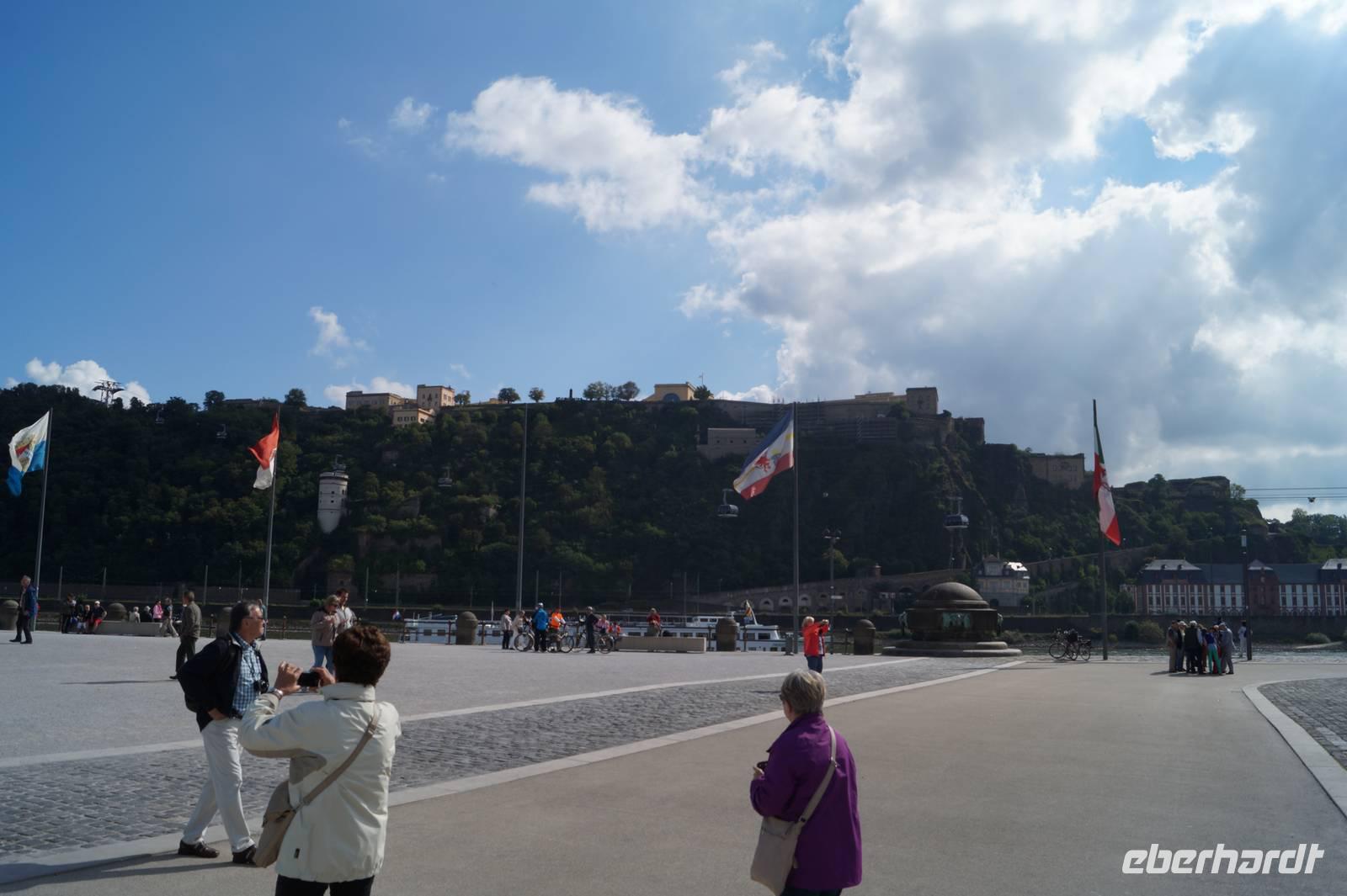 Im Anschluss an die Stadtführung fuhren wir - mindestens eine Mitfahrerin ihre Höhenangst überwindend - mit der Seilbahn hoch zur Festung Ehrenbreitstein. Nach der Mittagspause brachte uns Frieder nach Rüdesheim, wo wir Gelegenheit zum Stadtspaziergang und zu einem Besuch in der berühmten Drosselgasse hatten.