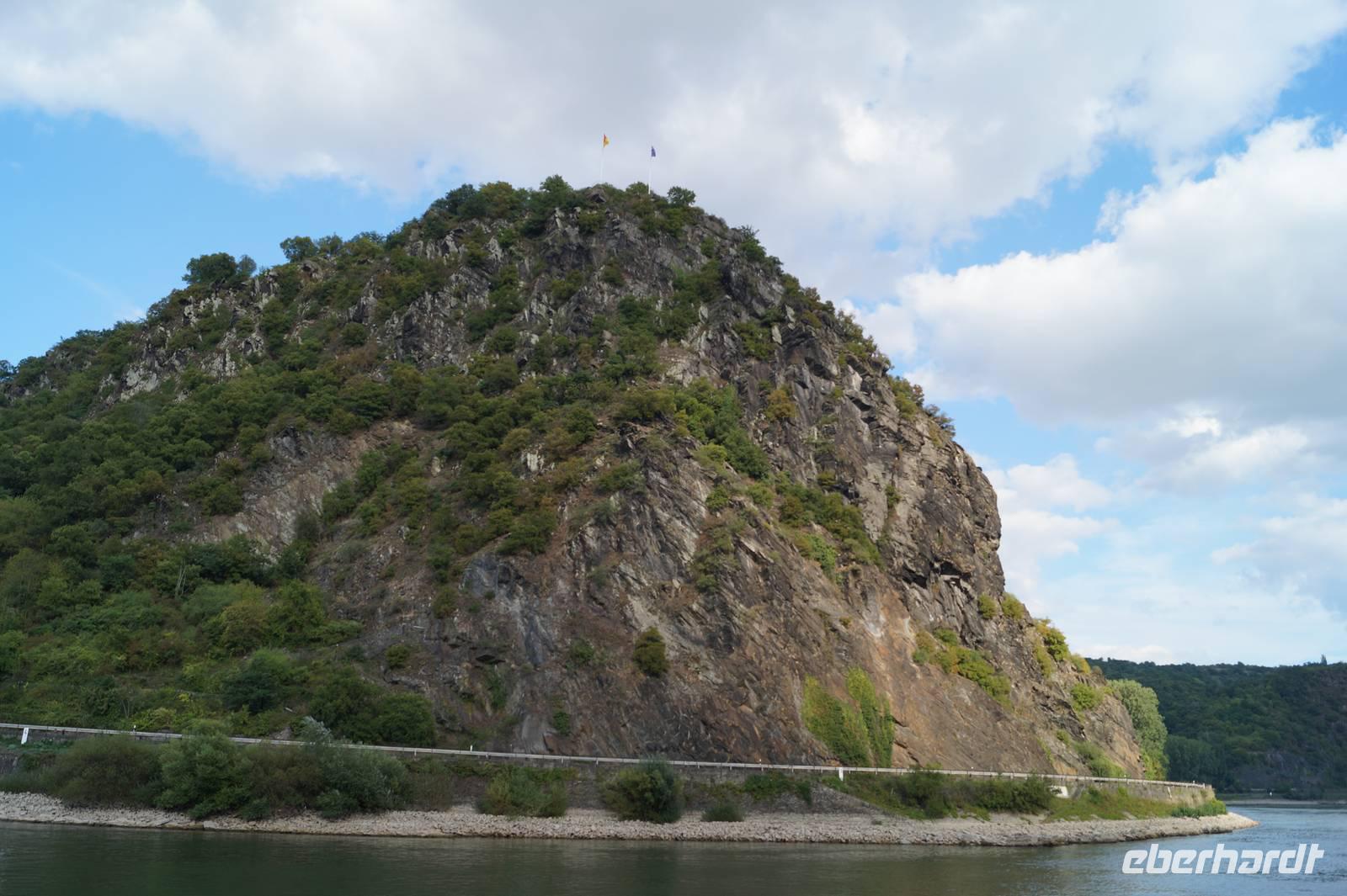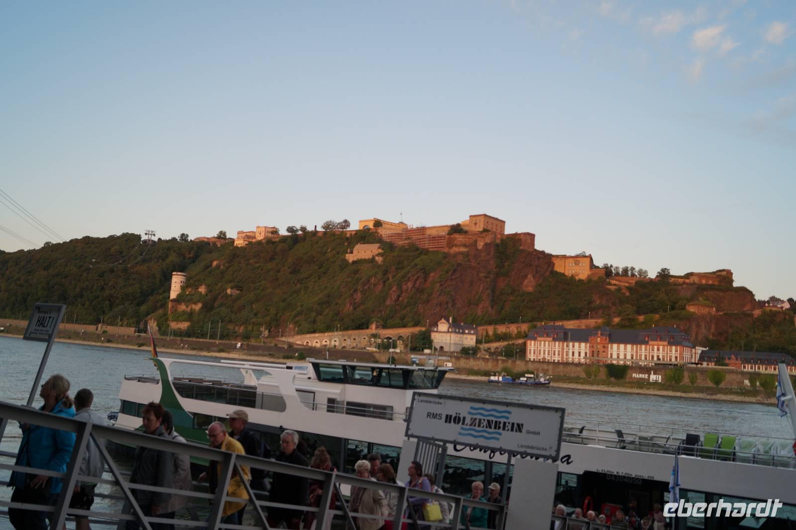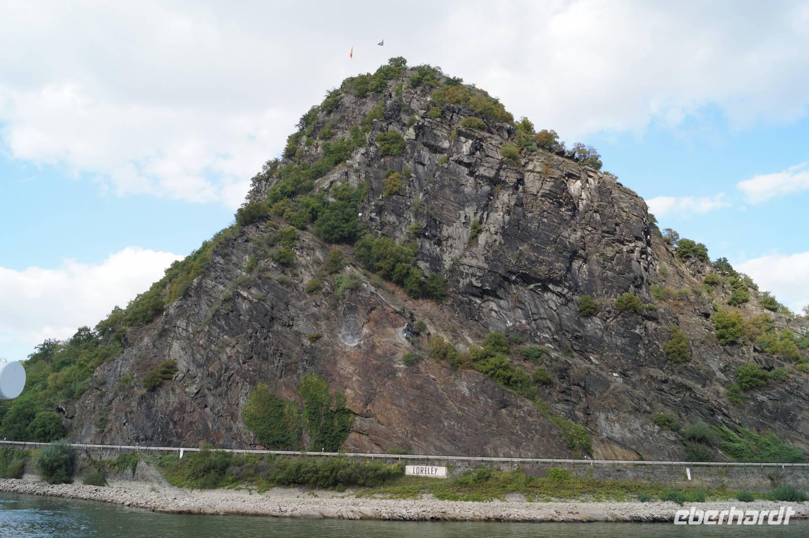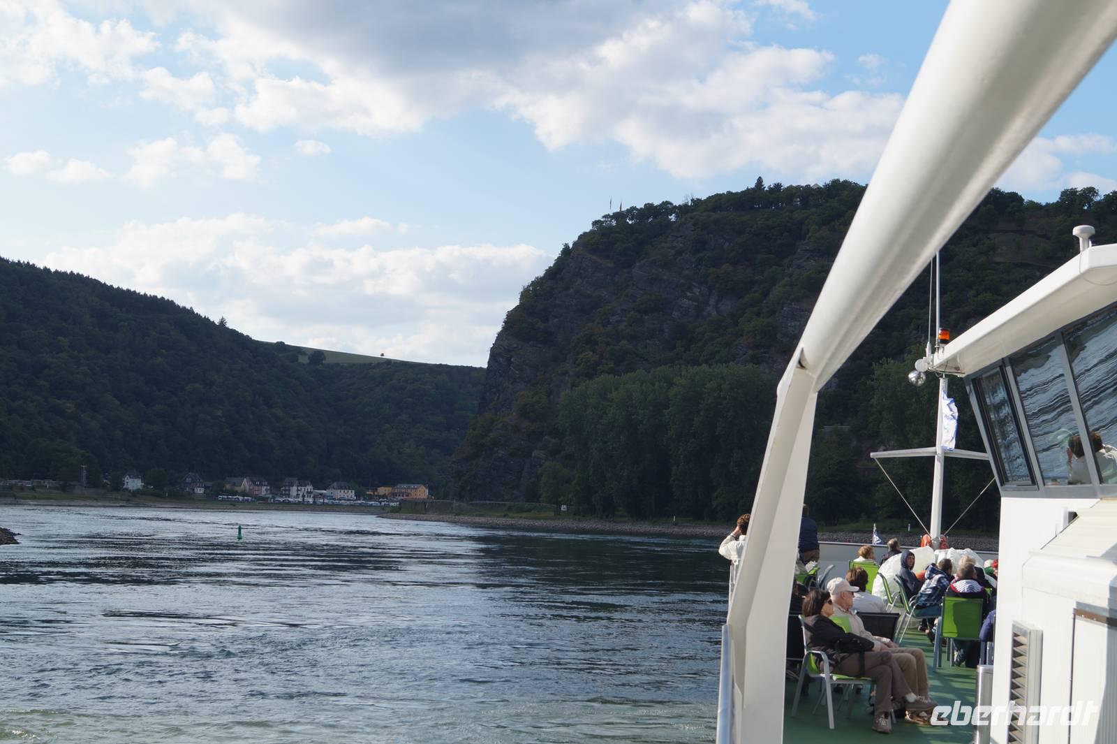 Mit dem Schiff ging es, vorbei an Zollburgen, Märchenschlössern, viele davon mit Hohenzollernfahnen versehen, mittelalterlichen Städtchen, Weinorten und dem berühmten Loreleyfelsen vorbei zurück nach Koblenz, wo uns Frieder wieder in Empfang nahm, um uns zurück ins Hotel zu bringen.