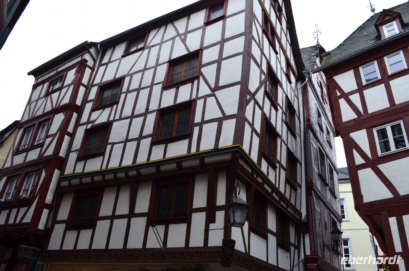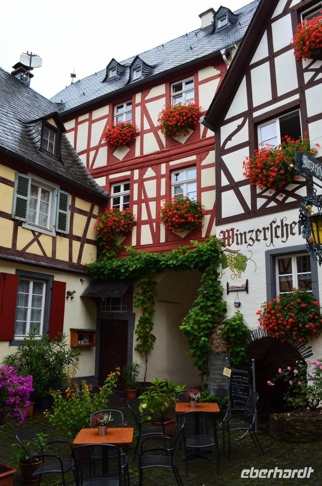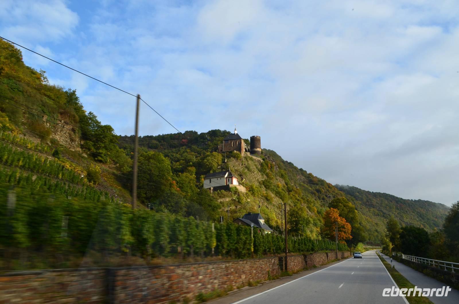 Weinberge des Tales. Auf der Weiterfahrt hinunter zum Fluss und entlang der „Untermosel" bis Brodenbach, erblickten wir auch die ersten Burgen und hübschen Fachwerkhäuser der Orte.