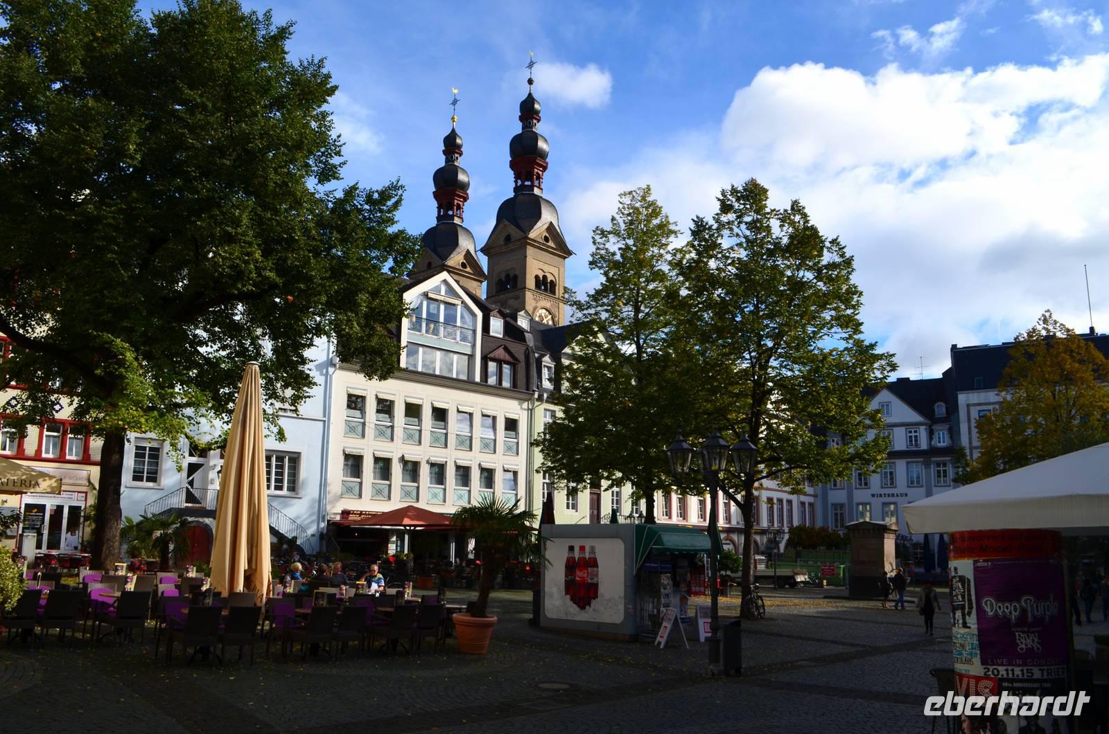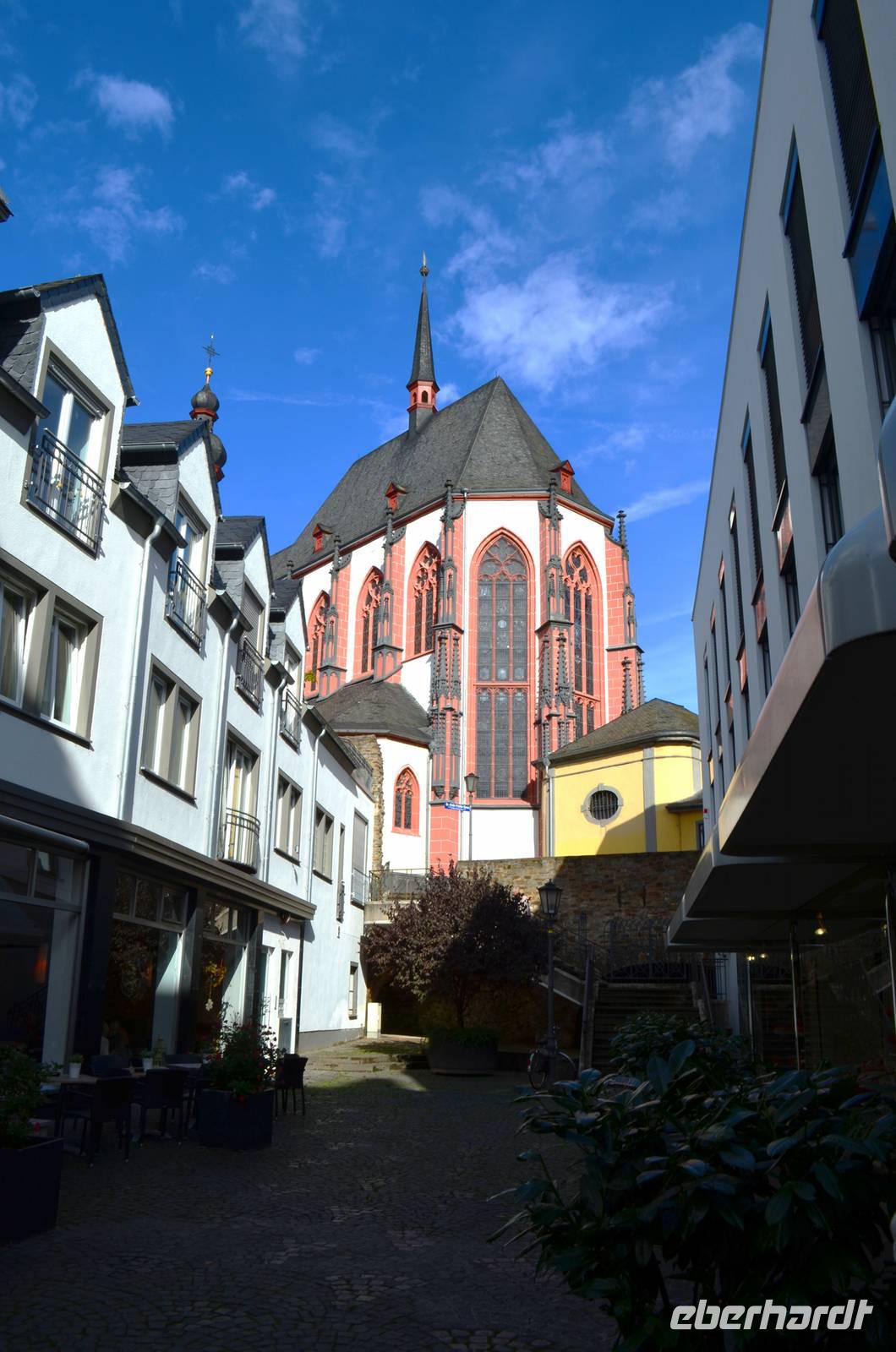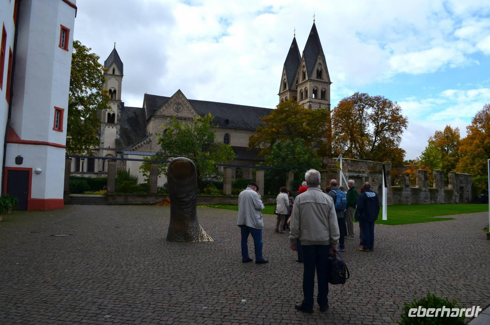 Hier begann unsere Stadtführung mit Frau Rosemarie Hünerfauth. Vom Deutschen Eck spazierten wir in die Innenstadt, vorbei an den Sehenswürdigkeiten der Stadt wie dem Klosterhof, der Basilika St. Kastor, dem Deutschherrenhaus, dem Münzplatz, dem Schnarrelbrunnen, den Vier Türmen, den Kunsthandwerkergassen und der Liebfrauenkirche und vielen mehr. Danach führte uns der gemeinsamer Fußweg wieder zurück zum Rheinufer und zur Seilbahnstation.