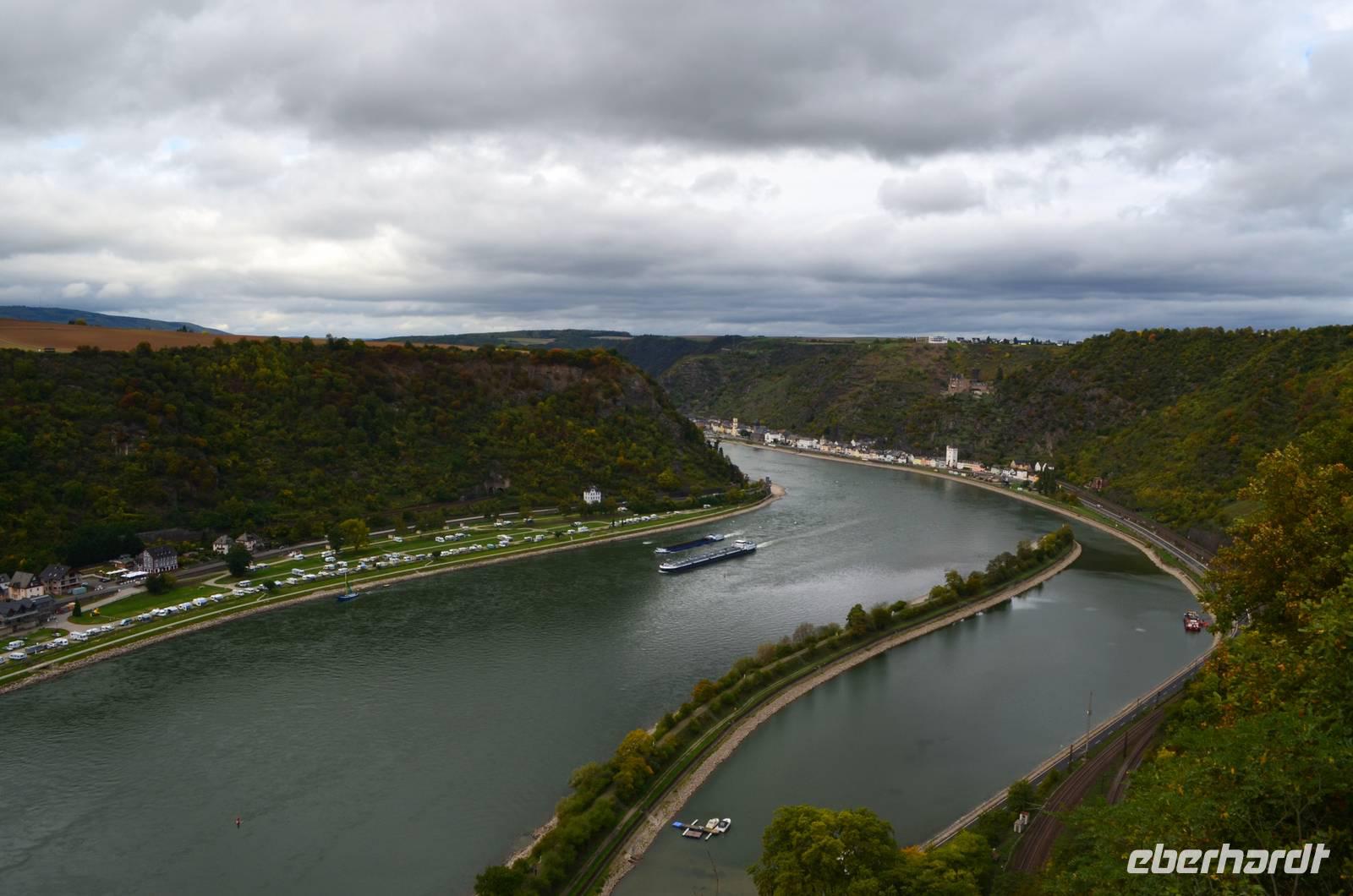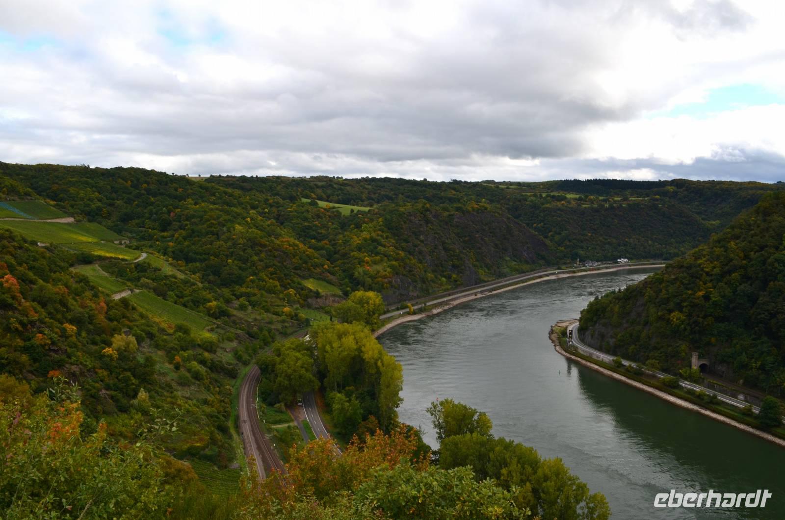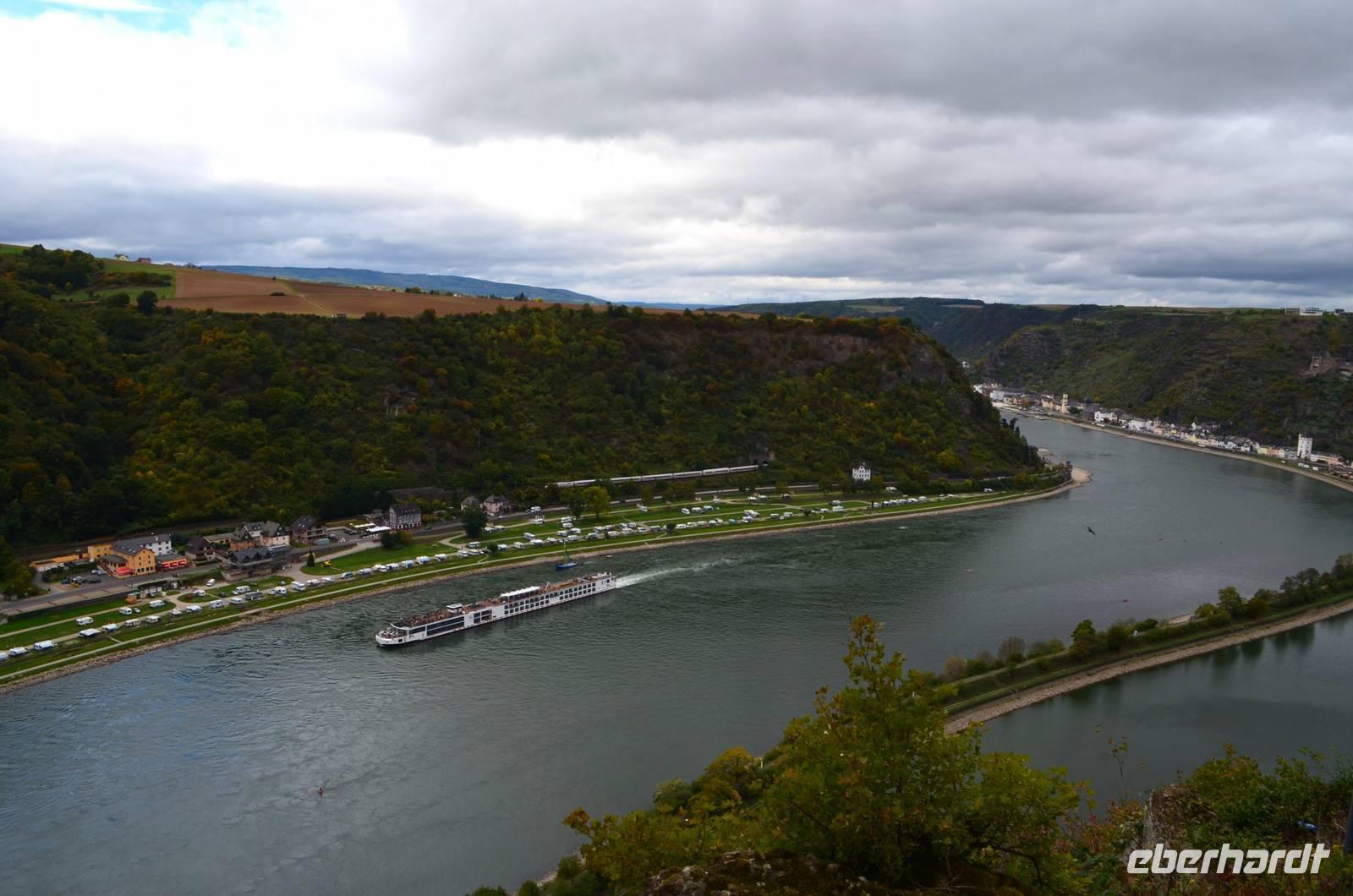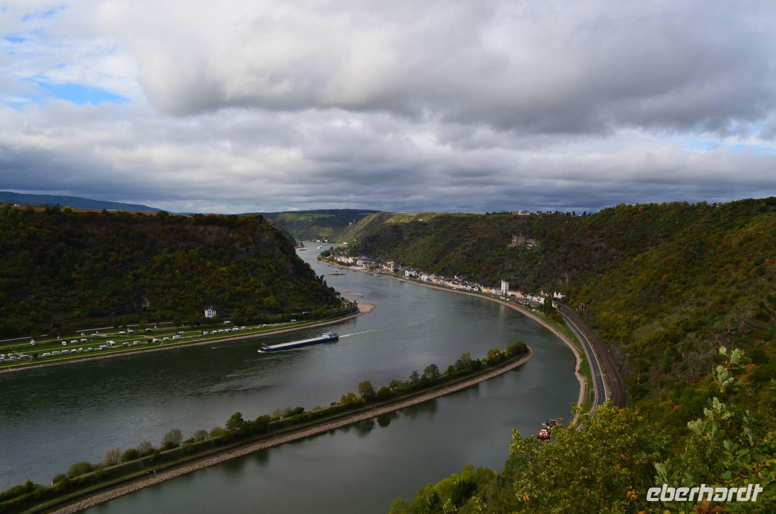 Nach der Talfahrt und dem Rückweg zum Bus fuhren wir am Rhein aufwärts Richtung St. Goarshausen und zur Auffahrt zum Loreleyfelsen. Den Loreleyfelsen wollten wir unbedingt besichtigen und die schönen Ausblicke ins Rheintal auf dem Rundweg erleben.
