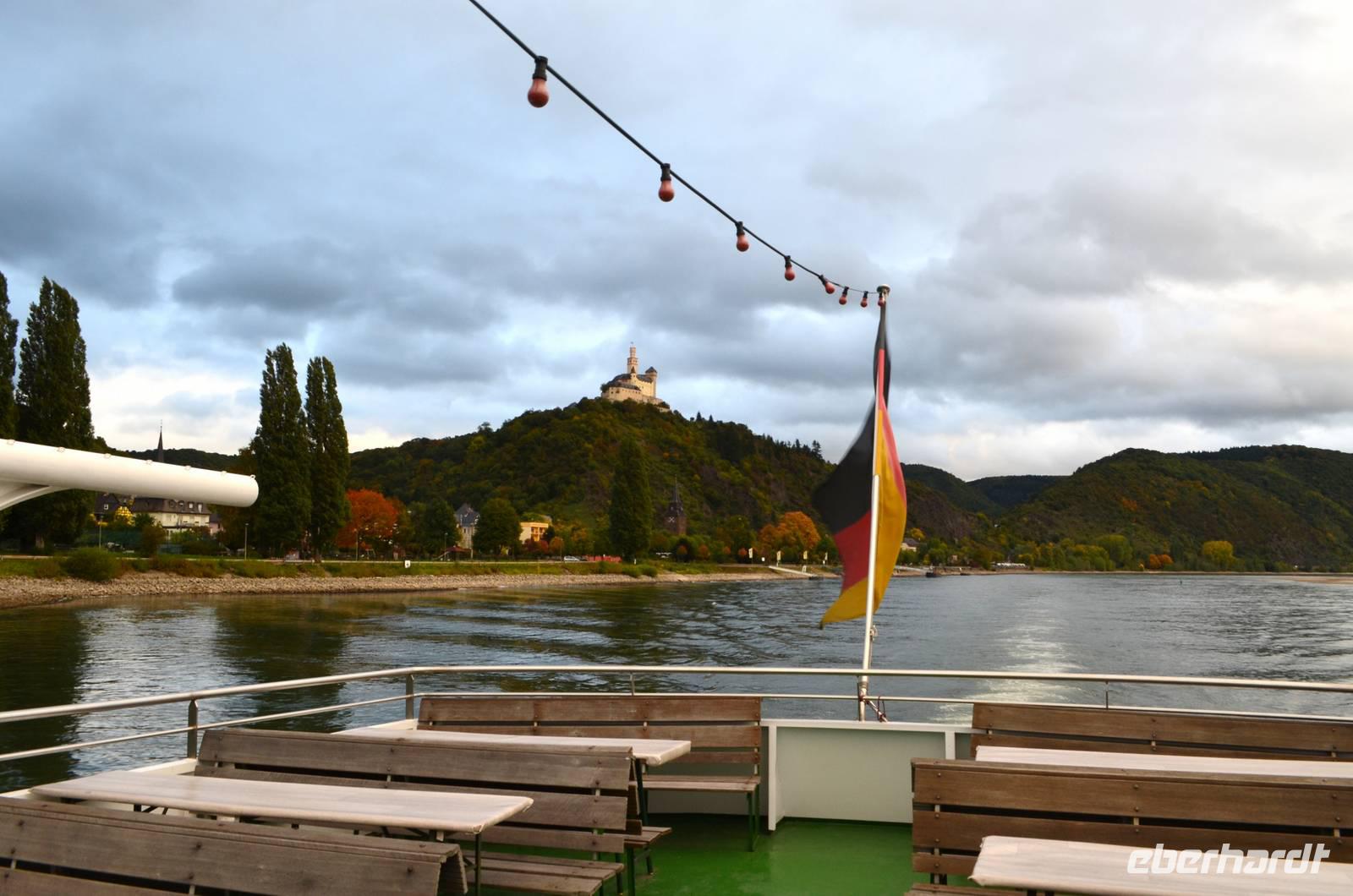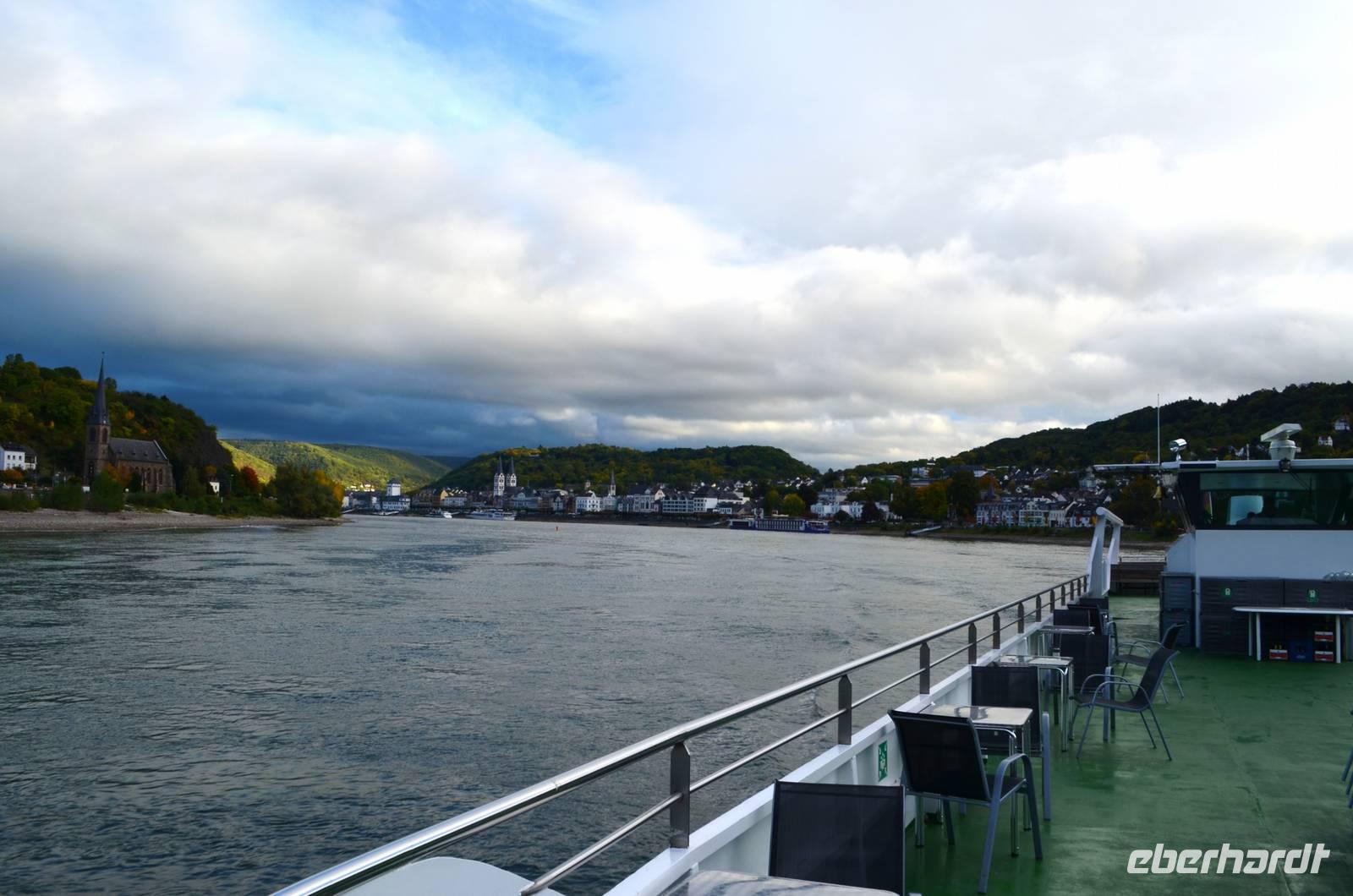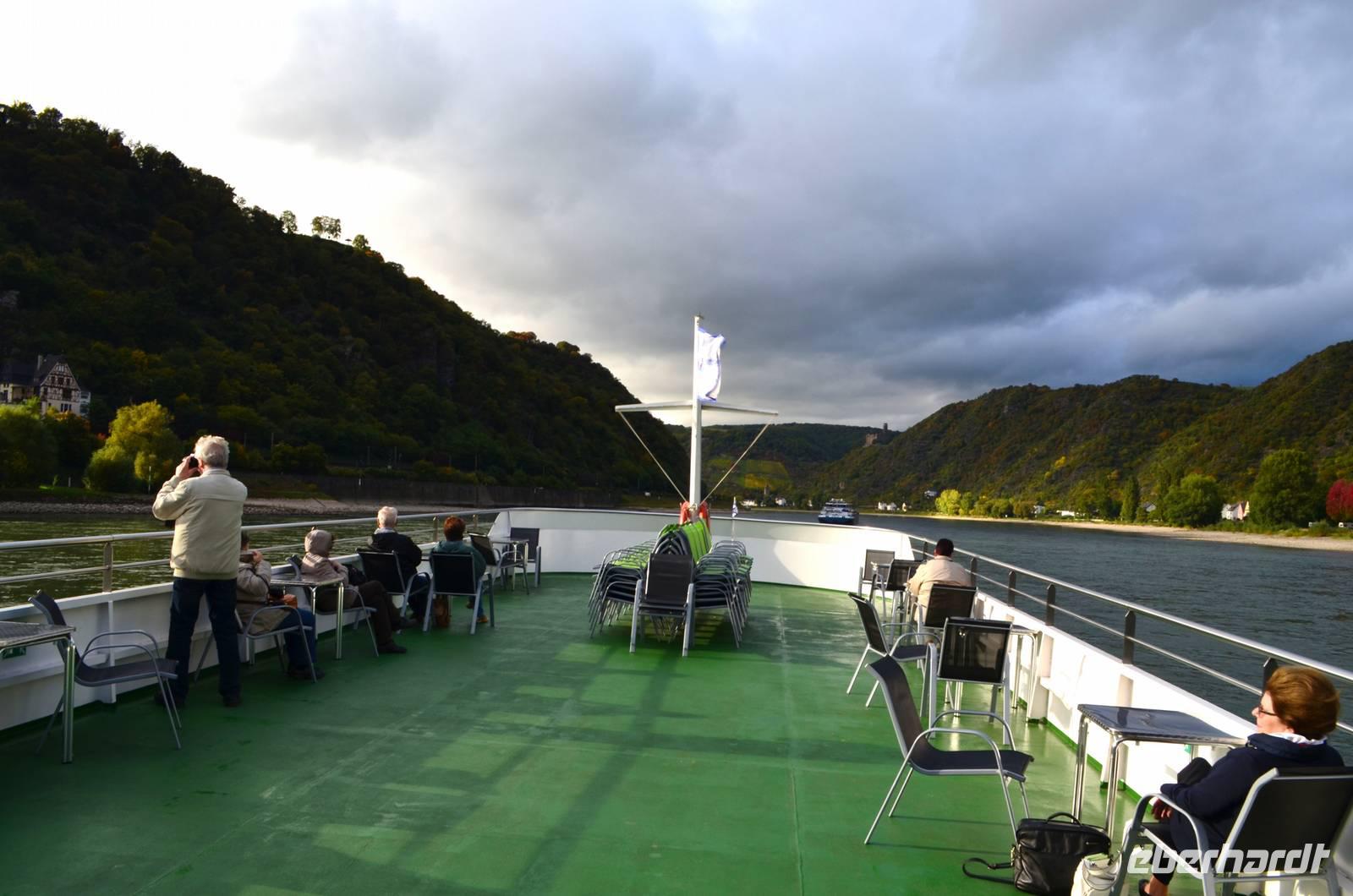 Vom Schiffsanleger in St. Goarshausen startete unsere Schifffahrt in der Abendsonne zurück nach Koblenz. Dabei zeigten sich uns der Fluss, seine Talhänge mit den Weinbergen und Burgen in besonders schönem Licht.