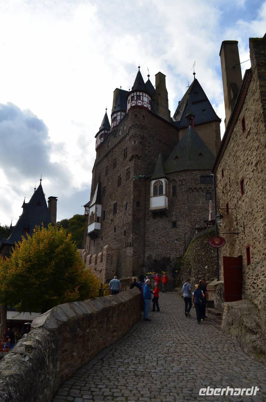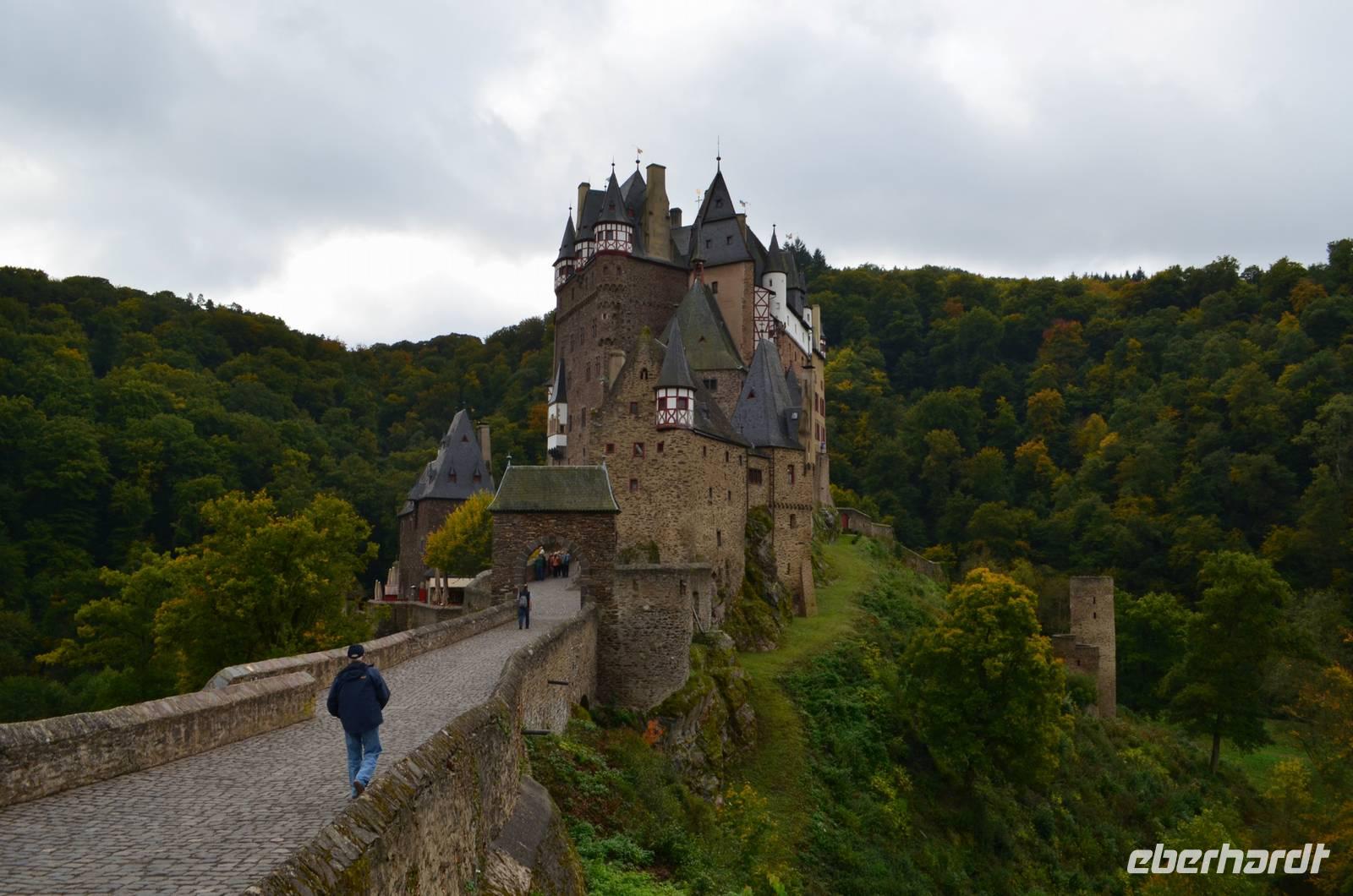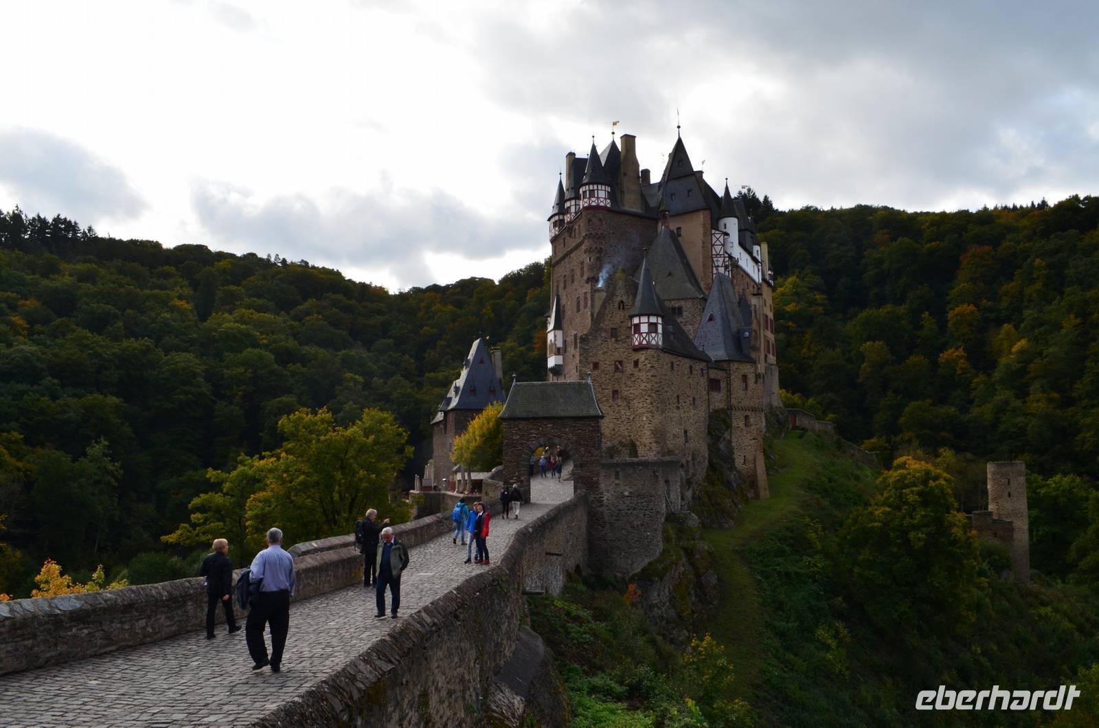 Gegenüber den Hochplateaus der Eifel, liegt die Burg ganz versteckt im Tal des Eltzbaches. Vom Parkplatz aus kann man nur den Fußweg oder den Shuttlebus nutzen. Ebenso beim Rückweg. Als kleines Eberhardt-Wow war die Fahrt kostenfrei.