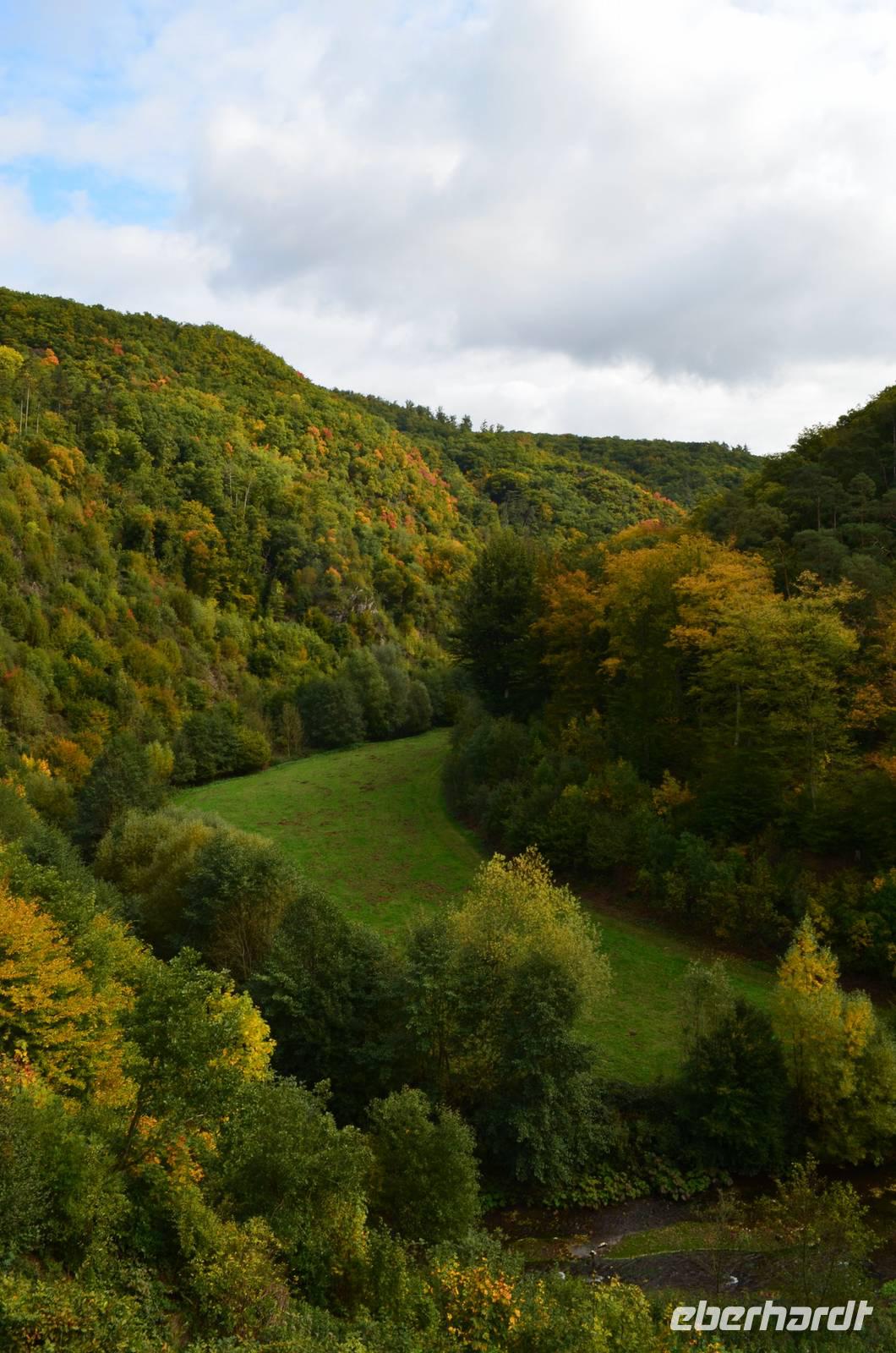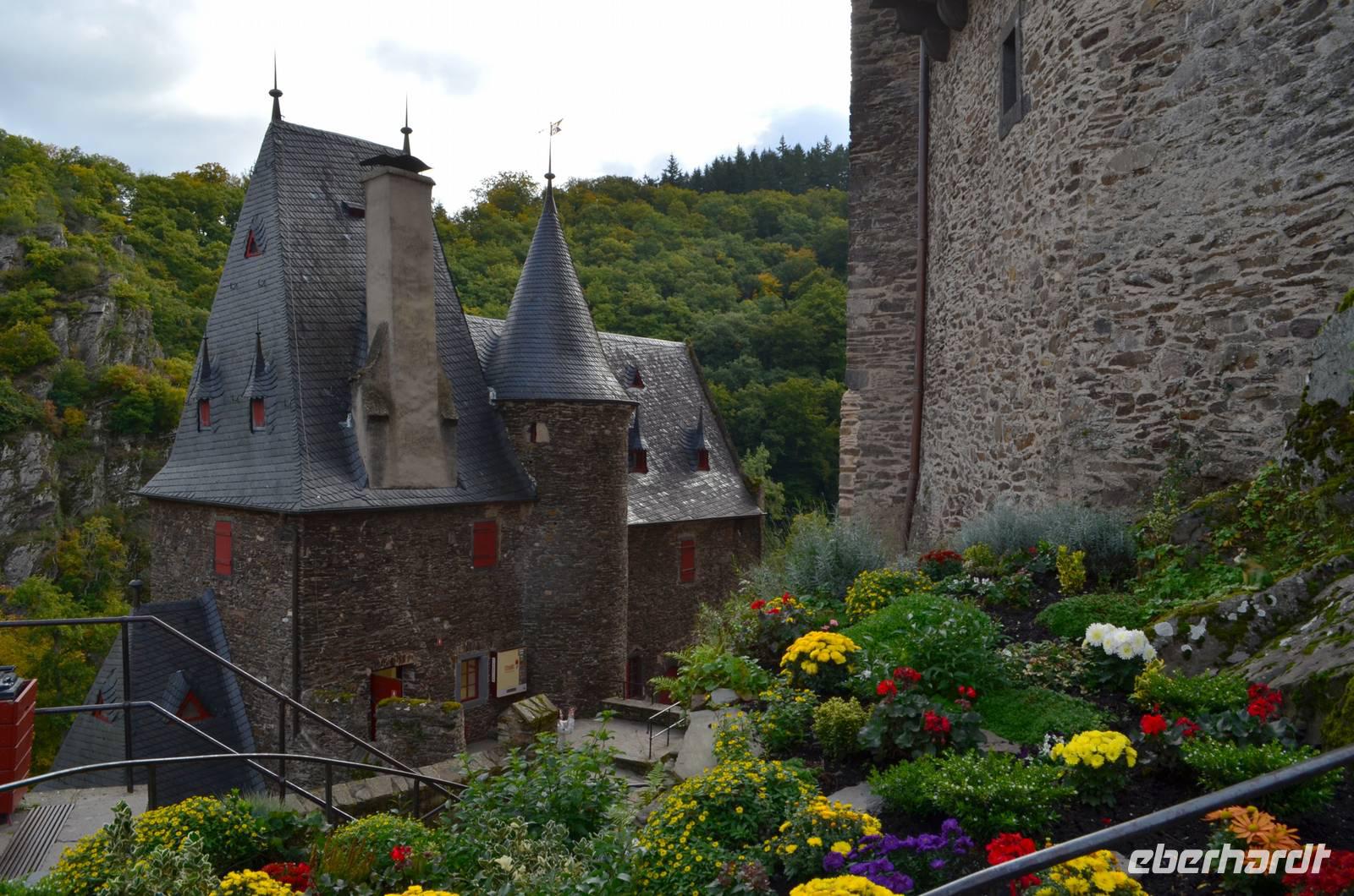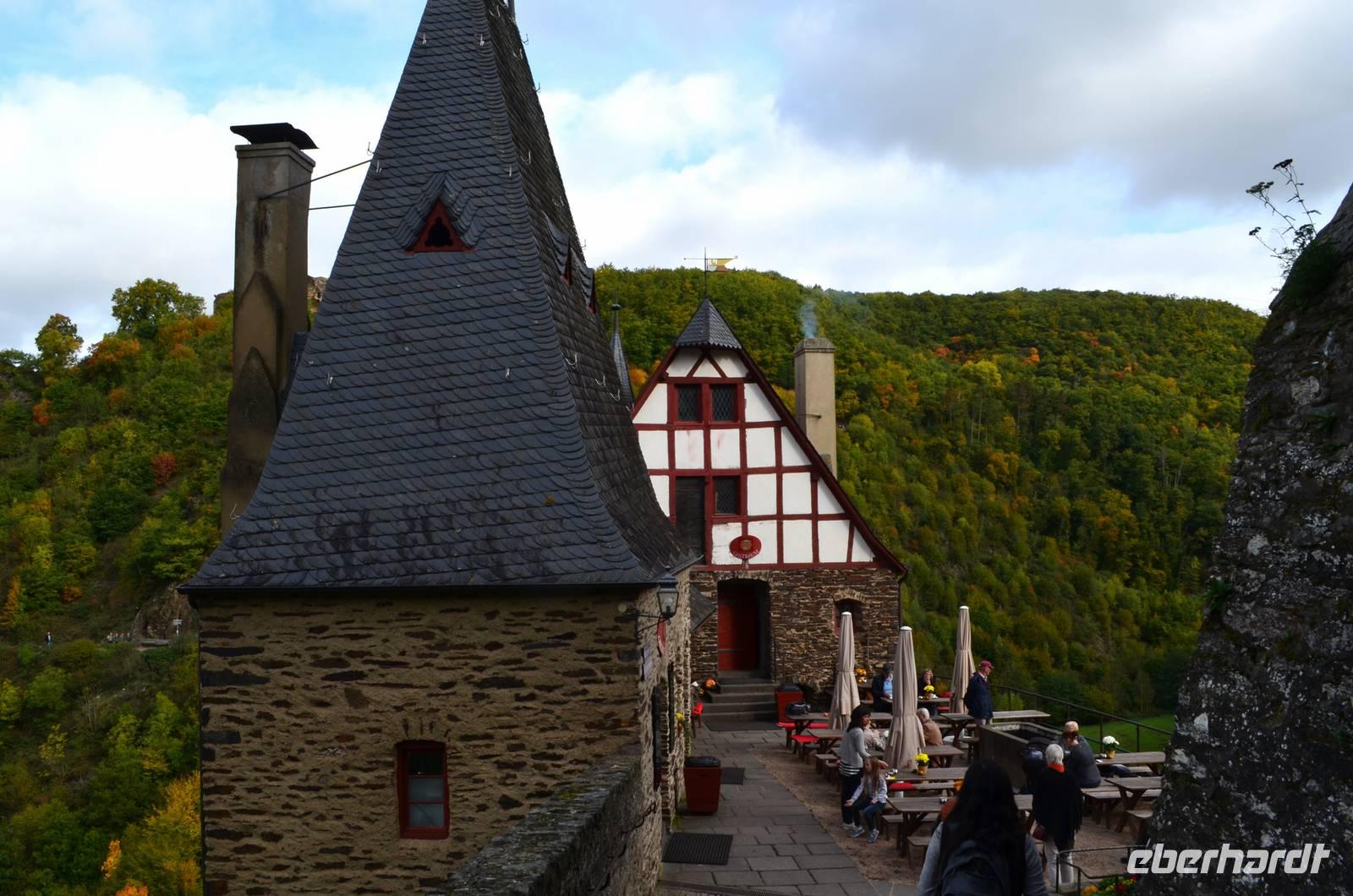 Gegenüber den Hochplateaus der Eifel, liegt die Burg ganz versteckt im Tal des Eltzbaches. Vom Parkplatz aus kann man nur den Fußweg oder den Shuttlebus nutzen. Ebenso beim Rückweg. Als kleines Eberhardt-Wow war die Fahrt kostenfrei.