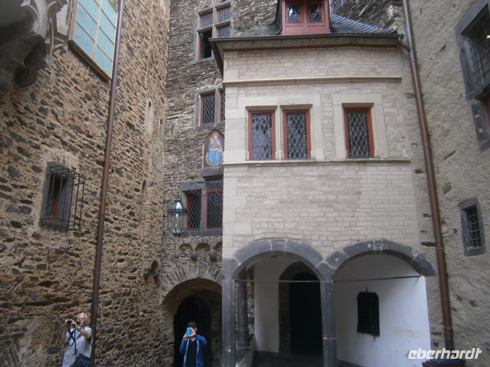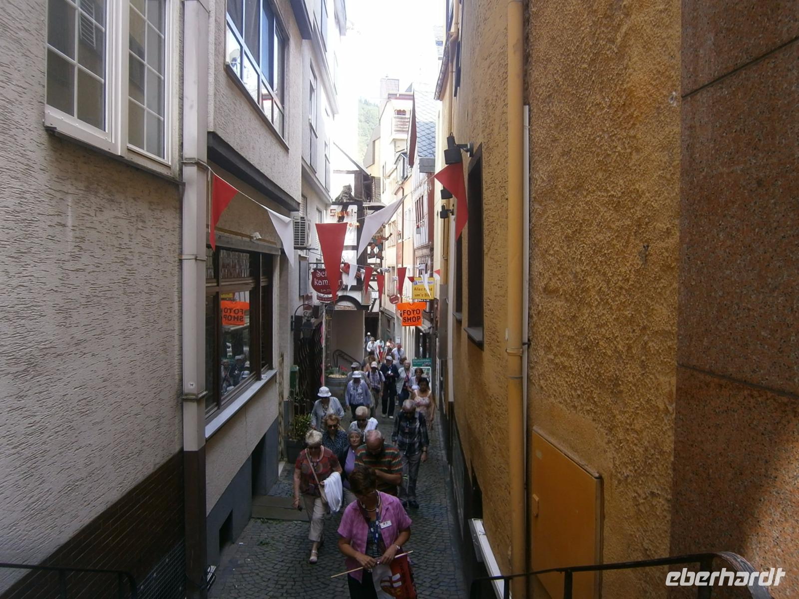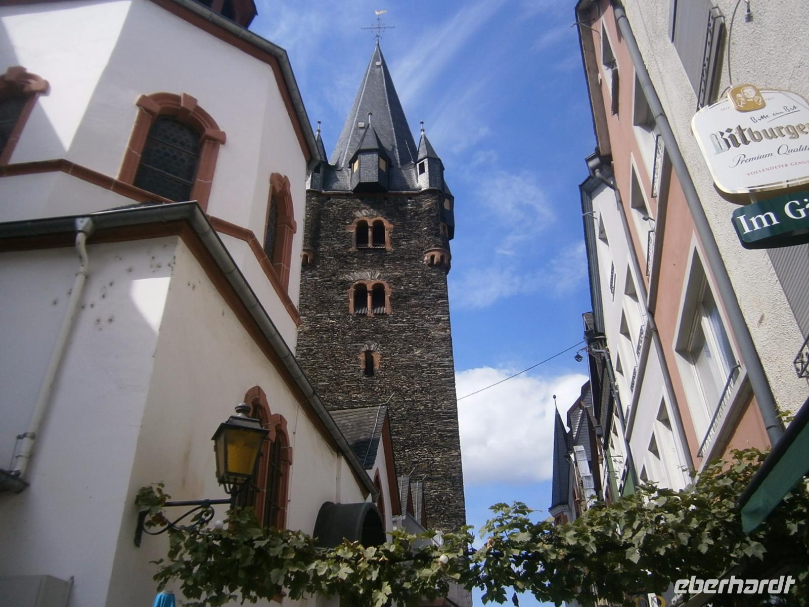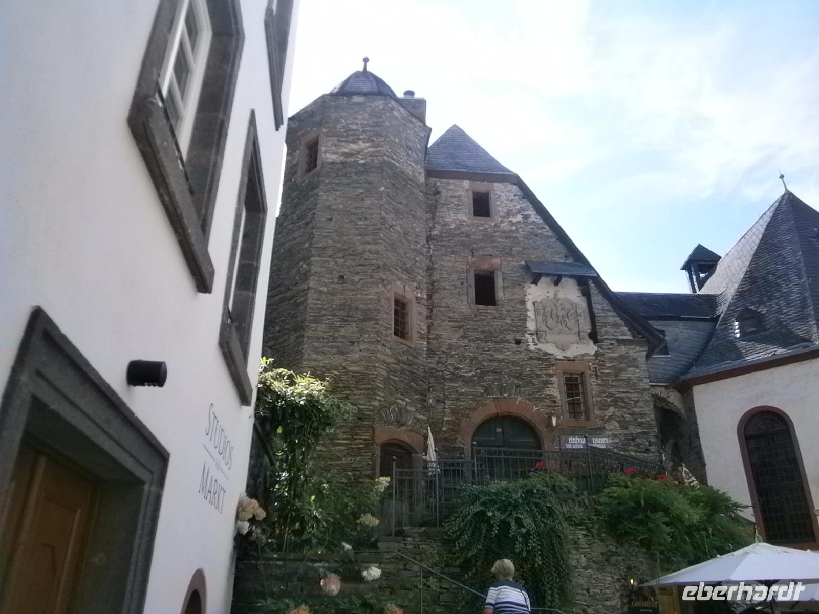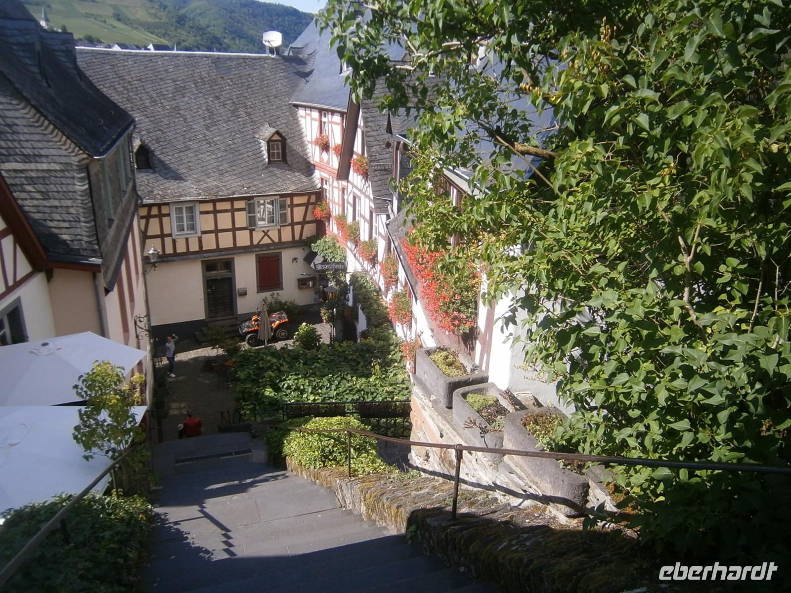 An einem anderen Tag besuchten wir das malerische Beilstein. Dieser Ort, gelegen in einem engen Talkessel mit steilen Rebhängen, wurde schon sehr oft als Kulisse für Filmproduktionen genutzt. Auch ist es eine Gemeinde mit einer ungebrochenen jüdischen Kultur. Davon zeugen eine alte Judenschule, eine mittelalterische Synagoge und ein jüdischer Friedhof. Eine Klostertreppe führt hinauf zur Klosterkirche der Karmeliter, die im Innern eine „Schwarze Madonna" und eine Königorgel besitzt. Beilstein wird noch überragt von der Ruine der Burg Metternich, zu der ein fünfeckiger Bergfried gehört.