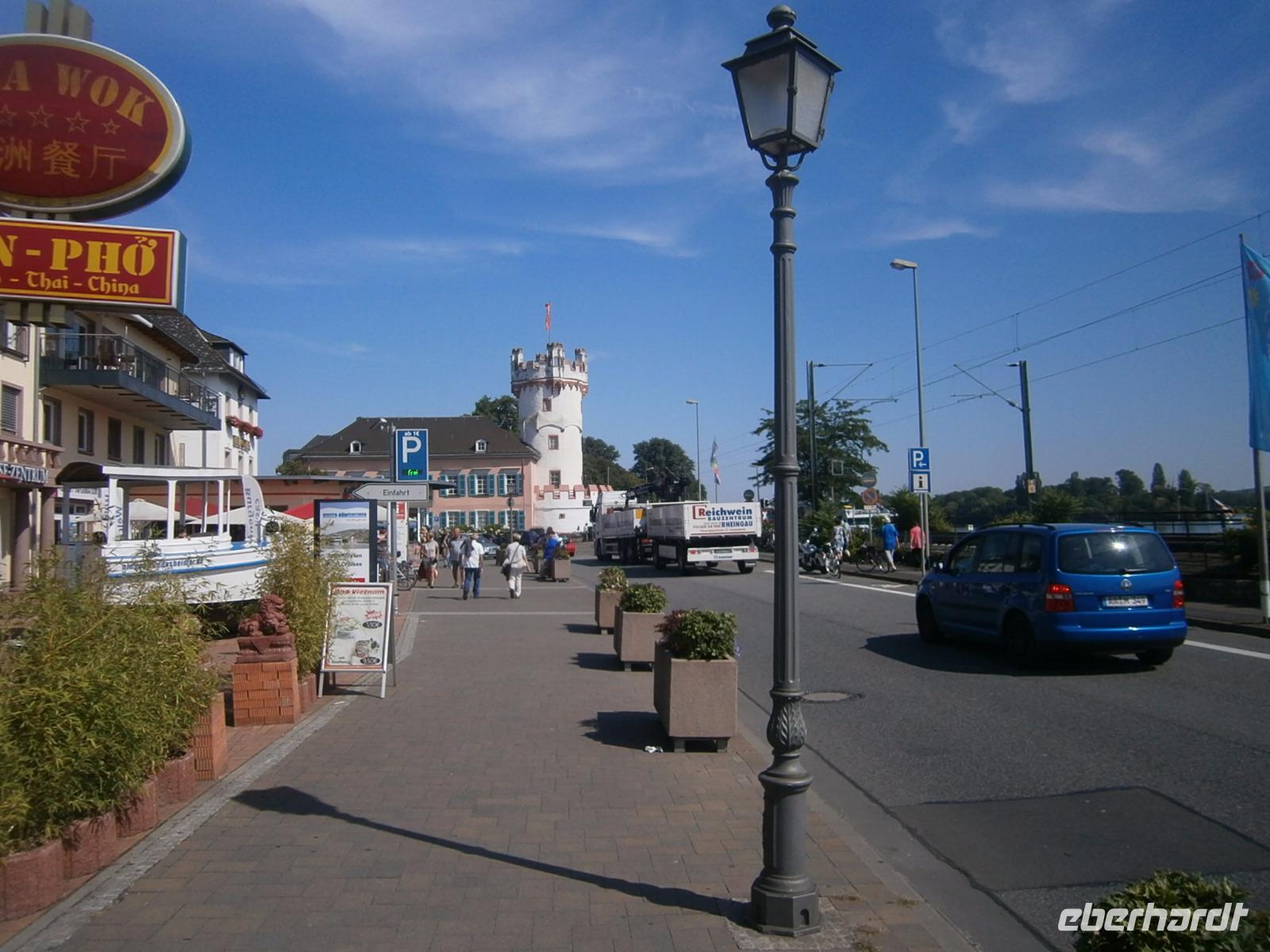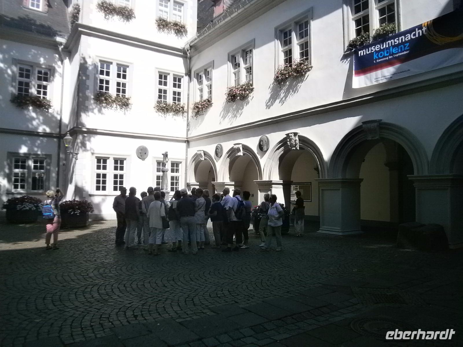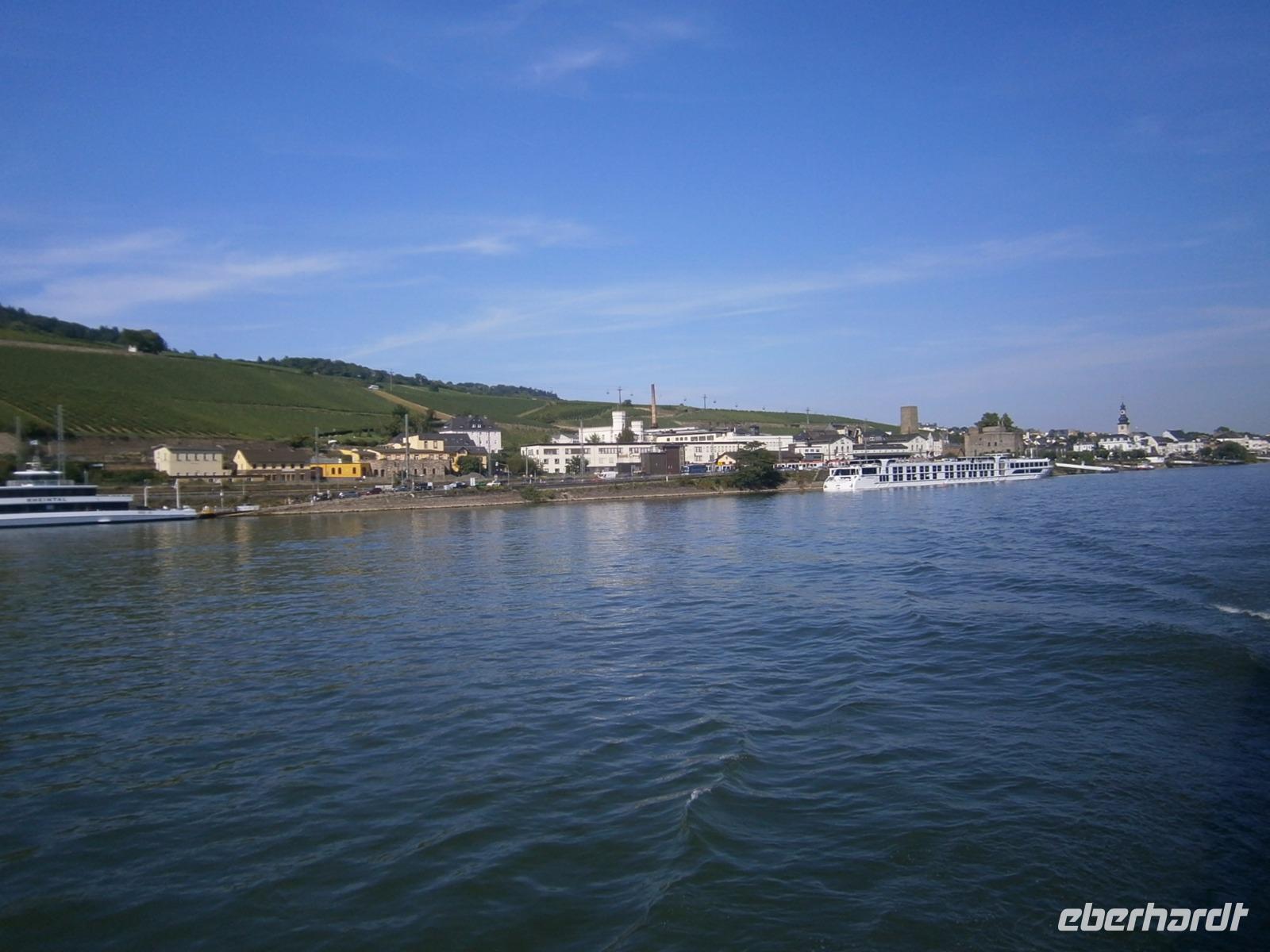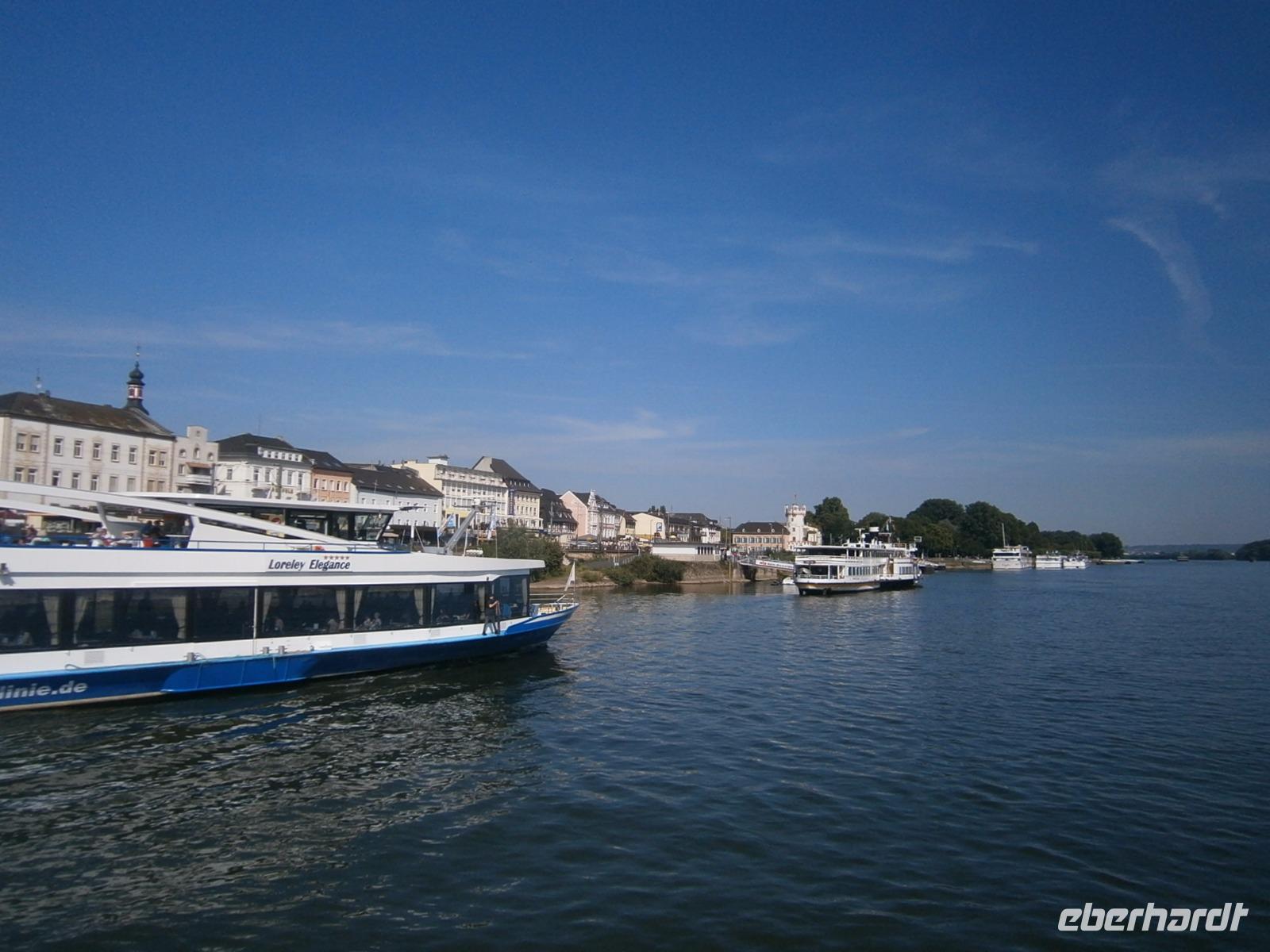 Von Rüdesheim ging es dann mit einem Fahrgastschiff der Reederei Hölzenbein rheinabwärts nach Koblenz. Bei der etwa dreieinhalb stündigen Fahrt konnten sich unsere Gäste von der Schönheit des „Mittleren Rheintals", welches zum Kulturerbe der UNESCO zählt, überzeugen. Vorbei am „Binger Mäuseturm", der alten ehemaligen Zollstation „Pfalz", Oberwesel mit den „Sieben Jungfrauen", verschiedenen Rheininseln, Werth genannt, der Loreley, St.Goar, St.Goarshausen und Boppard schipperten wir nach Koblenz. Begleitet wurde die Fahrt auch von vielen , oberhalb beider Ufer thronenden Burgen und Burgruinen mit solchen bekannten Namen, wie: Rheinstein, Ehrenfels, Rheinfels, die Burgen Katz und Maus, die Marksburg u.a.;