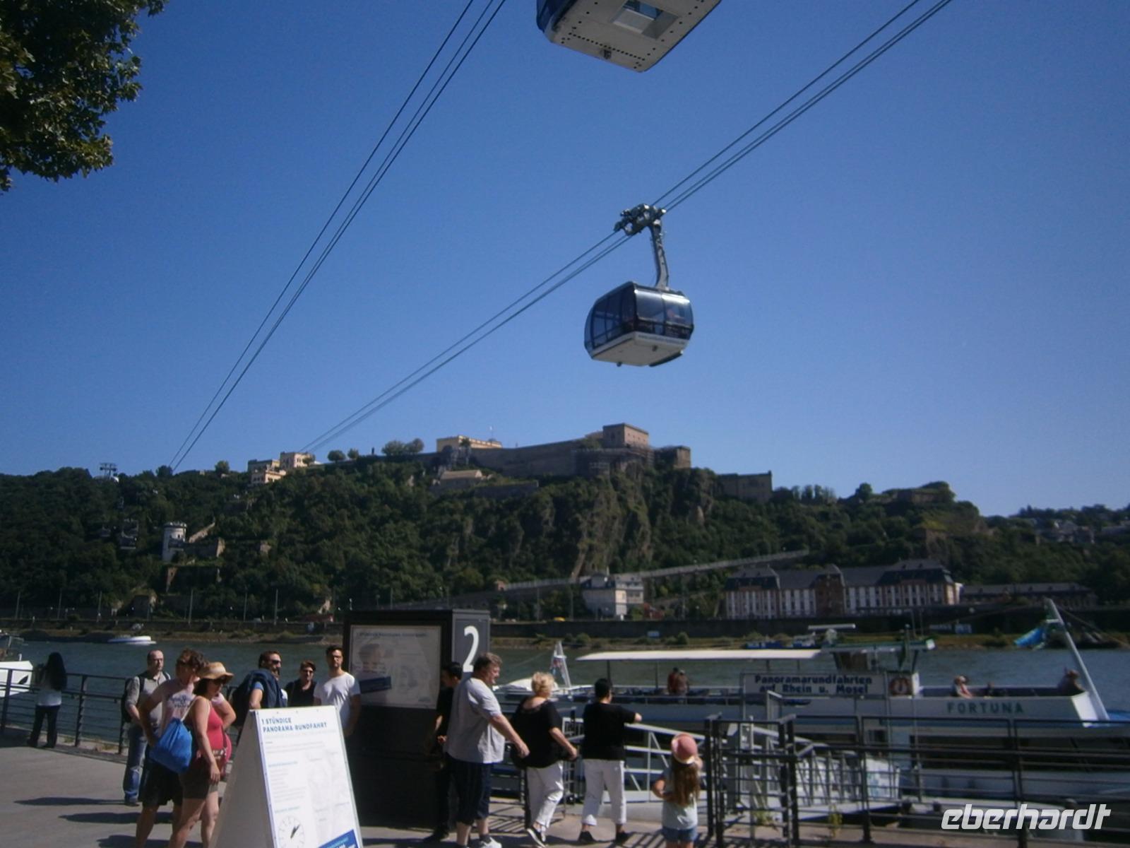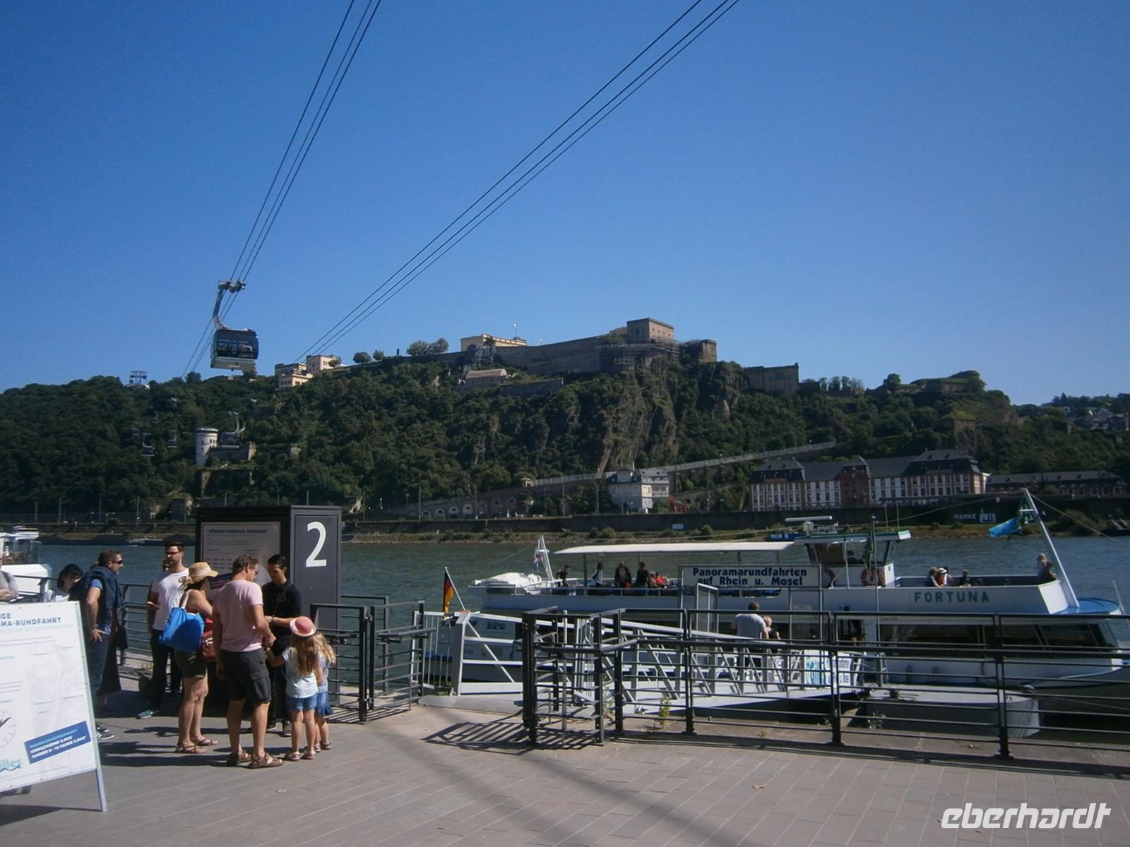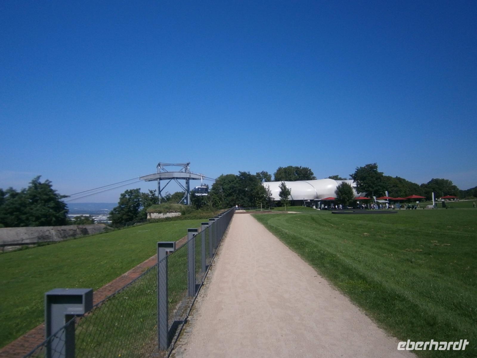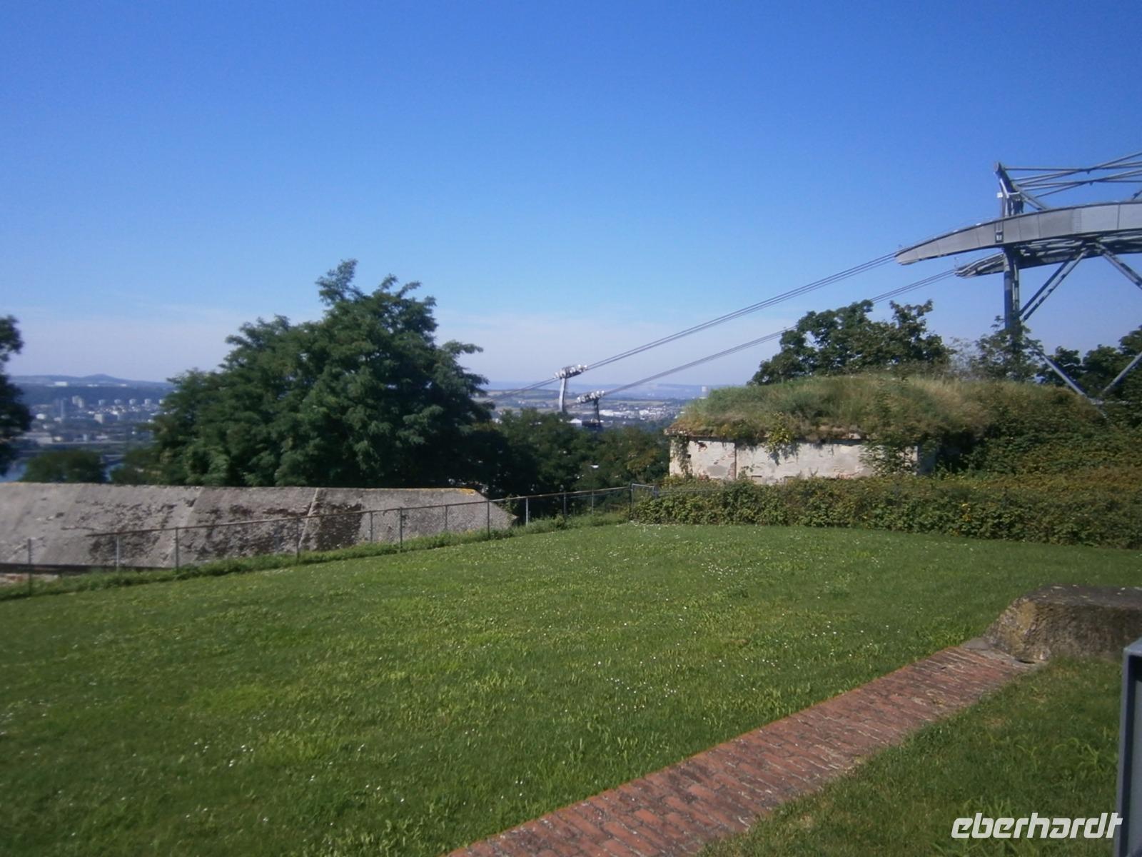 Mit der zur „Buga" eingeweihten Kabinenseilbahn schwebten wir über dem Rhein zu dieser Sehenswürdigkeit. Oben erwartet den Besucher ein großes Hochplateau, welches früher ein Truppenübungsplatz gewesen war. Anläßlich der „Buga" wurde er umgestaltet und mit Spazierwegen und Aussichtspunkt versehen. Auf dieser Ebene befindet sich auch der Haupteingang in die Festung, die 1817 von Preußen zu einer wehrhaften Feste ausgebaut wurde.